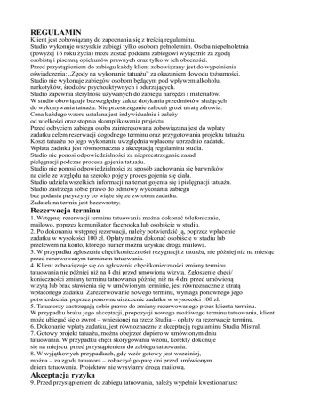 REGULAMIN Klient jest zobowiązany do zapoznania się z treścią regulaminu. Studio wykonuje wszystkie zabiegi tylko osobom pełnoletnim. Osoba niepełnoletnia (powyżej 16 roku życia) może zostać poddana zabiegowi wyłącznie za zgodą osobistą i pisemną opiekunów prawnych oraz tylko w ich obecności. Przed przystąpieniem do zabiegu każdy klient zobowiązany jest do wypełnienia oświadczenia: „Zgody na wykonanie tatuażu” za okazaniem dowodu tożsamości. Studio nie wykonuje zabiegów osobom będącym pod wpływem alkoholu, narkotyków, środków psychoaktywnych i odurzających. Studio zapewnia sterylność używanych do zabiegu narzędzi i materiałów. W studio obowiązuje bezwzględny zakaz dotykania przedmiotów służących do wykonywania tatuażu. Nie przestrzeganie zaleceń grozi utratą zdrowia. Cena każdego wzoru ustalana jest indywidualnie i zależy od wielkości oraz stopnia skomplikowania projektu. Przed odbyciem zabiegu osoba zainteresowana zobowiązana jest do wpłaty zadatku celem rezerwacji dogodnego terminu oraz przygotowania projektu tatuażu. Koszt tatuażu po jego wykonaniu uwzględnia wpłacony uprzednio zadatek. Wpłata zadatku jest równoznaczna z akceptacją regulaminu studia. Studio nie ponosi odpowiedzialności za nieprzestrzeganie zasad pielęgnacji podczas procesu gojenia tatuażu. Studio nie ponosi odpowiedzialności za sposób zachowania się barwników na ciele ze względu na szeroko pojęty proces gojenia się ciała. Studio udziela wszelkich informacji na temat gojenia się i pielęgnacji tatuażu. Studio zastrzega sobie prawo do odmowy wykonania zabiegu bez podania przyczyny co wiąże się ze zwrotem zadatku. Zadatek na termin jest bezzwrotny. Rezerwacja terminu 1. Wstępnej rezerwacji terminu tatuowania można dokonać telefonicznie, mailowo, poprzez komunikator facebooka lub osobiście w studiu. 2. Po dokonaniu wstępnej rezerwacji, należy potwierdzić ją, poprzez wpłacenie zadatku w wysokości 100 zł. Opłaty można dokonać osobiście w studiu lub przelewem na konto, którego numer można uzyskać drogą mailową. 3. W przypadku zgłoszenia chęci/konieczności rezygnacji z tatuażu, nie później niż na miesiąc przed rezerwowanym terminem tatuowania. 4. Klient zobowiązuje się do zgłoszenia chęci/konieczności zmiany terminu tatuowania nie później niż na 4 dni przed umówioną wizytą. Zgłoszenie chęci/ konieczności zmiany terminu tatuowania później niż na 4 dni przed umówioną wizytą lub brak stawienia się w umówionym terminie, jest równoznaczne z utratą wpłaconego zadatku. Zarezerwowanie nowego terminu, wymaga ponownego jego potwierdzenia, poprzez ponowne uiszczenie zadatku w wysokości 100 zł. 5. Tatuatorzy zastrzegają sobie prawo do zmiany rezerwowanego przez klienta terminu. W przypadku braku jego akceptacji, propozycji nowego możliwego terminu tatuowania, klient może ubiegać się o zwrot – wniesionej na rzecz Studia – opłaty za rezerwacje terminu. 6. Dokonanie wpłaty zadatku, jest równoznaczne z akceptacją regulaminu Studia Mistral. 7. Gotowy projekt tatuażu, można obejrzeć dopiero w umówionym dniu tatuowania. W przypadku chęci skorygowania wzoru, korekty dokonuje się na miejscu, przed przystąpieniem do zabiegu tatuowania. 8. W wyjątkowych przypadkach, gdy wzór gotowy jest wcześniej, można – za zgodą tatuatora – zobaczyć go parę dni przed umówionym dniem tatuowania. Projektów nie wysyłamy drogą mailową. Akceptacja ryzyka 9. Przed przystąpieniem do zabiegu tatuowania, należy wypełnić kwestionariusz zdrowotny; zapoznać się z ostrzeżeniem dotyczącym powikłań pozabiegowych, będących skutkiem nieprzestrzegania zasad pielęgnacji lub nieświadomości posiadanych chorób lub alergii i podpisać oświadczenie o akceptacji ryzyka. 10. Osoby niepełnoletnie (powyżej 16-stego roku życia) mogą wykonać sobie tatuaż tylko w obecności rodzica lub prawnego opiekuna, który wypełnił formularz zgody. Podczas zabiegu tatuowania 11. Osoba poddająca się zabiegowi nie może być pod wpływem alkoholu, narkotyków ani żadnych innych środków odurzających. 12. Osoby poddające się tatuowaniu muszą bezwzględnie stosować się do ogólnych zasad sanitarnych obowiązujących w pomieszczeniu zabiegowym. W pomieszczeniu zabiegowym obowiązuje: a. zakaz spożywania posiłków i alkoholu; b. zakaz przebywania osób trzecich bez zgody tatuatora; c. zakaz palenia wyrobów tytoniowych; Zalecenia końcowe 13. Po wykonaniu zabiegu należy przestrzegać zasad pielęgnacji tatuażu, o których informuje tatuator. Dostępne są również na stronie internetowej w dziale pielęgnacja. 14. W razie jakichkolwiek wątpliwości co do sposobu gojenia się tatuażu, należy kontaktować się z nami osobiście, telefonicznie lub droga mailową. Dane kontaktowe dostępne są na stronie internetowej w dziale kontakt. 15. Po całkowitym zagojeniu się tatuażu zalecane jest stawienie się w studiu, celem kontroli. 16. Studio zastrzega sobie prawa autorskie do wykonanych zdjęć i prac
