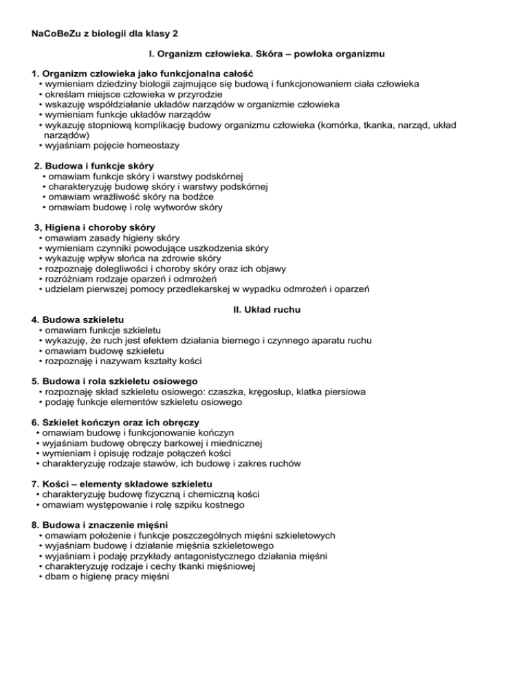 NaCoBeZu z biologii dla klasy 2 I. Organizm człowieka. Skóra