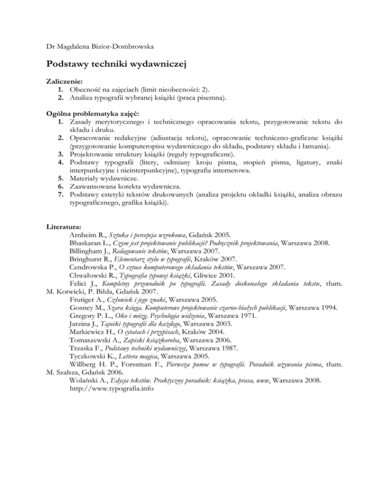 Dr Magdalena Bizior-Dombrowska Podstawy techniki wydawniczej Zaliczenie: 1. Obecność na zajęciach (limit nieobecności: 2). 2. Analiza typografii wybranej książki (praca pisemna). Ogólna problematyka zajęć: 1. Zasady merytorycznego i technicznego opracowania tekstu, przygotowanie tekstu do składu i druku. 2. Opracowanie redakcyjne (adiustacja tekstu), opracowanie techniczno-graficzne książki (przygotowanie komputeropisu wydawniczego do składu, podstawy składu i łamania). 3. Projektowanie struktury książki (reguły typograficzne). 4. Podstawy typografii (litery, odmiany kroju pisma, stopień pisma, ligatury, znaki interpunkcyjne i nieinterpunkcyjne), typografia internetowa. 5. Materiały wydawnicze. 6. Zaawansowana korekta wydawnicza. 7. Podstawy estetyki tekstów drukowanych (analiza projektu okładki książki, analiza obrazu typograficznego, grafika książki). Literatura: Arnheim R., Sztuka i percepcja wzrokowa, Gdańsk 2005. Bhaskaran L., Czym jest projektowanie publikacji? Podręcznik projektowania, Warszawa 2008. Billingham J., Redagowanie tekstów, Warszawa 2007. Bringhurst R., Elementarz stylu w typografii, Kraków 2007. Cendrowska P., O sztuce komputerowego składania tekstów, Warszawa 2007. Chwałowski R., Typografia typowej książki, Gliwice 2001. Felici J., Kompletny przewodnik po typografii. Zasady doskonałego składania tekstu, tłum. M. Kotwicki, P. Biłda, Gdańsk 2007. Frutiger A., Człowiek i jego znaki, Warszawa 2005. Gosney M., Szara księga. Komputerowe projektowanie czarno-białych publikacji, Warszawa 1994. Gregory P. L., Oko i mózg. Psychologia widzenia, Warszawa 1971. Jarzina J., Tajniki typografii dla każdego, Warszawa 2003. Markiewicz H., O cytatach i przypisach, Kraków 2004. Tomaszewski A., Zapiski książkoroba, Warszawa 2006. Trzaska F., Podstawy techniki wydawniczej, Warszawa 1987. Tyczkowski K., Lettera magica, Warszawa 2005. Willberg H. P., Forssman F., Pierwsza pomoc w typografii. Poradnik używania pisma, tłum. M. Szalsza, Gdańsk 2006. Wolański A., Edycja tekstów. Praktyczny poradnik: książka, prasa, www, Warszawa 2008. http://www.typografia.info Szczegółowa problematyka zajęć: 1. Zajęcia organizacyjne (omówienie problematyki, literatury oraz warunków zaliczenia zajęć). 2. Podstawy estetyki tekstów drukowanych a) pojęcie typografii (makrotypografia i mikrotypografia), podstawowe warunku dobrej typografii; b) analiza obrazu typograficznego (krój pisma, układ typograficzny, czytelny układ tekstu; porównywanie czytelności różnych krojów pisma; czcionki szeryfowe i bezszeryfowe; elementy budowy liter, pismo na stronach www). 3. „Zaproszenie do wnętrza” – idealna okładka książki. Projektowanie graficzne książki a psychologia odbioru a) percepcja wzrokowa (pojęcie równowagi wzrokowej: ciężar i kierunek, ich rola w projektowaniu graficznym książki); b) odczytywanie obrazów: kształt (cechy strukturalne, kontekst czasowo-przestrzenny, podobieństwo i odmienność, rola prostoty); c) rola koloru w teorii widzenia (percepcja barw, nazewnictwo kolorów); d) złudzenia wzrokowe; e) psychologia odbioru a projekt okładki: analiza wybranych okładek: elementy składowe okładki (pierwsza i czwarta strona okładki, grzbiet, skrzydełka). 4. Części składowe książki (ogólna charakterystyka: okładki, karty tytułowe, materiały wprowadzające, tekst główny materiały uzupełniające tekst główny, materiały informacyjno pomocnicze); a) karty tytułowe (dwójka i czwórka tytułowa, elementy strony przedtytułowej, przytytułowej, tytułowej i redakcyjnej) b) materiały wprowadzające: (tytulatura, konstrukcja tytułów, motto, dedykacja, przedmowa, podziękowania, życiorys autora: zasady edytorskie i analiza wybranych przykładów). 5. a) b) c) d) Materiały informacyjno-pomocnicze spis treści (zasady opracowania spisu treści, analiza różnych układów spisu treści); spis treści a żywa pagina (rodzaje żywej paginy, zasady, analiza wybranych projektów); wykaz skrótów, wykaz ilustracji, streszczenia obcojęzyczne; indeksy (rodzaje indeksów: osobowy, geograficzny, tytułowy i rzeczowy, zasady sporządzania indeksu, praktyczne ćwiczenia: opracowanie haseł osobowych i indeksowanie fragmentu książek). 6. a) b) c) d) e) Tekst główny I podział tekstu (numeracja cyfrowa wielorzędowa, numeracja cyfrowo-literowa; tytuły partii tekstu (układy tytułów, zasady); wyróżnienia (zasady stosowania kursywy, kapitalików, pogrubienia i rozstrzelenia); nazwiska; daty. 7. Tekst główny II a) cytaty (cytaty krótkie, cudzysłowy apostrofowe a cudzysłowy ostrokątne niemieckie, cytat w cytacie, rodzaje cudzysłowów); b) interpunkcja w cytatach (problem zbiegów znaków interpunkcyjnych); c) cytaty wyodrębnione (sposoby i zasady wyodrębniania cytatów; d) opuszczenia w cytatach i ingerencje w cytaty; e) wyliczenia wypunktowane (znaki wypunktowania, zasady edytorskie i interpunkcyjne). 8. a) b) c) d) Znaki wewnątrz- i międzywyrazowe dywiz a półpauza (funkcje, zasady, najczęstsze błędy, przykłady); ukośnik, apostrof, tylda, separator, wykropkowanie; spacja (skróty, inicjały, daty); ćwiczenia praktyczne (korekta fragmentów tekstu, ze szczególnym uwzględnieniem znaków interpunkcyjnych i nieinterpunkcyjnych). 9. Materiały uzupełniające tekst główny a) rodzaje przypisów (słownikowe, rzeczowe, bibliograficzne, informacyjne), zasady interpunkcyjne; b) najnowsze zasady sporządzania przypisów bibliograficznych; c) zasady sporządzania bibliografii; d) Harvard system (system autor–rok). 10. a) b) c) d) e) f) Piękno książki (elementy wzbogacające szatę graficzną książki): ilustracje (sposoby włamywania ilustracji, opisy ilustracji); ligatury, asterysk, inicjały, ozdobniki; format książki; papier (rodzaje papieru a jakość druku); elementy budowy książki (blok, grzbiet, kapitałka, wyklejka, strony działowe); ćwiczenia praktyczne: analiza szaty graficznej wyb