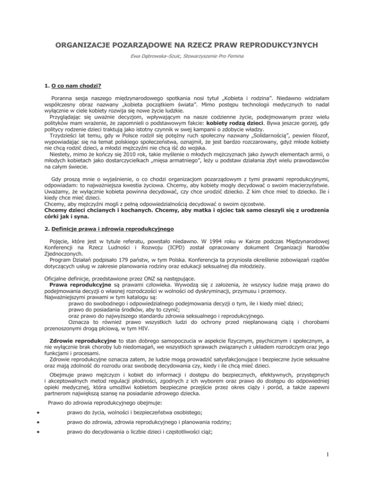ORGANIZACJE POZARZĄDOWE NA RZECZ PRAW REPRODUKCYJNYCH Ewa Dąbrowska–Szulc, Stowarzyszenie Pro Femina 1. O co nam chodzi? Poranna sesja naszego międzynarodowego spotkania nosi tytuł „Kobieta i rodzina”. Niedawno widziałam współczesny obraz nazwany „kobieta początkiem świata”. Mimo postępu technologii medycznych to nadal wyłącznie w ciele kobiety rozwija się nowe życie ludzkie. Przyglądając się uważnie decyzjom, wpływającym na nasze codzienne życie, podejmowanym przez wielu polityków mam wrażenie, że zapomnieli o podstawowym fakcie: kobiety rodzą dzieci. Bywa jeszcze gorzej, gdy politycy rodzenie dzieci traktują jako istotny czynnik w swej kampanii o zdobycie władzy. Trzydzieści lat temu, gdy w Polsce rodził się potężny ruch społeczny nazwany „Solidarnością”, pewien filozof, wypowiadając się na temat polskiego społeczeństwa, oznajmił, że jest bardzo rozczarowany, gdyż młode kobiety nie chcą rodzić dzieci, a młodzi mężczyźni nie chcą iść do wojska. Niestety, mimo że kończy się 2010 rok, takie myślenie o młodych mężczyznach jako żywych elementach armii, o młodych kobietach jako dostarczycielkach „mięsa armatniego”, leży u podstaw działania zbyt wielu prawodawców na całym świecie. Gdy proszą mnie o wyjaśnienie, o co chodzi organizacjom pozarządowym z tymi prawami reprodukcyjnymi, odpowiadam: to najważniejsza kwestia życiowa. Chcemy, aby kobiety mogły decydować o swoim macierzyństwie. Uważamy, że wyłącznie kobieta powinna decydować, czy chce urodzić dziecko. Z kim chce mieć to dziecko. Ile i kiedy chce mieć dzieci. Chcemy, aby mężczyźni mogli z pełną odpowiedzialnością decydować o swoim ojcostwie. Chcemy dzieci chcianych i kochanych. Chcemy, aby matka i ojciec tak samo cieszyli się z urodzenia córki jak i syna. 2. Definicje prawa i zdrowia reprodukcyjnego Pojęcie, które jest w tytule referatu, powstało niedawno. W 1994 roku w Kairze podczas Międzynarodowej Konferencji na Rzecz Ludności i Rozwoju (ICPD) został opracowany dokument Organizacji Narodów Zjednoczonych. Program Działań podpisało 179 państw, w tym Polska. Konferencja ta przyniosła określenie zobowiązań rządów dotyczących usług w zakresie planowania rodziny oraz edukacji seksualnej dla młodzieży. Oficjalne definicje, przedstawione przez ONZ są następujące. Prawa reprodukcyjne są prawami człowieka. Wywodzą się z założenia, że wszyscy ludzie mają prawo do podejmowania decyzji o własnej rozrodczości w wolności od dyskryminacji, przymusu i przemocy. Najważniejszymi prawami w tym katalogu są: prawo do swobodnego i odpowiedzialnego podejmowania decyzji o tym, ile i kiedy mieć dzieci; prawo do posiadania środków, aby to czynić; oraz prawo do najwyższego standardu zdrowia seksualnego i reprodukcyjnego. Oznacza to również prawo wszystkich ludzi do ochrony przed nieplanowaną ciążą i chorobami przenoszonymi drogą płciową, w tym HIV. Zdrowie reprodukcyjne to stan dobrego samopoczucia w aspekcie fizycznym, psychicznym i społecznym, a nie wyłącznie brak choroby lub niedomagań, we wszystkich sprawach związanych z układem rozrodczym oraz jego funkcjami i procesami. Zdrowie reprodukcyjne oznacza zatem, że ludzie mogą prowadzić satysfakcjonujące i bezpieczne życie seksualne oraz mają zdolność do rozrodu oraz swobodę decydowania czy, kiedy i ile chcą mieć dzieci. Obejmuje prawo mężczyzn i kobiet do informacji i dostępu do bezpiecznych, efektywnych, przystępnych i akceptowalnych metod regulacji płodności, zgodnych z ich wyborem oraz prawo do dostępu do odpowiedniej opieki medycznej, która umożliwi kobietom bezpieczne przejście przez okres ciąży i poród, a także zapewni partnerom największą szansę na posiadanie zdrowego dziecka. Prawo do zdrowia reprodukcyjnego obejmuje: prawo do życia, wolności i bezpieczeństwa osobistego; prawo do zdrowia, zdrowia reprodukcyjnego i planowania rodziny; prawo do decydowania o liczbie dzieci i częstotliwości ciąż; 1 prawo do prywatności; prawo do wolności od dyskryminacji; prawo do zmiany obyczajów i tradycji pogwałcających prawa kobiet (np. okaleczanie genitaliów kobiet) lub mniejszości seksualnych; prawo do ochrony przed torturami i innymi okrutnymi, nieludzkimi lub poniżającymi praktykami i karami; prawo do wolności od przemocy seksualnej prawo do edukacji, w tym edukacji seksualnej opartej na rzetelnej wiedzy naukowej prawo do korzystania z postępu naukowego i przyzwolenia na eksperymenty naukowe. Zgodnie z rezolucją Zgromadzenia Światowej Organizacji Zdrowia z maja 1995 (WHA 48.10) WHO uznała za priorytetowe w skali globalnej właśnie zagadnienia z dziedziny zdrowia reprodukcyjnego. Rezolucja ta szczególnie podkreśla: konieczność dokonania analizy potrzeb, opracowania rekomendacji i prowadzenia działalności edukacyjnej w zakresie zdrowia reprodukcyjnego; potrzebę regularnego monitorowania, rejestrowania i ewaluacji opracowanych rekomendacji na wszystkich poziomach opieki medycznej. 3. Gdzie się znajdujemy? Dzisiejsze międzynarodowe spotkanie działaczek i działaczy ma miejsce w siedzibie Fundacji Centrum Promocji Kobiet na ulicy Lwowskiej, w Warszawie, stolicy Polski, w Europie Środkowej, na planecie Ziemia. Kiedy zajrzymy do Wikipedii wyczytamy, że Polska, Rzeczpospolita Polska – to państwo położone w Europie Środkowej. Od zachodu graniczymy z Niemcami, od południa z Czechami i Słowacją, od wschodu z Ukrainą i Białorusią, od północnego wschodu z Litwą oraz od północy z rosyjską enklawą o nazwie obwód kaliningradzki. Większość północnej granicy Polski wyznacza wybrzeże Morza Bałtyckiego. Powierzchnia Polski wynosi 312.679 km², co daje jej 68. miejsce na świecie i dziewiąte w Europie. Pod względem liczby ludności jesteśmy na 34. miejscu wśród państw świata, a na szóstym w Unii Europejskiej. Polska ma 38 milionów 167 tysięcy ludności. – (Mały Rocznik S
