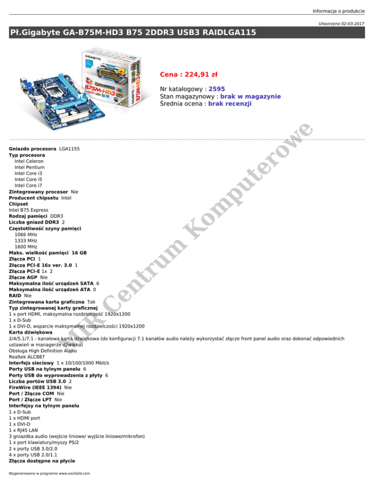 Informacje o produkcie Utworzono 02-03-2017 Pł.Gigabyte GA-B75M-HD3 B75 2DDR3 USB3 RAIDLGA115 Cena : 224,91 zł ow e Nr katalogowy : 2595 Stan magazynowy : brak w magazynie Średnia ocena : brak recenzji M IR C en tr um K om pu te r Gniazdo procesora LGA1155 Typ procesora Intel Celeron Intel Pentium Intel Core i3 Intel Core i5 Intel Core i7 Zintegrowany procesor Nie Producent chipsetu Intel Chipset Intel B75 Express Rodzaj pamięci DDR3 Liczba gniazd DDR3 2 Częstotliwość szyny pamięci 1066 MHz 1333 MHz 1600 MHz Maks. wielkość pamięci 16 GB Złącza PCI 1 Złącza PCI-E 16x ver. 3.0 1 Złącza PCI-E 1x 2 Złącze AGP Nie Maksymalna ilość urządzeń SATA 6 Maksymalna ilość urządzeń ATA 0 RAID Nie Zintegrowana karta graficzna Tak Typ zintegrowanej karty graficznej 1 x port HDMI, maksymalna rozdzielczość 1920x1200 1 x D-Sub 1 x DVI-D, wsparcie maksymalnej rozdzielczości 1920x1200 Karta dźwiękowa 2/4/5.1/7.1 - kanałowa karta dźwiękowa (do konfiguracji 7.1 kanałów audio należy wykorzystać złącze front panel audio oraz dokonać odpowiednich ustawień w managerze dźwięku) Obsługa High Definition Audio Realtek ALC887 Interfejs sieciowy 1 x 10/100/1000 Mbit/s Porty USB na tylnym panelu 6 Porty USB do wyprowadzenia z płyty 6 Liczba portów USB 3.0 2 FireWire (IEEE 1394) Nie Port / Złącze COM Nie Port / Złącze LPT Nie Interfejsy na tylnym panelu 1 x D-Sub 1 x HDMI port 1 x DVI-D 1 x RJ45 LAN 3 gniazdka audio (wejście liniowe/ wyjście liniowe/mikrofon) 1 x port klawiatury/myszy PS/2 2 x porty USB 3.0/2.0 4 x porty USB 2.0/1.1 Złącza dostępne na płycie Wygenerowano w programie www.oscGold.com M IR C en tr um K e ow om pu te r 1 x zworka kasująca CMOS 1 x złącze wentylatora procesora 1 x złącze panelu przedniego 1 x 24-pinowe złącze zasilania ATX 1 x złącze front panel audio 1 złącze wentylatora systemowego 2 x złącza USB 2.0/1.1 1 złącze zasilania 4-pin ATX 12V 1 złącze SATA 6Gb/s 5 x SATA 3Gb/s 1 x złącze USB 3.0/2.0 1 x złącze portu szeregowego 1 x złącze portu równoległego Funkcje specjalne Obsługa ON/OFF Charge Obsługa EasyTune * Dostępne funkcje programu EasyTune mogą się różnić w zależności od modelu płyty głównej. Obsługa Q-Flash Obsługa @ BIOS Obsługa Xpress Install Obsługa Xpress Recovery 2 Obsługa Auto Green Obsługa Q-Share Bios Obsługa technologii DualBIOS Licencjonowany BIOS AMI EFI PnP 1.0a, DMI 2.0, SM BIOS 2.6, ACPI 2.0a 2 x 64-Mbitowe układy pamięci flash Format płyty micro ATX Wymiary 24.4cm x 17.4cm Obsługiwane systemy operacyjne Microsoft Windows 8/7/Vista/XP Oprogramowanie Norton Internet Security (wersja OEM)