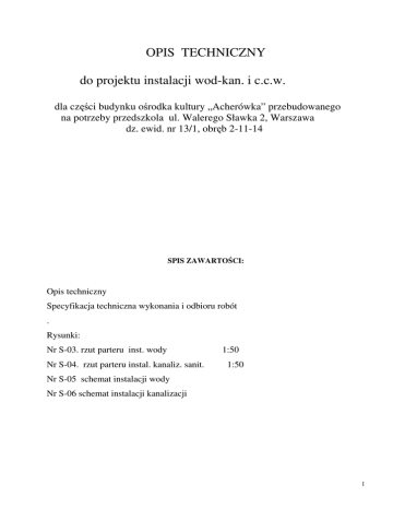 OPIS TECHNICZNY do projektu instalacji wod-kan. i c.c.w. dla części budynku ośrodka kultury „Acherówka” przebudowanego na potrzeby przedszkola ul. Walerego Sławka 2, Warszawa dz. ewid. nr 13/1, obręb 2-11-14 SPIS ZAWARTOŚCI: Opis techniczny Specyfikacja techniczna wykonania i odbioru robót . Rysunki: Nr S-03. rzut parteru inst. wody Nr S-04. rzut parteru instal. kanaliz. sanit. 1:50 1:50 Nr S-05 schemat instalacji wody Nr S-06 schemat instalacji kanalizacji 1 Opis techniczny do projektu wykonawczego instalacji w.-kan., c.c.w. dla przedszkola w części budynku Ośrodka Kultury „Acherówka” przy ul.Walerego Sławka w Warszawie dz.ewid.nr 13/1, obręb 2-11-14 1. 2. Podstawa opracowania 1.1 Zlecenie Inwestora. 1.2 Projekt instalacji wod-kan z 2005r. 1.3 Projekt arch.-bud. 1.4 Uzgodnienia z Inwestorem 1.5 Obowiązujące normy i przepisy Charakterystyka terenu i zabudowy Niniejsze opracowanie dotyczy zmiany sposobu uŜytkowania i przebudowy części budynku Ośrodka Kultury „Acherówka” na potrzeby przedszkola. Budynek jest niepodpiwniczony. Budynek znajduje się w zasięgu istniejącego. uzbrojenia miejskiego. Budynek wykonano w technologii tradycyjnej.. Istniejący budynek posiada 2 kondygnacje nadziemne. Część kondygnacji parter przeznaczono na przedszkole. Na parterze istnieje kotłownia z której cały budynek zasilany jest w ciepło dla centralnego ogrzewania i ciepłej wody. 3. Projektowane instalacje wewnętrzne 3.1. Instalacja wodociągowa 3.2. Instalacja ciepłej wody uŜytkowej 3.3. Instalacja kanalizacji sanitarnej 3.1. Instalacja wodociągowa Budynek zasilany jest z istniejącego wodociągu poprzez istniejące przyłącze wodociągowe D50 PE zewnętrzną studnią wodomierzową . Istniejąca instalacja I strefowa. Poziomy wody prowadzone są w stropie podwieszonym w korytarzu części budynku przeznaczonej na przedszkole (pozostają bez zmian). Następnie woda prowadzona jest na piętro i do pozostałej części budynku. Od istniejących przewodów poziomych projektuje się poprowadzenia równieŜ w stropie podwieszonym przewodów zasilających łazienki i przygotowalnię posiłków w przedszkolu. WyposaŜenie pomieszczeń : 2 -łazienka dla dzieci: 3 umywalki, 2 płuczki zbiornikowo-ustępowe, natrysk -toaleta ogólna : umywalka dla niepełnosprawnych, płuczka zbiornikowo-ustępowa -przygotowalnia posiłków : umywalka, zlewozmywak dwukomorowy, zmywarka -istniejące pom porządkowe(pozostaje bez zmian): zlew , zawór ze złączką do węŜa Standardowo – baterie sztorcowe. W łazience dla dzieci baterie bez mieszacza, w toalecie ogólnej bateria umywalkowa dla niepełnosprawnych. Zapotrzebowanie wody dla celów bytowo-gospodarczych wynosi 0,71 l /sek. Projektowane zapotrzebowanie wody i ciepła dla przygotowania ciepłej wody nie przekraczają dotychczasowej wydajności instalacji. Pomiar ilości wody dla całego budynku wodomierzem w studni na przyłączu. Pomiar ilości wody dla przedszkola za pomocą wodomierzy skrzydełkowych dla wody ciepłej i zimnej zamontowanych na odejściach do grup przyborów. Instalacje wodociągowe bytowe poziomy i piony w budynku projektowane są jako jednostrefowe z rur tworzywowych Pn 10. Przewody wodociągowe i ciepłej wody. izolować otuliną z pianki polietylenowej o współczynniku przewodzenia ciepła lambda= 0.040 W/mK lub otuliną z wełny kamiennej w płaszczu ochronnym z folii aluminiowej. Podejścia do przyborów w łazienkach i przygotowalni posiłków prowadzić w stropie podwieszonym a następnie w bruzdach ściennych przewodami z rur typu PP do wody zimnej PN 10 w rurach osłonowych „peszla” Kształtki połączeniowe przystosowane do ułoŜenia w szlichcie betonowej. Armatura dla instalacji Pr=min 10 bar 3.2. Instalacja ciepłej wody uŜytkowej i cyrkulacji Instalacja ciepłej wody uŜytkowej budynku zasilana będzie z kotłowni c.o. + c.w. zlokalizowanej na parterze budynku. Instalacja jednostrefowa z rozdziałem górnym. Poziomy prowadzone będą w stropie podwieszonym (równolegle do przewodów wody zimnej), zaizolowane otuliną z pianki polietylenowej. Celem prawidłowego obiegu instalacji ciepłej wody. projektuje się instalację pompową cyrkulacyjną poziomów i pionów.Przewody wody cyrkulacyjnej prowadzić obok przewodów wody ciepłej i zaizolować. Ze względu na przeznaczenie pomieszczeń na przedszkole projektuje się na odejściu wody ciepłej do łazienek dla dzieci zainstalowanie zaworu termostatycznego mieszającego .Zakres 3 regulacji tego zaworu 35-50st.C, przepływ 0,24-4,4 m /h. Zapotrzebowanie ciepła dla przygotowania ciepłej wody. Qcw dla przedszkola 23,5 kW, nie przekracza dotychczasowego zapotrzebowania ciepła dla c.w. Nowe odcinki instalacji ciepłej wody. i cyrkulacji wykonać z rur tworzywowych typu PP 3 trob=800C PN 16 z kształtkami przewidzianymi do zabetonowania. Instalacje c.w. i cyrkulacji (poziomy i piony) naleŜy zaizolować otulinami z pianki polietylenowej lub otuliną z wełny kamiennej płaszczu z folii aluminiowej grubość wg zał. Nr 2 Rozporządzenia Ministra Infrastruktury Dz Ustaw 201/08. Temp. wody max. 500C na przyborze, armatura dla instalacji na temp. ≥ 1000C pn 16 bar. 3.3. Instalacja kanalizacji sanitarnej Instalacja kanalizacji w budynku jest wykonana z rur PVC - poziomy SN 8 do wys. parteru, powyŜej z rur PVC niskoszumowych. Nowe odcinki kanalizacji równieŜ naleŜy wykonac z rur z PVC SN 8. Przybory sanitarne w łazienkach i w pomieszczeniu przygotowalni podłączyć naleŜy do istniejących poziomów kanalizacji po sprawdzeniu metodą odkrywki lokalizacji i rzędnych tych przewodów. Mocowanie instalacji wg systemu mocowań z przekładkami akustycznymi. W kotłowni istnieją studzienki schładzające. Część budynku w której mieści się przedszkole posiada 1 wylot kanalizacji do istniejącego przyłącza kanalizacyjnego. Wszelkie prace wykonywać zgodnie z obowiązującymi przypisami i normami, oraz instrukcjami producentów rur i urzą