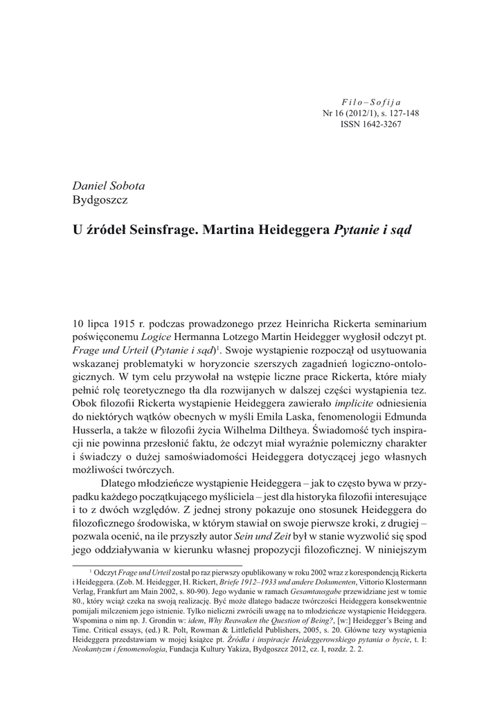 Filo–Sofija Nr 16 (2012/1), s. 127-148 ISSN 1642-3267 Daniel Sobota Bydgoszcz U źródeł Seinsfrage. Martina Heideggera Pytanie i sąd 10 lipca 1915 r. podczas prowadzonego przez Heinricha Rickerta seminarium poświęconemu Logice Hermanna Lotzego Martin Heidegger wygłosił odczyt pt. Frage und Urteil (Pytanie i sąd)1. Swoje wystąpienie rozpoczął od usytuowania wskazanej problematyki w horyzoncie szerszych zagadnień logiczno-ontologicznych. W tym celu przywołał na wstępie liczne prace Rickerta, które miały pełnić rolę teoretycznego tła dla rozwijanych w dalszej części wystąpienia tez. Obok filozofii Rickerta wystąpienie Heideggera zawierało implicite odniesienia do niektórych wątków obecnych w myśli Emila Laska, fenomenologii Edmunda Husserla, a także w filozofii życia Wilhelma Diltheya. Świadomość tych inspiracji nie powinna przesłonić faktu, że odczyt miał wyraźnie polemiczny charakter i świadczy o dużej samoświadomości Heideggera dotyczącej jego własnych możliwości twórczych. Dlatego młodzieńcze wystąpienie Heideggera – jak to często bywa w przypadku każdego początkującego myśliciela – jest dla historyka filozofii interesujące i to z dwóch względów. Z jednej strony pokazuje ono stosunek Heideggera do filozoficznego środowiska, w którym stawiał on swoje pierwsze kroki, z drugiej – pozwala ocenić, na ile przyszły autor Sein und Zeit był w stanie wyzwolić się spod jego oddziaływania w kierunku własnej propozycji filozoficznej. W niniejszym 1 Odczyt Frage und Urteil został po raz pierwszy opublikowany w roku 2002 wraz z korespondencją Rickerta i Heideggera. (Zob. M. Heidegger, H. Rickert, Briefe 1912–1933 und andere Dokumenten, Vittorio Klostermann Verlag, Frankfurt am Main 2002, s. 80-90). Jego wydanie w ramach Gesamtausgabe przewidziane jest w tomie 80., który wciąż czeka na swoją realizację. Być może dlatego badacze twórczości Heideggera konsekwentnie pomijali milczeniem jego istnienie. Tylko nieliczni zwrócili uwagę na to młodzieńcze wystąpienie Heideggera. Wspomina o nim np. J. Grondin w: idem, Why Reawaken the Question of Being?, [w:] Heidegger’s Being and Time. Critical essays, (ed.) R. Polt, Rowman & Littlefield Publishers, 2005, s. 20. Główne tezy wystąpienia Heideggera przedstawiam w mojej książce pt. Źródła i inspiracje Heideggerowskiego pytania o bycie, t. I: Neokantyzm i fenomenologia, Fundacja Kultury Yakiza, Bydgoszcz 2012, cz. I, rozdz. 2. 2. 128 DANIEL SOBOTA komentarzu staram się przybliżyć historyczno-filozoficzne założenia Heideggerowskiego wystąpienia z roku 1915, tj. motywy jego zainteresowania logiką, jej koncepcję i jej przedmiot, w tym przede wszystkim teorię tytułowego sądu, a także znaczenie, źródło i inspiracje jego rozważań nad pytaniem, które zaowocowało postawieniem fundamentalnego pytania o bycie – to wszystko w kontekście filozoficznego milieu, w którym Heidegger dorastał jako myśliciel. 1. Heidegger i Rickert Jak zauważa redaktor angielskiego tłumaczenia Frage und Urteil, wystąpienie to można uznać za swego rodzaju kulminację studenckiej aktywności Heideggera na seminarium Rickerta, na które młody filozof z Meßkirch uczęszczał od roku 19122. Filozoficzna i dydaktyczna działalność Rickerta jest w przypadku narodzin Heideggerowskiej drogi myślenia nie do przecenienia. W ciągu swoich studiów filozoficznych (1912–1915) na Uniwersytecie Karla Alberta we Fryburgu Badeńskim Heidegger uczestniczył w czternastu zajęciach prowadzonych przez Rickerta, co stanowi trochę mniej niż połowę wszystkich zajęć z filozofii, na jakie uczęszczał3. W roku 1913 odbyła się obrona jego rozprawy doktorskiej pt. Die Lehre vom Urteil im Psychologismus (Teoria sądu w psychologizmie), której Rickert był recenzentem. W tym samym roku pisał on w liście do Rickerta: Niestety dopiero dzisiaj mogę panu serdecznie podziękować za silne filozoficzne pobudzenie i naukę, które z pana wykładów, a przede wszystkim z pana seminarium mogłem odebrać. Wprawdzie moje filozoficzne podstawowe poglądy są inne […].4 Natomiast w swoim życiorysie z roku 1915 Heidegger wspominał: dzięki uczestnictwu w wykładach i seminarium prowadzonych przez Rickerta „poznałem problemy filozoficzne jako problemy i otrzymałem wgląd w istotę logiki”5. W roku 1915 uzyskał Heidegger habilitację za pracę pod kierunkiem Rickerta pt. Die Kategorien- und Bedeutungslehre des Duns Scotus (Teoria kategorii i znaczenia u Dunsa Szkota). Praca była dedykowana Rickertowi. Dzięki swemu nauczycielowi poznał także pisma innego jego ucznia – urodzonego w Wadowicach, a zmarłego podczas I wojny światowej, Emila Laska. Jego „badaniom” – wspomina Heidegger podczas jednego ze swych wczesnych wykładów – „osobiście bardzo wiele 2 Becoming Heidegger, on the trail of his early occasional writings (1910 –1927), T. Kisiel, T. Sheehan (eds.) Northwestern University Press, Evanston 2007, s. 51. 3 Spis poszczególnych zajęć, w których Heidegger uczestniczył najpierw jako student teologii, a potem filozofii, znajduje się w: Heidegger und die Anfänge seines Denkens, „Heidegger-Jahrbuch”, 2004, Bd. 1, s. 13-17. 4 M. Heidegger, H. Rickert, Briefe 1912–1933 und andere Dokumenten, Vittorio Klostermann Verlag, Frankfurt am Main 2002, s. 11 (list nr 2). 5 Cyt. za: H. Ott, Martin Heidegger. W drodze ku biografii, przeł. J. Sidorek, Oficyna Wydawnicza Volumen, Warszawa 1997, s. 72. 129 U ŹRÓDEŁ SEINSFRAGE. MARTINA HEIDEGGERA PYTANIE I SĄD zawdzięczam”6. O ile Lask był dla Heideggera przede wszystkim tym filozofem, który – za sprawą zaadaptowania Husserlowskich Badań logicznych – znajdował się na drodze do pomyślnego r o z w i ą z a n i a postawionych przez neokantyzm problemów, o tyle Rickert ofiarował mu „widzenie i rozumienie aktualnych logicznych problemów” (podkreśl. – D.S) jako takich7. Mimo otwartej krytyki 