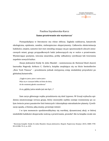 Creatio Fantastica PL ISSN: 2300-2514 R. XI, 2015, nr 4 (51) Paulina Szymborska-Karcz Samo przetrwanie nie wystarcza Postapokalipsa w literaturze ma różne oblicza. Zagłada nuklearna, katastrofa ekologiczna, epidemie, zombie, niebezpieczne eksperymenty. Całkowita eksterminacja ludzkości, smętni, samotni last men standing snujący się po opustoszałych ulicach zniszczonych miast, grupy przypadkowych ludzi jednoczących się w walce o przetrwanie. Wymierające pustynie, wieczna zmarzlina, próby odbudowy cywilizacji lub tworzenia zupełnie nowych kultur. Stacja Jedenaście Emily St. John Mandel – nominowana do National Book Award, laureatka Nagrody Arthura C. Clarke’a, książka znajdująca się na liście bestsellerów „New York Timesa” – przedstawia jednak nietypową wizję niedalekiej przyszłości po globalnej katastrofie. „Ciągle to jutro, jutro i znów jutro Wije się w ciasnym kółku od dnia do dnia, Aż do ostatniej głoski czasokresu” A co, gdyby jutra miało już nie być...? Sam zarys głównego wątku przedstawia się dość typowo. W Gruzji wybucha epidemia zmutowanego wirusa grypy, który niezwykle szybko zostaje rozniesiony po całym świecie przez pasażerów linii lotniczych i dziesiątkuje mieszkańców planety. Cywilizacja upada, a Ziemia, jaką znamy, przestaje istnieć. I w tym momencie spodziewalibyśmy się wartkiej, dynamicznej akcji, w której niedobitki ludzkości desperacko walczą o przetrwanie, prawda? Ale ta książka wcale nie Recenzja książki: Emily St. John Mandel, Stacja Jedenaście, Słupsk: Papierowy Księżyc 2015, ISBN: 97883-61386-74-2, ss. 425. 1 jest o tym! „Samo przetrwanie nie wystarcza”. I właśnie o tym opowiada Stacja Jedenaście. „Świat jest teatrem, aktorami ludzie, Którzy kolejno wchodzą i znikają” Stacja Jedenaście to postapokaliptyczne theatrum mundi, w którym pierwsze skrzypce gra sztuka. Znany aktor umierający na atak serca na scenie teatru w czasie inscenizacji Króla Leara w przeddzień upadku cywilizacji. Podróżująca Symfonia – grupa wędrownych aktorów i muzyków – przemierzająca nowy, odradzający się powoli świat, wystawiająca sztuki Szekspira i grająca koncerty muzyki klasycznej dla mieszkańców niewielkich osad na terenie Ameryki Północnej, zamieszkanych przez grupki ocaleńców. Sen nocy letniej pod szyldem z cytatem ze Star Treka, głoszącym, że „Samo przetrwanie nie wystarczy”. Tytania w wyświechtanej sukni ślubnej i Oberon w smokingu. Półlegendarne Muzeum Cywilizacji na lotnisku w Severn City doglądane przez starego, sentymentalnego kustosza. Puste groby usypywane przez natchnionego Proroka, oczyszczającego pozostałości dawnego świata z resztek zła i grzechu. Cicha, aspołeczna artystka pogrążająca się we własnym wyimaginowanym świecie podczas rysowania kolejnych klatek nietypowej powieści obrazkowej. Młoda aktorka szekspirowska, maniakalnie przetrząsająca opustoszałe, walące się budynki w poszukiwaniu kolejnych zeszytów awangardowego komiksu, którego pierwsze dwie części nosi przy sobie jako wyjątkową pamiątkę z dzieciństwa. Szklany przycisk do papieru w formie kuli z przetaczającymi się wewnątrz burzowymi chmurami, powracająca w kolejnych scenach jako swoisty leitmotiv. Co może łączyć te wszystkie, jakże symboliczne, obrazy? Na to pytanie usiłuje właśnie odpowiedzieć Emily St. John Mandel. „Gdyby świat, jaki znasz, przestał istnieć, co chciałbyś ocalić od zapomnienia? Ulubione sprzęty? Ukochaną powieść? Pamiątki z dzieciństwa?” Bohaterowie Stacji Jedenaście nigdy nie rozstają się z niejednokrotnie nietypowymi przedmiotami o znanej tylko im wartości sentymentalnej, kolekcjonują wycinki ze starych brukowców, przechowują jako eksponaty muzealne laptopy, motocykle, prawa jazdy, paszporty i karty kredytowe. Przede wszystkim jednak ze starego świata, który przestał istnieć, ocalają sztukę, piękno i pamięć. 2 W nowym świecie nie latają już samoloty, nie ma internetu ani elektryczności, amunicja do broni palnej i leki są niezwykle cennym towarem deficytowym. Wciąż istnieją jednak biblioteki i muzea. Wciąż można posłuchać koncertu orkiestry symfonicznej i obejrzeć inscenizację Króla Leara, Hamleta albo Snu nocy letniej0. W Stacji Jedenaście to sztuka staje się ratunkiem dla człowieczeństwa, a pielęgnowanie pamięci o dawnym świecie i otaczanie się ocalałymi drobinami tego, co we współczesnej cywilizacji można by nazwać „pięknym”, znaczy więcej niż samo przetrwanie. „Jęczeć nad minionym nieszczęściem to najlepszy sposób, by przyciągnąć inne.” Bohaterowie Stacji Jedenaście już nie jęczą. Oni tylko wspominają, pielęgnują w pamięci to, co utracili, i żyją dalej. Dzięki temu w postapokaliptycznym świecie wciąż panuje względny pokój, a ludzie, zamiast – jak w większości dzieł gatunku – mordować się nawzajem, jako priorytet stawiając nieufność, czy w bezwzględny sposób walczyć o dominację albo załamywać się i poddawać – dalej grają Szekspira. To nic, że świat wygląda teraz zupełnie inaczej. To nic, że niewiele pozostało z rzeczywistości, jaką znali. Show must go on... „Gdyby twoja dusza opuściła ziemię, poszedłbym za nią i ją odnalazł w tej ciszy mój statek kosmiczny zawieszony” Autorka skupia się w dużej mierze na opisywaniu relacji międzyludzkich – często trudnych, skomplikowanych, niejednoznacznych. Bo również one są w życiu ważne i to właśnie one decydują o naszym człowieczeństwie. Emily St. John Mandel usiłuje pokazać, że to również drugi człowiek jest tym, czego we współczesnym, wygodnym świecie nie doceniamy, a czego brak najbardziej by nam doskwierał, gdybyśmy to stracili. Bohaterowie Stacji Jedenaście nie zawsze lubią się nawzajem, niektórzy członkowie większych grup, będących dziełem przypadku, irytują innych z byle powodu – bo przecież natura ludzka