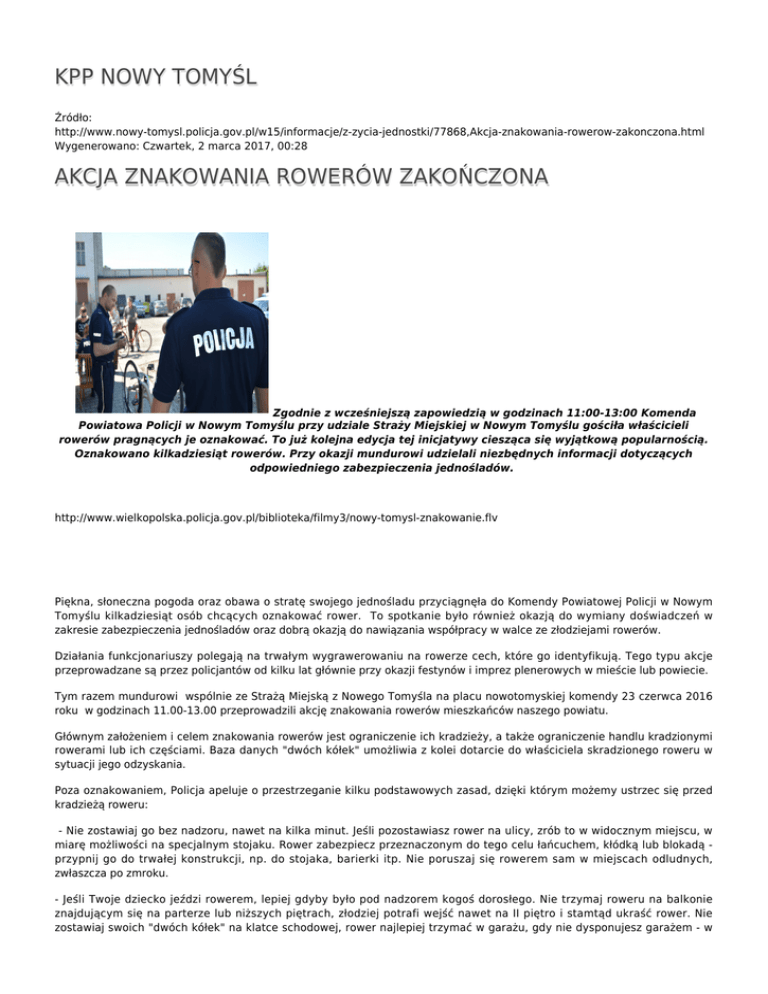 KPP NOWY TOMYŚL Źródło: http://www.nowy-tomysl.policja.gov.pl/w15/informacje/z-zycia-jednostki/77868,Akcja-znakowania-rowerow-zakonczona.html Wygenerowano: Czwartek, 2 marca 2017, 00:28 AKCJA ZNAKOWANIA ROWERÓW ZAKOŃCZONA Zgodnie z wcześniejszą zapowiedzią w godzinach 11:00-13:00 Komenda Powiatowa Policji w Nowym Tomyślu przy udziale Straży Miejskiej w Nowym Tomyślu gościła właścicieli rowerów pragnących je oznakować. To już kolejna edycja tej inicjatywy ciesząca się wyjątkową popularnością. Oznakowano kilkadziesiąt rowerów. Przy okazji mundurowi udzielali niezbędnych informacji dotyczących odpowiedniego zabezpieczenia jednośladów. http://www.wielkopolska.policja.gov.pl/biblioteka/filmy3/nowy-tomysl-znakowanie.flv Piękna, słoneczna pogoda oraz obawa o stratę swojego jednośladu przyciągnęła do Komendy Powiatowej Policji w Nowym Tomyślu kilkadziesiąt osób chcących oznakować rower. To spotkanie było również okazją do wymiany doświadczeń w zakresie zabezpieczenia jednośladów oraz dobrą okazją do nawiązania współpracy w walce ze złodziejami rowerów. Działania funkcjonariuszy polegają na trwałym wygrawerowaniu na rowerze cech, które go identyfikują. Tego typu akcje przeprowadzane są przez policjantów od kilku lat głównie przy okazji festynów i imprez plenerowych w mieście lub powiecie. Tym razem mundurowi wspólnie ze Strażą Miejską z Nowego Tomyśla na placu nowotomyskiej komendy 23 czerwca 2016 roku w godzinach 11.00-13.00 przeprowadzili akcję znakowania rowerów mieszkańców naszego powiatu. Głównym założeniem i celem znakowania rowerów jest ograniczenie ich kradzieży, a także ograniczenie handlu kradzionymi rowerami lub ich częściami. Baza danych "dwóch kółek" umożliwia z kolei dotarcie do właściciela skradzionego roweru w sytuacji jego odzyskania. Poza oznakowaniem, Policja apeluje o przestrzeganie kilku podstawowych zasad, dzięki którym możemy ustrzec się przed kradzieżą roweru: - Nie zostawiaj go bez nadzoru, nawet na kilka minut. Jeśli pozostawiasz rower na ulicy, zrób to w widocznym miejscu, w miarę możliwości na specjalnym stojaku. Rower zabezpiecz przeznaczonym do tego celu łańcuchem, kłódką lub blokadą przypnij go do trwałej konstrukcji, np. do stojaka, barierki itp. Nie poruszaj się rowerem sam w miejscach odludnych, zwłaszcza po zmroku. - Jeśli Twoje dziecko jeździ rowerem, lepiej gdyby było pod nadzorem kogoś dorosłego. Nie trzymaj roweru na balkonie znajdującym się na parterze lub niższych piętrach, złodziej potrafi wejść nawet na II piętro i stamtąd ukraść rower. Nie zostawiaj swoich "dwóch kółek" na klatce schodowej, rower najlepiej trzymać w garażu, gdy nie dysponujesz garażem - w dobrze zabezpieczonej piwnicy. - W sobie tylko znanym miejscu, na ramie, zaznacz jakiś znak szczególny, w przypadku ewentualnej kradzieży, pomoże to w identyfikacji jednośladu. Podczas nanoszenia na ramy jednośladów niewidocznych gołym okiem cech identyfikacyjnych przypominano ich właścicielom kilka podstawowych zasad bezpiecznego poruszania się po drogach. Rowerzysto pamiętaj: - Na przejściu dla pieszych kierowca spodziewa się obiektu poruszającego się z prędkością pieszego. Wjeżdżając na rowerze na przejście dla pieszych nie tylko łamiemy przepisy, ale narażamy się na to, że kierowca nas w porę nie zauważy.- Oświetlenie, to nie tylko obowiązkowe wyposażenie roweru, to także szansa, że zostaniemy dostrzeżeni przez kierowcę odpowiednio wcześnie a nie wtedy, gdy jest za późno na hamowanie.- Nie należy bezgranicznie wierzyć w posiadanie pierwszeństwa przejazdu. Lepiej zachować rozwagę przy przejeżdżaniu przez przejazd dla rowerzystów niż narazić się na obrażenia ciała w kontakcie z pojazdem. - Rowerzysta może korzystać z pobocza lub jezdni tylko w razie braku drogi dla rowerów lub rowerów i pieszych. - Kask, mimo że nie jest obowiązkowy, znacznie zmniejsza prawdopodobieństwo urazu podczas kolizji lub upadku z roweru. Myśleć trzeba przed zdarzeniem. Później już może nie być czym. Czasem warto, a nawet trzeba zrezygnować z jazdy rowerem. Jeśli nie musisz nie ryzykuj jazdy po bardzo ruchliwej jezdni, nie wsiadaj także na rower podczas złej widoczności – w czasie mgły, deszczu czy o zmierzchu na źle oświetlonej drodze przepis zezwala na jazdę po chodniku. W takich warunkach łatwo o wypadek. Apelujemy także do kierowców. Rowerzysta zaliczany jest do grupy tzw. niechronionych uczestników ruchu. Nie jest osłonięty blachą, nie jest zabezpieczony strefami kontrolowanego zgniotu, pasami, poduszkami, kurtynami i innymi urządzeniami chroniącymi kierujących samochodami. Kolizja pojazdu samochodowego i rowerzysty zawsze skończy się gorzej dla tego drugiego. programy prewencyjne/znakowanie rowerow/2016 http://www.wielkopolska.policja.gov.pl/biblioteka/filmy3/nowy-tomysl-znakowanie.flv Ocena: 0/5 (0) Tweetnij