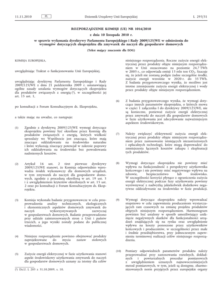 11.11.2010 PL Dziennik Urzędowy Unii Europejskiej L 293/31 ROZPORZĄDZENIE KOMISJI (UE) NR 1016/2010 z dnia 10 listopada 2010 r. w sprawie wykonania dyrektywy Parlamentu Europejskiego i Rady 2009/125/WE w odniesieniu do wymogów dotyczących ekoprojektu dla zmywarek do naczyń dla gospodarstw domowych (Tekst mający znaczenie dla EOG) niniejszego rozporządzenia. Roczne zużycie energii elek trycznej przez produkty objęte niniejszym rozporządze niem w Unii oszacowano na poziomie 24,7 TWh w 2005 r., co odpowiada emisji 13 mln ton CO2. Szacuje się, że jeżeli nie zostaną podjęte żadne szczególne środki, zużycie energii wzrośnie w 2020 r. do 35 TWh. Z badania przygotowawczego wynika, że możliwe jest istotne zmniejszenie zużycia energii elektrycznej i wody przez produkty objęte niniejszym rozporządzeniem. KOMISJA EUROPEJSKA, uwzględniając Traktat o funkcjonowaniu Unii Europejskiej, uwzględniając dyrektywę Parlamentu Europejskiego i Rady 2009/125/WE z dnia 21 października 2009 r. ustanawiającą ogólne zasady ustalania wymogów dotyczących ekoprojektu dla produktów związanych z energią (1), w szczególności jej art. 15 ust. 1, (6) Z badania przygotowawczego wynika, że wymogi doty czące innych parametrów ekoprojektu, o których mowa w części 1 załącznika I do dyrektywy 2009/125/WE, nie są konieczne, ponieważ zużycie energii elektrycznej przez zmywarki do naczyń dla gospodarstw domowych w fazie użytkowania jest zdecydowanie najważniejszym aspektem środowiskowym. (7) Należy zwiększyć efektywność zużycia energii elek trycznej przez produkty objęte niniejszym rozporządze niem przez zastosowanie istniejących niezastrzeżonych i opłacalnych technologii, które mogą doprowadzić do zmniejszenia łącznych kosztów zakupu i eksploatacji tych produktów. po konsultacji z Forum Konsultacyjnym ds. Ekoprojektu, a także mając na uwadze, co następuje: (1) Zgodnie z dyrektywą 2009/125/WE wymogi dotyczące ekoprojektu powinny być określane przez Komisję dla produktów związanych z energią, których wielkość sprzedaży we Wspólnocie jest znacząca, które mają znaczące oddziaływanie na środowisko naturalne i które wykazują znaczący potencjał w zakresie poprawy ich oddziaływania na środowisko bez powodowania nadmiernych kosztów. (2) Artykuł 16 ust. 2 tiret pierwsze dyrektywy 2009/125/WE stanowi, że Komisja odpowiednio wpro wadza środek wykonawczy dla domowych urządzeń, w tym zmywarek do naczyń dla gospodarstw domo wych, zgodnie z procedurą określoną w art. 19 ust. 3 i z uwzględnieniem kryteriów określonych w art. 15 ust. 2 oraz po konsultacji z Forum Konsultacyjnym ds. Ekop rojektu. (8) Wymogi dotyczące ekoprojektu nie powinny mieć wpływu na funkcjonalność z perspektywy użytkownika końcowego i nie powinny mieć negatywnego wpływu na zdrowie, bezpieczeństwo lub środowisko. W szczególności korzyści płynące z ograniczenia zużycia energii elektrycznej podczas fazy użytkowania powinny wyrównywać z nadwyżką jakiekolwiek dodatkowe nega tywne oddziaływanie na środowisko w fazie produkcji. (3) Komisja wykonała badanie przygotowawcze w celu prze prowadzenia analizy technicznych, ekologicznych i ekonomicznych aspektów domowych zmywarek do naczyń wykorzystywanych zazwyczaj w gospodarstwach domowych. Badanie przeprowadzono przy udziale zainteresowanych stron z Unii i państw trzecich, a jego wyniki zostały podane do publicznej wiadomości. (9) (4) Niniejsze rozporządzenie powinno obejmować produkty zaprojektowane do mycia zastaw stołowych w gospodarstwach domowych. Wymogi dotyczące ekoprojektu należy wprowadzać stopniowo w celu zapewnienia producentom wystarcza jących ram czasowych na zmianę projektu produktów objętych niniejszym rozporządzeniem. Harmonogram powinien być ustalony w sposób umożliwiający unik nięcie negatywnych skutków dla funkcjonalności urzą dzeń znajdujących się na rynku oraz uwzględnienie wpływu na koszty ponoszone przez użytkowników końcowych i producentów, w szczególności przez małe i średnie przedsiębiorstwa, przy jednoczesnym zapew nieniu terminowej realizacji celów niniejszego rozporzą dzenia. (5) Zużycie energii elektrycznej w fazie użytkowania stanowi aspekt środowiskowy użytkowania zmywarek do naczyń dla gospodarstw domowych uznany za istotny dla celów (10) Pomiary odpowiednich parametrów produktu należy przeprowadzać przy zastosowaniu rzetelnych, dokład nych i powtarzalnych procedur pomiarowych z uwzględnieniem uznanych najnowocześniejszych metod pomiarowych, w tym, jeżeli są dostępne, zharmo nizowanych norm przyjętych przez europejskie organy (1) Dz.U. L 285 z 31.10.2009, s. 10. L 293/32 PL Dziennik Urzędowy Unii Europejskiej normalizacyjne wymienione w załączniku I do dyrektywy 98/34/WE Parlamentu Europejskiego i Rady z dnia 22 czerwca 1998 r. ustanawiającej procedurę udzielania informacji w zakresie norm i przepisów technicznych, oraz zasad dotyczących usług społeczeństwa informacyj nego (1). 11.11.2010 3) „komplet naczyń” oznacza określony zestaw naczyń stoło wych, naczyń szklanych oraz sztućców do użycia przez jedną osobę; (11) Zgodnie z art. 8 dyrektywy 2009/125/WE niniejsze rozporządzenie powinno określić mające zastosowanie procedury oceny zgodności. 4) „pojemność znamionowa” oznacza maksymalną liczbę kompletów naczyń, razem z naczyniami do serwowania, podaną przez producenta, które mogą być poddawane zabiegom w zmywarce do naczyń dla gospodarstw domo wych w ramach wybranego programu, jeżeli zostaną zała dowane zgodnie z instrukcjami producenta; (12) Aby ułatwić przeprowadzanie kontroli zgodności, produ cenci powinni przekazywać informacje w dokumentacji technicznej określonej w załącznikach V i VI do dyrek tywy 2009/125/WE, w zakresie, w jakim dotyczą one wymogów określonych w niniejszym rozporządzeniu. 5) „program” oznacza zestaw operacji, które zostały zdefin