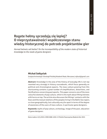 Homo Ludens 1(7) / 2015 Rogate hełmy sprzedają się lepiej? O nieprzystawalności współczesnego stanu wiedzy historycznej do potrzeb projektantów gier Horned helmets sell better? On the incompatibility of the modern state of historical knowledge to the needs of game designers Michał Sołtysiak Instytut Archeologii i Etnologii Polskiej Akademii Nauk, Warszawa | [email protected] Abstract: Knowledge in the area of the history of everyday life is not represented very strongly in history coursebooks, which focus generally on political and chronological aspects. The mass culture growing from this shortcoming contains a great number of simplifications, distortions, and falsifications concerning past epochs. This paper concerns one of the more colourful elements of pop culture, which is the myth about Viking helmets with horns on top. The article also discusses the Vikings’ contacts with the Slavs and the mutual relations of the peoples living in the Baltic Sea region, so close geographically, but culturally very far apart in terms of the degree of awareness of the users of mass culture, in particular game designers. Keywords: myths of pop culture, archeology, image of the past, education of game designers Homo Ludens 1(7) / 2015 | ISSN 2080-4555 | © Polskie Towarzystwo Badania Gier 2015 Dziedzictwo kulturowe związane z historią poszczególnych narodów świata jest obficie reprezentowane w grach komputerowych i planszowych. Choć motywy stworzone przez różne etnosy i grupy kulturowe nie są stosowane podobnie licznie i szczegółowo, to trudno odmówić twórcom gier inwencji, gdyż odnajdziemy w grach elementy oraz motywy z każdej możliwej kultury. Dziedzictwo tradycji narodowych są jednym z fundamentów fabuł i estetyki w przedstawianiu świata w szeroko pojętej rozrywce. Wątpliwości budzi jednak zarówno rzetelność, jak i wybór wspomnianych motywów. O ile ich selekcję i sposób wykorzystania warunkują kwestie marketingowe i kreatywność samych twórców, o tyle pozostaje problem aktualności stosowanych motywów i swoistego propagowania błędów, które powodują, że dzisiejszy mit kulturowy1 na temat przeszłości często nie ma zbyt wiele wspólnego z tą przeszłością. Nie przeszka dza to jednak twórcom gier w tym, by był bezwiednie traktowany jako artystyczna transformacja obrazu przeszłości opartego na faktach i uzasadnionych hipotezach. Idealnym przykładem jest przedstawianie we współczesnych grach wikingów2 jako wojowników w hełmach z rogami, a jednocześnie wręcz niechęć do ukazania tego zjawiska na tle rzeczywistego stanu wiedzy o ludach nadbałtyckich, czyli naszych przodkach, których zinfantylizowany i przekłamany obraz wciąż jest elementem naszej świadomości. Świadomie lub nieświadomie zgadzamy się na takie przedstawienie, gdyż zakorzenienie tego obrazu w świadomości wydaje się zbyt silne, by cokolwiek zmienić. Celem badawczym tego artykułu jest zaś odpowiedź na pytanie o to, czy grając w takie gry jak Civilization, Vikings: Battle for Asgard, Skyrim, Medieval Total War: Viking Invasion i wiele innych, nie wzmacniamy XIX-wiecznych przekłamań, wykorzystując XXI-wieczną technikę, a badając te gry – nie tracimy z pola widzenia tego, że nowoczesna metodyka analityczna, wzmocniona postmodernistycznym sztafażem, tylko 1 Definicja mitu kulturowego, jako grupowej wiedzy na temat przeszłości, warunkującej nasze jej rozumienie i obecne funkcjonowanie grupy, została przyjęta za Bronisławem Malinowskim (1958). 2 Przychylam się do zgodnego z zasadami ortograficznymi zapisywania terminu „wiking” małą literą, gdyż dogmat o tożsamości wikingów z etniczną ludnością Skandynawii jest już dawno niewiarygodny. Michał Sołtysiak | Rogate hełmy sprzedają się lepiej? O nieprzystawalności… 193 wspomaga propagowanie nieprawdziwego wizerunku przeszłości, odrywając status kulturowy zjawiska od jego historycznego wizerunku, czyniąc obecny stan badań niepotrzebnym społecznie, wszystko to zaś prowadzi do podtrzymania status quo w kulturze masowej. 1. Kulturowy wizerunek wikingów i jego niezgodność ze stanem wiedzy Wikingowie jako brutalni wojownicy, w hełmach z rogami, napadający chrześcijańskie świątynie, klasztory oraz osady to mit bardzo mocno wrośnięty w europejską kulturę. Nikt nie zaprzecza, że wyprawy wikingów się odbywały, że rabowali oni i mordowali liczne rzesze ludzi, ale choć wiele osób tego jest świadomych, to zapomina się o skandynawskich kolonistach, kupcach i zwykłych emigrantach, którzy choćby jako pracownicy i najemnicy na usługach różnorodnych władców spenetrowali całą prawie Europę i tereny poza nią Powodów takiego wybiórczego podejścia może być kilka. Dodatkowo są one mocno zakorzenione we współczesnej świadomości i bezwiednie powielane. Niestety dorobek poprzednich pokoleń badaczy i wszelkie obciążenia historyczne dotyczące XIX i XX wieku rzucają cień na stan wiedzy i nasze podejście do obrazu wikingów, jaki wynika ze źródeł. Mit wikingów jako silnych wojowników jest oparty na faktach, gdyż rzeczywiście na tle narodów Europy – potwierdzają to źródła – Skandynawowie byli wyżsi i potężniej zbudowani niż wczesnośredniowieczna ludność z terenu wpływów chrześcijaństwa i dawnego Cesarstwa Rzymskiego (Roesdahl, 2001; Froese, 2007). Zapewne jednak ważniejsze dla ukształtowania się mitu było zapotrzebowanie społeczne, jakie wywołały w XIX wieku trendy nacjonalistyczne po obu stronach Atlantyku. W samej Skandynawii rozpoczęto gloryfikację przodków, a więc wzmacnianie i kształtowanie mitu narodowego, jakim jest założenie przez wikingów państw skandynawskich. Akcentowano germańskie i zachodnioeuropejskie pochodzenie wikingów, lekceważąc rdzennych mieszkańców Skandynawii. Pokazuje to choćby widoczny w ówczesnej historiografii przypadek Lapończyków i Sammów, którzy zdają się nieobecni w 