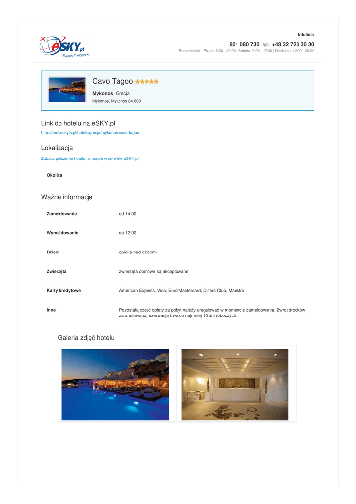 Infolinia 801 080 730 lub +48 32 728 30 30 Poniedziałek - Piątek: 8:00 - 22:00 | Sobota: 9:00 - 17:00 | Niedziela: 12:00 - 20:00 Cavo Tagoo Mykonos, Grecja Mykonos, Mykonos 84 600 Link do hotelu na eSKY.pl http://onet.eskyts.pl/hotele/grecja/mykonos-cavo-tagoo Lokalizacja Zobacz położenie hotelu na mapie w serwisie eSKY.pl Okolica Ważne informacje Zameldowanie od 14:00 Wymeldowanie do 12:00 Dzieci opieka nad dziećmi Zwierzęta zwierzęta domowe są akceptowane Karty kredytowe American Express, Visa, Euro/Mastercard, Diners Club, Maestro Inne Pozostałą część opłaty za pobyt należy uregulować w momencie zameldowania. Zwrot środków za anulowaną rezerwację trwa co najmniej 10 dni roboczych. Galeria zdjęć hotelu Hotele – Bilety lotnicze – Tanie linie lotnicze – Ubezpieczenia Podróżne