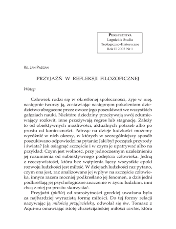 Przyjaźń w refleksji filozoficznej 159 Perspectiva Legnickie Studia Teologiczno-Historyczne Rok II 2003 Nr 1 Ks. Jan Pazgan Przyjaźń w refleksji filozoficznej Wstęp Człowiek rodzi się w określonej społeczności, żyje w niej, następnie tworzy ją, zostawiając następnym pokoleniom dziedzictwo ubogacone przez owoce jego poszukiwań we wszystkich gałęziach nauki. Niektóre dziedziny przeżywają swój zdumiewający rozkwit, inne przeżywają regres lub stagnację. Zależy to od obiektywnych możliwości, aktualnych potrzeb albo po prostu od konieczności. Patrząc na dzieje ludzkości możemy wyróżnić w nich okresy, w których w szczególniejszy sposób poszukiwano odpowiedzi na pytanie: Jaki był początek przyrody i świata? Jak osiągnąć szczęście i w czym je upatrywać albo na przykład: Czym jest wolność, przy jednoczesnym uzależnieniu jej rozumienia od subiektywnego podejścia człowieka. Jedną z rzeczywistości, która bez wątpienia łączy wszystkie epoki rozwoju ludzkości jest miłość. W dziejach ludzkości raz pytano, czym ona jest, raz analizowano jej wpływ na szczęście człowieka, innym razem mocniej podkreślano jej fenomen, a dziś jedni podkreślają jej psychologiczne znaczenie w życiu ludzkim, inni chcą z niej po prostu skorzystać. Przyjaźń (philía) od starożytności greckiej uważana była za najbardziej wyrazistą formę miłości. Do tej formy relacji nazywając ją miłością przyjacielską, odwołał się św. Tomasz z Aqui-nu omawiając istotę chrześcijańskiej miłości caritas, która 160 Ks. Jan Pazgan jest miłością nadprzyrodzoną. Akwinata jest przekonany co do możliwości relacji przyjacielskiej z Bogiem, która jest udziałem w Boskiej chwale dzięki łasce Bożej. Wyraża ten pogląd jasno w słowach: „Jest rzeczą ewidentną, że miłość nadprzyrodzona (caritas), jest przyjaźnią człowieka z Bogiem”1. Nadprzyrodzoność to boski charakter miłości przyjacielskiej, jednakże duża część, tego pojęcia rozwija się i realizuje na płaszczyźnie naturalnej ludzkich relacji. W dziejach historii filozofii, szczególnie zaś u Arystotelesa, znajdujemy co najmniej kilka takich naturalnych elementów przyjaźni, które zajmują znaczące miejsce w spekulacji naukowej. Elementy te występują w relacjach osób dobrych poszukujących mądrości i odznaczających się doskonałością etyczną. Wymienić tu należy: podobieństwo lub jedność (unità); życzliwość, czyli pragnienie dobra dla przyjaciela (benevolenza) i wzajemność relacji (reciprocità). Według Arystotelesa są to jednocześnie warunki istnienia przyjaźni. Przyjaźń oparta na tego typu założeniach pogłębia zapał naukowy wśród przyjaciół, pobudza do odpowiedzialności za samego siebie i innych oraz nakazuje posłuszeństwo wobec prawd najwyższych. Jest ona dla Arystotelesa dobrem wyższym od dóbr indywidualnych, a niższym tylko od najwyższego szczęścia czystej kontemplacji2. Dojrzała przyjaźń jako relacja jest umiejętnością zachowywania i trwania w dobrych relacjach, dlatego Stagiryta często mówi o niej w kategoriach cnoty. Skoro, aż tak wysoko ceniona była w starożytności przyjaźń, zapytajmy się cóż to za rzeczywistość, skoro mieści w swej przestrzeni boskie i ludzkie cechy? Cóż to za relacja, która łączy między sobą ludzi dobrych, żyjących według cnót męstwa, karności, wyrzeczenia, sumienności, zdobywających mądrość i kontemplujących odwieczne prawdy, by w ich świetle porządkować całość życia prywatnego i państwowego? Spójrzmy na to zagadnienie poprzez pryzmat refleksji filozoficznej, z którą mamy do czynienia u klasyków filozofii. 1 Tomasz z Akwinu. Suma Teologiczna. II-II, q. 23, a. 1. 2 L. F. Pizzolato. L’idea di amicizia nel mondo antoco Przyjaźń w refleksji filozoficznej 161 I. Idea przyjaźni w świecie antycznym. Od najdawniejszych czasów stwierdza się obecność tej szczególnej relacji międzyosobowej i podkreśla się w niej raz w sposób jasny, innym razem w mniej wyraźny, wyższość uczuciową i moralną w odniesieniu do relacji pokrewieństwa3. W niektórych starożytnych mitach nawet pokrewieństwo nie było powodem rozwoju pozytywnych charakterów na bazie zaufania i mi-łości, ale raczej pomnażało negatywne impulsy, takie jak na przykład bunt lub nienawiść. Chronos pożerał swoje dzieci, Jowisz zabił swego ojca, bratobójstwo cechuje początek miasta ziemskiego czy to w tradycji biblijnej czy to w tradycji rzymskiej. Wy-daje się, że tylko nad przyjaźnią potęga zła nie roztoczyła swej władzy. 1. Etymologia. Grecki termin przyjaźń (philía), obejmował bardzo szeroką treść. I tak wyrażał sytuację udzielającego gościny w odniesieniu do gościa (phíle dora); dom tego, który zachowuje się po przyjacielsku (phíle doma); schronisko, dom, w którym ptak chroni swe pisklęta, (phíla oikía); wyraz ten określał także ziemię ojczystą opłakiwaną z nostalgią przez tych, którzy byli zmuszeni walczyć daleko od niej (phíle gaía); ziemię rodzinną z ciepłem domu (phílen es patrida gaían), w tym sensie wyraża także siłę uczuć; określał także smutek po stracie przyjaciela broni tzn. tego, kto dzielił wspólny namiot i stół, a w batalii jest blisko przyjaciela gotowy w każdej chwili przyjść mu z pomocą. Wreszcie wyrażał pewnego rodzaju relacje ludzkie z bogami okazywane poprzez gest wzniesionych rąk (phílos kheiros). W sumie termin ten określał jakąś szczególną relację międzyosobową. 2. Przyjaźń u Platona. classico e cristiano. Torino 1993 s. 45. 162 Ks. Jan Pazgan Platońska przyjaźń to na pierwszym miejscu relacja wspólnotowa pomiędzy podobnymi. W tym sensie łączy ona między sobą mędrców, czyli filozofów poszukujących najwyższych prawd oraz aspirantów mądrości, jak też ludzi, którzy starają się żyć w sprawiedliwości i ładzie. Nie wyczerpuje się jednak na płaszczyźni
