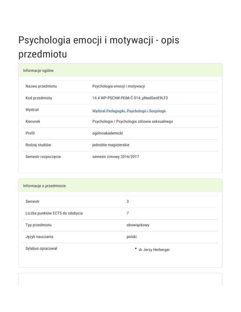 Psychologia emocji i motywacji - opis przedmiotu Informacje ogólne Nazwa przedmiotu Psychologia emocji i motywacji Kod przedmiotu 14.4-WP-PSChM-PEiM-Ć-S14_pNadGenE9LF3 Wydział Wydział Pedagogiki, Psychologii i Socjologii Kierunek Psychologia / Psychologia zdrowia seksualnego Profil ogólnoakademicki Rodzaj studiów jednolite magisterskie Semestr rozpoczęcia semestr zimowy 2016/2017 Informacje o przedmiocie Semestr 3 Liczba punktów ECTS do zdobycia 7 Typ przedmiotu obowiązkowy Język nauczania polski Sylabus opracował dr Jerzy Herberger Formy zajęć Forma Liczba godzin w Liczba godzin w Liczba godzin w Liczba godzin w Forma zajęć semestrze tygodniu semestrze tygodniu zaliczenia (stacjonarne) (stacjonarne) (niestacjonarne) (niestacjonarne) 30 2 18 1,2 Ćwiczenia Zaliczenie na ocenę Wykład 30 2 18 1,2 Egzamin Cel przedmiotu Celem kursu jest zrozumienie powstawania procesów emocjonalnych, odróżnianie emocji pierwotnych od wtórnych, odróżnianie emocji od reakcji instynktownych, odróżniania emocji spontanicznych od tych, które są udawane w celu osiągnięcia określonych celów. Ponadto uczestnik kursu ma zdobyć wiedzę odnośnie mechanizmów powstawania procesów motywacyjnych, rozróżniania ich typów, kształtowania i wzbudzania motywacji osiągnięć, wpływu procesów motywacyjnych na funkcjonowanie jednostki jak i grup społecznych. Zdobyta wiedza ma pozwolić słuchaczom nabyć podstawową umiejętność interpretacji funkcjonowania człowieka w kontekście przeżywanych przez niego emocji oraz umiejętnego łączenia zależności pomiędzy emocjami a poznaniem człowieka, umiejętność implikowania procesów motywacyjnych z procesów emocjonalnych Uświadomienie, że procesy emocjonalne i motywacyjne stanowią podstawowy wymiar obok poznawczych w funkcjonowaniu człowieka, kierowaniu jego zachowaniem i wpływaniu na budowę osobowości człowieka. Wymagania wstępne Wymogiem przystąpienia do kursu jest opanowanie wiedzy z zakresu procesów poznawczych, współczesnej myśli psychologicznej oraz biologicznych mechanizmów zachowania. Zakres tematyczny Mechanizmy wzbudzania emocji - aspekt psychologiczny i biologiczny. Integracja obu podejść - systemy: neuronalny, sensomotoryczny, motywacyjny i poznawczy. Emocje wzbudzane w sposób uświadamiany i nieuświadamiany przez podmiot. Emocje podstawowe i pochodne. Problem powstawania emocji pochodnych. Różnice między poszczególnymi stanami afektywnymi: nastrój, emocje, afekt, pobudzenie. Zaburzenia emocjonalne. Ekspresja emocji. Twarz w ekspresji emocji. Kulturowe aspekty ekspresji emocji. Relacje emocji z poznaniem i zachowaniem. Pierwotność emocji versus poznania. Współzależność emocji i poznania. Automatyczna i podmiotowa regulacja emocji i nastroju. Klasyczne teorie emocji. Poznawcze teorie emocji. Podstawowe podejścia do motywacji (etologiczne, psychodynamiczne, behawiorystyczne, poznawcze, humanistyczne, topologiczne). Mechanizmy leżące u podstaw motywacji. Procesy afektywne, jako mechanizm motywacyjny. Procesy poznawcze, jako mechanizm motywacyjny. Motywacja w przebiegu zachowania: uruchomienie zachowania, podtrzymanie aktywności, zaniechanie versus zakończenie działania. Motywacja wewnętrzna i zewnętrzna. Czynniki osłabiające motywację wewnętrzną. Motywacja osiągnięć. Rozwojowe i kulturowe aspekty motywacji osiągnięć. Motywacje związane z obrazem własnej osoby. Motywacje samoaktualizacji i samorozwoju. Przywracanie i zaburzanie istniejącej równowagi. Motywacja zadaniowa. Plany działania. Perspektywa czasowa w procesach motywacyjnych. Motywacje symultaniczne i hierarchiczne. Konflikty motywacyjne. Inni ludzie w procesach motywacyjnych Metody kształcenia Wykład konwersatoryjny obejmuje 30 godzin lekcyjnych w trakcie jednego semestru. Wiedza z zakresu psychologii emocji i motywacji prezentowana jest w formie wykładu z wykorzystaniem technik multimedialnych (prezentacje multimedialne obejmujące wszystkie prezentowane zagadnienia). Ćwiczenia opierają się na pogadankach, symulacjach, metodzie przypadków, metodach ekspresyjnych, inscenizacjach i pracy w grupach. Efekty kształcenia i metody weryfikacji osiągania efektów kształcenia Opis efektu Symbole Metody weryfikacji Forma zajęć efektów W wyniku przeprowadzonych zajęć student powinien K_W01 egzamin - być w stanie: - scharakteryzować podstawowe terminy K_W03 ustny, związane z psychologią emocji i motywacji; - znać K_W06 opisowy, wzajemne powiązania psychologii emocji i motywacji z K_W09 testowy i innymi dyscyplinami psychologii w tym z psychologią Wykład inne poznawczą, osobowości, społeczną i kliniczną; scharakteryzować główne nurty psychologii, orientacje badawcze i metodologię badań psychologii emocji i motywacji; - scharakteryzować współczesne ujęcia emocji i motywacji. - sprawnie i precyzyjnie wyjaśniać w oparciu o wiedzę K_U05 bieżąca teoretyczną zjawiska związane z procesami kontrola na emocjonalnymi i motywacyjnymi; - twórczego i zajęciach Ćwiczenia indywidualnego podejścia do procesów emocjonalnych i motywacyjnych opartego na podstawach teoretycznych i etycznych. W wyniku przeprowadzonych zajęć student K_K02 bieżąca ma/wykazuje: - pogłębioną świadomość swojej wiedzy kontrola na na temat emocji i motywacji z koniecznością zajęciach Ćwiczenia wzbogacania jej o nowe doniesienia naukowe; Warunki zaliczenia Do zaliczenia wykładu wymagana jest zdanie egzaminu końcowego z progiem procentowym. Warunkiem przystąpienia do egzaminu jest pozytywna ocena z ćwiczeń. Ocena z ćwiczeń opierać się będzie na ocenie aktywności na zajęciach i pracy pisemnej. Na ocenę końcową składa się średnia z oceny z ćwiczeń i egzaminu. Warunkiem zaliczenia jest pozytywna ocena z ćwiczeń i wykładów. Obciążenie pracą Obciążenie pracą Studia Studia niestacjonarne stacjonarne (w godz.) (w godz.) Godziny kontaktowe (udział w zajęciach; konsultacjach; egzaminie, 