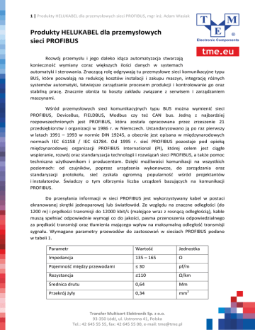 1 | Produkty HELUKABEL dla przemysłowych sieci PROFIBUS, mgr inż. Adam Wasiak Produkty HELUKABEL dla przemysłowych sieci PROFIBUS Rozwój przemysłu i jego daleko idąca automatyzacja stwarzają konieczność wymiany coraz większych ilości danych w systemach automatyki i sterowania. Znaczącą rolę odgrywają tu przemysłowe sieci komunikacyjne typu BUS, które pozwalają na redukcję kosztów instalacji i zakupu maszyn, integrację różnych systemów automatyki, łatwiejsze zarządzanie procesem produkcji i kontrolowanie go oraz stabilną pracę. Znacznie obniża to koszty zakładu związane z serwisem i zarządzaniem maszynami. Wśród przemysłowych sieci komunikacyjnych typu BUS można wymienić sieci PROFIBUS, DeviceBus, FIELDBUS, Modbus czy też CAN bus. Jedną z najbardziej rozpowszechnionych jest PROFIBUS, która została opracowana przez zrzeszenie 21 przedsiębiorstw i organizacji w 1986 r. w Niemczech. Ustandaryzowano ją po raz pierwszy w latach 1991 – 1993 w normie DIN 19245, a obecnie jest opisana w międzynarodowych normach IEC 61158 / IEC 61784. Od 1995 r. sieć PROFIBUS pozostaje pod opieką międzynarodowej organizacji PROFIBUS International (PI), której celem jest ciągłe wspieranie, rozwój oraz standaryzacja technologii i rozwiązań sieci PROFIBUS, a także pomoc techniczna użytkownikom i producentom. Dzięki możliwości komunikacji na wszystkich poziomach: od czujników, poprzez urządzenia wykonawcze, do zarządzania oraz standaryzacji protokołu, sieć zyskała ogromną popularność wśród projektantów i instalatorów. Świadczy o tym olbrzymia liczba urządzeń bazujących na komunikacji PROFIBUS. Do przesyłania informacji w sieci PROFIBUS jest wykorzystywany kabel w postaci ekranowanej skrętki jednoparowej lub światłowód. Ze względu na znaczne odległości (do 1200 m) i prędkości transmisji do 12000 kbit/s (malejące wraz z rosnącą odległością), kable muszą spełniać odpowiednie wymogi co do jakości, pasma przenoszenia odpowiedzialnego za prędkość transmisji oraz tłumienia mającego wpływ na maksymalną odległość transmisji sygnału. Wymagane parametry przewodów do zastosowań w sieciach PROFIBUS podano w tabeli 1. Parametr Wartość Jednostka Impedancja 135 – 165 Ω Pojemność między przewodami ≤ 30 pf/m Rezystancja ≤110 Ω/km Średnica drutu 0,64 Mm Przekrój żyły 0,34 mm2 Transfer Multisort Elektronik Sp. z o.o. 93-350 Łódź, ul. Ustronna 41, Polska Tel.: 42 645 55 55, fax: 42 645 55 00, e-mail: [email protected] 2 | Produkty HELUKABEL dla przemysłowych sieci PROFIBUS, mgr inż. Adam Wasiak Producenci kabli, w tym także firma HELUKABEL, oferują specjalistyczne kable dedykowane do sieci PROFIBUS. W ofercie HELUKABEL znajduje się m.in. podwójnie ekranowany kabel „PROFIBUS L2 Indoor” przeznaczony do zastosowań wewnątrz budynków, o budowie 1x2x0,64 mm, żyle jednodrutowej i izolacji zewnętrznej z PVC. Kolejny produkt z portfolio firmy, „PROFIBUS L2 Outdoor”, jest odporny na warunki atmosferyczne dzięki izolacji zewnętrznej wykonanej z polietylenu (PE) i może być użyty na zewnątrz budynków (Rys. 1). Warto podkreślić, że izolacja przewodu jest bezhalogenowa, co sprawia, że w procesie spalania wydziela się mniej dymu i substancji żrących powodujących korozję niż w przypadku kabli ze standardową izolacją PVC. Zapewnia to bezpieczeństwo dla ludzi i urządzeń wewnątrz pomieszczeń, w których są zamontowane instalacje z wykorzystaniem tych kabli. Rys. 1: Przewody PROFIBUS L2 Indoor (u góry) i PROFIBUS L2 Outdoor (na dole) Wśród przewodów do sieci PROFIBUS firmy HELUKABEL znajdują się także przewody serii „Profibus L2 Direct Burial”, przeznaczone do bezpośredniego układania w ziemi. Dostępna jest wersja z opancerzeniem w postaci taśmy stalowej lub bez. Obie wersje posiadają izolację zewnętrzną wykonaną z polietylenu (PE), zapewniającą odporność na warunki atmosferyczne oraz panujące pod ziemią. Sieć PROFIBUS jest wykorzystywana do transmisji danych w warunkach przemysłowych, dlatego w ofercie firmy HELUKABEL znajdziemy także przewód, który stosuje się głównie w halach produkcyjnych. „PROFIBUS L2 Industry” (Rys. 2) posiada płaszcz zewnętrzny wykonany z poliuretanu (PUR), dzięki któremu jest odporny na działanie czynników atmosferycznych, większość związków chemicznych i oleje. Rys. 2: Przewód PROFIBUS L2 Industry Sieć PROFIBUS zapewnia komunikację m.in. pomiędzy czujnikami i urządzeniami wykonawczymi, z których zazwyczaj część znajduje się w ruchu. HELUKABEL oferuje dla tych zastosowań przewody o żyle wykonanej z kilku lub kilkunastu cienkich drucików (tzw. lince) i średnicy 0,64 mm. Mowa tutaj m.in. o przewodzie „Profibus L2 7-wire”, którego żyły są zbudowane z 7 drutów o średnicy 24AWG. Stosuje się go w ruchomych, ale stosunkowo rzadko poruszających się częściach sieci PROFIBUS. Kolejnym przewodem tego rodzaju jest Transfer Multisort Elektronik Sp. z o.o. 93-350 Łódź, ul. Ustronna 41, Polska Tel.: 42 645 55 55, fax: 42 645 55 00, e-mail: [email protected] 3 | Produkty HELUKABEL dla przemysłowych sieci PROFIBUS, mgr inż. Adam Wasiak „Profibus L2 Drag Chain” o budowie żyły 19x24AWG, który jest używany w często poruszających się częściach maszyn. Przewody „Profibus L2 Drag Chain” są układane w prowadnicach łańcuchowych zapewniających odpowiednie prowadzenie kabla, promienie gięcia i ochronę mechaniczną przewodu. Produkty serii „Profibus L2 Drag Chain” posiadają płaszcz zewnętrzny wykonany z poliuretanu (PUR), dzięki czemu są odporne na warunki środowiskowe (obecność związków chemicznych, olejów, ozonu) panujące w pobliżu części wykonawczych lub czujników. Dotychczas omówione przewody są przeznaczone do stosowania w warunkach temperaturowych, których zakres mieści się przedziale -40°C ÷ +70°C, poza przewodem „Profibus L2 7-wire”, którego dopu