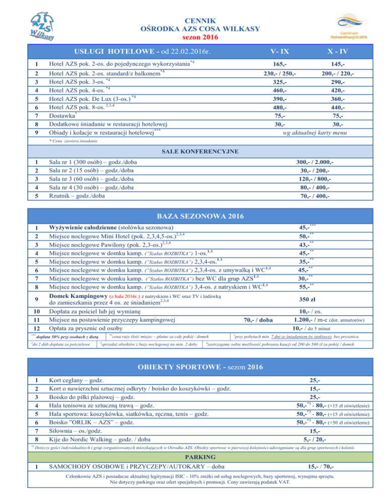 CENNIK OŚRODKA AZS WILKASY - TURYSTYKA INDYWIDUALNA