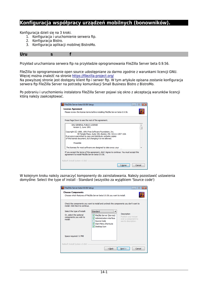 Konfiguracja współpracy urządzeń mobilnych (bonowników). Konfiguracja dzieli się na 3 kroki. 1. Konfiguracja i uruchomienie serwera ftp. 2. Konfiguracja Bistro. 3. Konfiguracja aplikacji mobilnej BistroMo. Uru s f Przykład uruchamiana serwera ftp na przykładzie oprogramowania FileZilla Server beta 0.9.56. FileZilla to oprogramowanie open source udostępniane za darmo zgodnie z warunkami licencji GNU. Więcej można znaleźć na stronie https://filezilla-project.org/ Na powyższej stronie jest dostępny klient ftp i serwer ftp. W tym artykule opisana zostanie konfiguracja serwera ftp FileZilla Server na potrzeby komunikacji Small Business Bistro z BistroMo. Po pobraniu i uruchomieniu instalatora FileZilla Server pojawi się okno z akceptacją warunków licencji którą należy zaakceptować. W kolejnym kroku należy zaznaczyć komponenty do zainstalowania. Należy pozostawić ustawienia domyślne: Select the type of install - Standard (wszystko za wyjątkiem 'Source code') 14-1 Następny krok to wybór lokalizacji instalacji – pozostawiamy domyślną. Teraz należy określić ustawienia startowe czyli jak ma startować obsługa ftp. Tu do wyboru mamy 3 opcje: usługa Windows ze startem automatycznym, usługa Windows ze startem ręcznym, uruchomienie obsługi ftp z autostartu. Pozostawiamy ustawienia domyślne czyli usługa Windows ze startem automatycznym (przy starcie systemu). Dodatkowym ustawieniem jest tu port administratora interfejsu FileZilla Server – pozostawiamy bez zmian. UWAGA – NIE JEST TO PORT NA KTÓRYM BĘDZIE DZIAŁAŁ SERWER FTP. Kolejne okno to ustawienia startowe dla interfejsu (program do konfiguracji ftp) FileZilla Server – tu zmieniamy ustawienia domyślne na 'Start manually' i klikamy 'Install'. 14-2 Po zainstalowaniu oprogramowania pojawi się okno (FileZilla Server Interface) za pomocą którego można skonfigurować serwer ftp. Należy wybrać ikonę zakreśloną na górnym obrazku 'Displays the user accounts dialog' za pomocą której dodamy użytkownika ftp oraz skonfigurujemy katalog wymiany. Aby dodać użytkownika w sekcji 'Page:' leży wybrać 'General' i w sekcji 'Users' kliknąć 'Add'. 14-3 Następnie należy wpisać nazwę użytkownika – najlepiej 'anonymous'. Aby skonfigurować katalog wymiany w sekcji 'Page:' wybieramy 'Shared folders' i w sekcji 'Shared folders' kliknąć 'Add'. Po wybraniu 'Add' w sekcji 'Shared folders' należy wybrać katalog wymiany 'C:\inetpub\ftproot'. Jeśli nie ma takiego katalogu to należy go stworzyć ręcznie (katalog z podkatalogiem). 14-4 Ustawiony katalog należy zapamiętać gdyż użyjemy go do konfiguracji wymiany danych z urządzeniami mobilnymi w Small Business Bistro. Po ustawieniu katalogu wymiany należy ustawić uprawnienia do tego katalogu. UWAGA Należy pamiętać aby był dostęp do serwera ftp z innych komputerów w tym z urządzeń mobilnych – należy skonfigurować porty, zaporę, program antywirusowy i ustawić pełne uprawnienia dla użytkownika Windows do wykorzystywanych katalogów (w tym przypadku c:\inetpub\ftproot\*.*). Kon Bi W Small Business w menu: Bistro->Konfiguracja->Konfiguracja współpracy z urządzeniami mobilnymi należy wpisać wcześniej skonfigurowany katalog wymiany w konfiguracji serwera ftp – 'C:\inetpub\ftproot'. W y mag a ni – aby BistroMo poprawnie współpracowało wymagane jest, aby w Bistro zdefiniować przynajmniej: • jednego kelnera, który ma dostęp do obsługi bonowników oraz wprowadzić mu osobne hasło do logowania na bonowniku 14-5 • jeden towar • jedną grupę towarową • jeden stolik Komunikacj – uruchomienie opcji Menu: Bistro->Obsługa palmtopów (opcja jest też dostępna przez uruchomienie programu z parametrem „-wh=palm”) rozpoczyna proces komunikacji z bonownikami. W dialogu pokazywane są aktualne zadania wykonywane pomiędzy Bistro o poszczególnymi urządzeniami. Kon aplikacji mob Bi (A Aby skonfigurować aplikację mobilną BistroMo na ekranie logowania należy wybrać klawisz 'Menu' a następnie 'Konfiguracja dostępowa'. Tu wpisujemy adres serwera, numer urządzenia (od 1 do ilości posiadanych licencji BistroMo lub 1 w przypadku wersji demo) oraz zaznaczamy 'Tryb pasywny FTP'. W przypadku skonfigurowania innego użytkownika niż 'anonymous' na serwerze ftp jest wymagane podanie użytkownika i hasła. 14-6