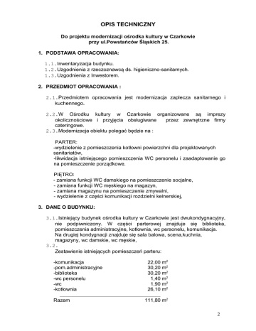 OPIS TECHNICZNY Do projektu modernizacji ośrodka kultury w Czarkowie przy ul.Powstańców Śląskich 25. 1. PODSTAWA OPRACOWANIA: 1.1.Inwentaryzacja budynku. 1.2.Uzgodnienia z rzeczoznawcą ds. higieniczno-sanitarnych. 1.3.Uzgodnienia z Inwestorem. 2. PRZEDMIOT OPRACOWANIA : 2.1.Przedmiotem opracowania jest modernizacja zaplecza sanitarnego i kuchennego. 2.2.W Ośrodku kultury w Czarkowie organizowane są imprezy okolicznościowe i przyjęcia obsługiwane przez zewnętrzne firmy cateringowe. 2.3.Modernizacja obiektu polegać będzie na : PARTER: -wydzielenie z pomieszczenia kotłowni powierzchni dla projektowanych sanitariatów, -likwidacja istniejącego pomieszczenia WC personelu i zaadaptowanie go na pomieszczenie porządkowe. PIĘTRO: - zamiana funkcji WC damskiego na pomieszczenie socjalne, - zamiana funkcji WC męskiego na magazyn, - zamiana magazynu na pomieszczenie zmywalni, - wydzielenie z części komunikacji rozdzielni kelnerskiej, 3. DANE O BUDYNKU: 3.1.Istniejący budynek ośrodka kultury w Czarkowie jest dwukondygnacyjny, nie podpiwniczony. W części parterowej znajduje się biblioteka, pomieszczenia administracyjne, kotłownia, wc personelu, komunikacja. Na drugiej kondygnacji znajduje się sala balowa, scena,kuchnia, magazyny, wc damskie, wc męskie, 3.2. Zestawienie istniejących pomieszczeń parteru: -komunikacja -pom.administracyjne -biblioteka -wc personelu -wc -kotłownia Razem 22,00 m2 30,20 m2 30,20 m2 1,40 m2 1,90 m2 26,10 m2 111,80 m2 2 3.3.Zestawienie istniejących pomieszczeń piętra: -klatka schodowa -komunikacja -wc damskie -wc męskie -sala balowa -scena -pomieszczenia na sprzęt -magazyn -kuchnia -magazyn 8,80 m2 16,10 m2 6,20 m2 5,20 m2 153,80 m2 24,40 m2 7,90 m2 3,90 m2 31,30 m2 5,90m2 Razem 263,50 m2 Powierzchnia zabudowy Kubatura 296,00 m2 2250,00m3 3.4.Zestawienie projektowanych pomieszczeń : Parter -komunikacja -pom.administracyjne -biblioteka -pomieszczenie porządkowe -wc -kotłownia -wc damskie -wc męskie Razem 22,00 m2 30,20 m2 30,20 m2 1,40 m2 1,90 m2 9,50 m2 5,90 7,00 m2 108,10 m2 Piętro -klatka schodowa -komunikacja -pom.socjalne -magazyn -sala balowa -scena -pomieszczenia na sprzęt -magazyn -kuchnia -zmywalnia -rozdzielnia kelnerska 8,80 m2 11,60 m2 6,20 m2 5,20 m2 153,80 m2 24,40 m2 7,90 m2 3,90 m2 31,30 m2 5,90m2 4,30 Razem 263,30 m2 3 Powierzchnia zbudowy Kubatura istniejąca 2250,00m3 3.5.Technologia sali cateringowej : W przedmiotowym lokalu serwowane będą napoje zimne i gorące, alkoholowe i bezalkoholowe, dania zimne i gorące przygotowywane przez firmę cateringową. Pomieszczenie zmywalni wyposażone jest w zmywarkę do mycia naczyń 95*, jednokomorowy zlewozmywak, młynek koloidalny, regał przelotowy na naczynia; w kuchni znajdują się: , trzy zlewozmywaki, umywalka do mycia rąk, piec, lada, stół, okap kuchenny, lodówka , regały. W pomieszczeniu porządkowym znajdują się zlew gospodarczy do pobierania wody (h od posadzki 50 cm) oraz szafa na środki czystości, w pomieszczeniu socjalnym znajduje się zlew jednokomorowy, stolik i taborety. 5. UZBROJENIE TECHNICZNE OBIEKTU 5.1. Obiekt wyposażony jest w przyłącza: - wody pitnej z sieci miejskiej, - gazu ziemnego z sieci miejskiej - kablową linię NN kabla elektroenergetycznego, - kanalizacji sanitarnej z kolektora sieci miejskiej, - linii napowietrznej teletechnicznej, pozwalające na zapewnienie dostaw wszelkich mediów dla planowanej przebudowy. Instalacje wod -kan i elektryczna w obrębie działki są własnością inwestora. Powyższe dane potwierdzają protokoły odbioru instalacji. 5.2. Zasilanie w wodę Przewiduje się, że woda do rozbudowywanych pomieszczeń doprowadzona będzie z istniejącego układu zasilania w wodę z wA 63. Zapotrzebowanie w wodę na cele bytowe należy przyjąć w ilości: Qmaxh = 0,20 m³/h Qs = 3,30 l/s - max. godzinowe zapotrzebowanie w wodę w m³/h - max. sekundowy rozbiór wody. W związku z powyższym nie zakłada się przebudowy układu zasilania w wodę. 5.3. Kanalizacja sanitarna Odprowadzenie ścieków sanitarnych z zainstalowanych w pomieszczeniach urządzeń odbywać się będzie na dotychczasowych zasadach a mianowicie istniejącym, wewnętrznym układem kanalizacji sanitarnej ks 160, połączonym ze studnią K2na kolektorze kanalizacji sanitarnej. o5 5.4. Odprowadzenie wód deszczowych. Wody deszczowe z połaci dachowej odprowadzane są do kolektora kanalizacji sanitarnej. 5.5. Zasilanie w energię elektryczną. Dostawa energii elektrycznej do budynku następuje z istniejącej złącza kablowego sieci niskiego napięcia. 4 Zasilanie w gaz. Pomieszczenia objęte opracowaniem nie wymagają zasilania w gaz. 5.6.Ogrzewanie i wentylacja Zakłada się ogrzewanie na dotychczasowych zasadach, ze źródła wewnętrznego. Wentylacja grawitacyjna i mechaniczna w salach i pomieszczeniach wc. 5.7.Instalacja odgromowa Budynek jest wyposażony w instalację odgromową. PROJEKTOWANE ROZWIĄZANIA ARCHITEKTONICZNO – BUDOWLANE 6.1.KONSTRUKCJA Ściany i narożniki w ciągach komunikacyjnych należy zabezpieczyć podtynkowo kątownikiem przed uszkodzeniami mechanicznymi. Ściany działowe Ściany działowe projektowane z płyt gipsowo - kartonowych na ruszcie stalowym gr. 7,5 cm – 10,0 cm. wypełnienie z wełny mineralnej. Dodatkowo należy obudować piony instalacyjne i co w postaci pilastrów z płyt GK. W pomieszczeniach „mokrych” stosować płyty GK – wodoodporne. 6.2. POSADZKI I PODŁOGI W związku z przeznaczeniem pomieszczeń na czasowy pobyt ludzi należy wykonać posadzki z materiałów trwałych o powierzchniach gładkich, antypoślizgowych, jako zmywalne, nienasiąkliwe i odporne na działanie środków myjąco – dezynfekujących. Posadzkę w projektowanych sanitariatach wykonać z płytek ceramicznych antypoślizgowych. 6.3.TYNKI I OKŁADZINY ŚCIAN Tynki wewnętrzne istniejące – cementowe do częściowego uzupełnienia. Tynki w miejscach uzupełnień cementowo - wapienne kat. III z gładzią gipsową. Okładziny 