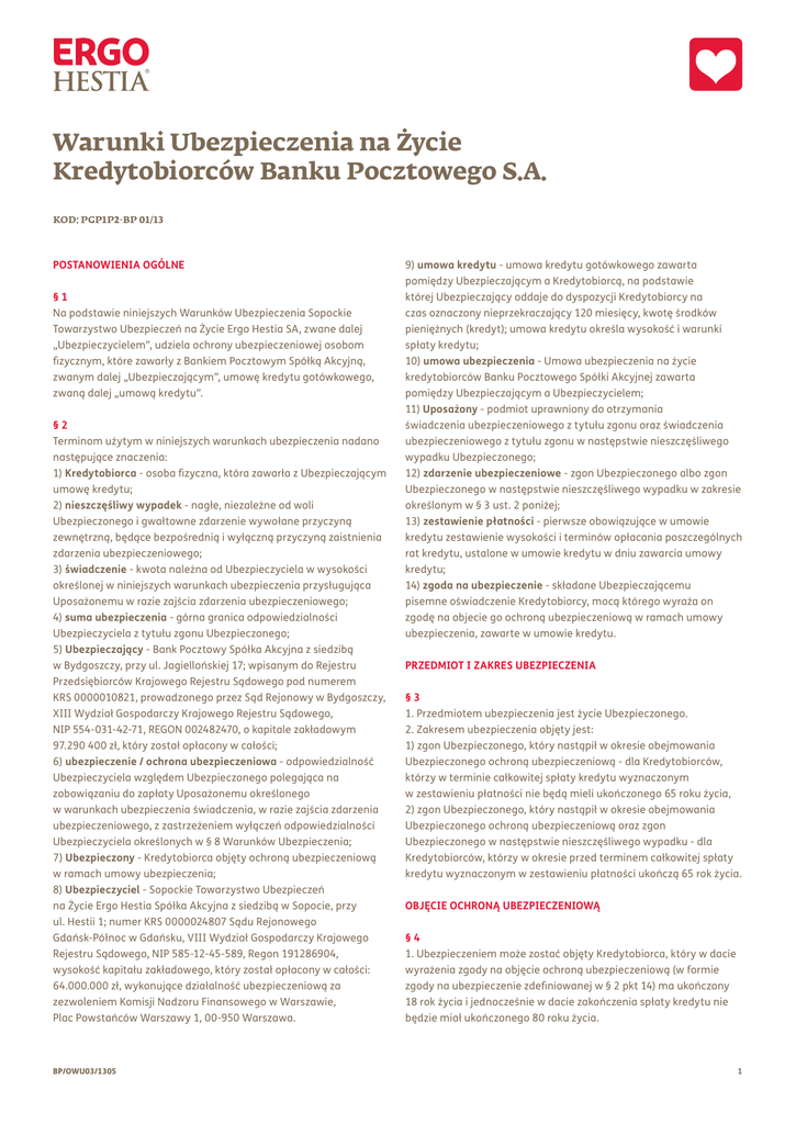 Warunki Ubezpieczenia na Życie Kredytobiorców Banku Pocztowego S.A. kod: PGP1P2-BP 01/13 POSTANOWIENIA OGÓLNE §1 Na podstawie niniejszych Warunków Ubezpieczenia Sopockie Towarzystwo Ubezpieczeń na Życie Ergo Hestia SA, zwane dalej „Ubezpieczycielem”, udziela ochrony ubezpieczeniowej osobom fizycznym, które zawarły z Bankiem Pocztowym Spółką Akcyjną, zwanym dalej „Ubezpieczającym”, umowę kredytu gotówkowego, zwaną dalej „umową kredytu”. §2 Terminom użytym w niniejszych warunkach ubezpieczenia nadano następujące znaczenia: 1) Kredytobiorca - osoba fizyczna, która zawarła z Ubezpieczającym umowę kredytu; 2) nieszczęśliwy wypadek - nagłe, niezależne od woli Ubezpieczonego i gwałtowne zdarzenie wywołane przyczyną zewnętrzną, będące bezpośrednią i wyłączną przyczyną zaistnienia zdarzenia ubezpieczeniowego; 3) świadczenie - kwota należna od Ubezpieczyciela w wysokości określonej w niniejszych warunkach ubezpieczenia przysługująca Uposażonemu w razie zajścia zdarzenia ubezpieczeniowego; 4) suma ubezpieczenia - górna granica odpowiedzialności Ubezpieczyciela z tytułu zgonu Ubezpieczonego; 5) Ubezpieczający - Bank Pocztowy Spółka Akcyjna z siedzibą w Bydgoszczy, przy ul. Jagiellońskiej 17; wpisanym do Rejestru Przedsiębiorców Krajowego Rejestru Sądowego pod numerem KRS 0000010821, prowadzonego przez Sąd Rejonowy w Bydgoszczy, XIII Wydział Gospodarczy Krajowego Rejestru Sądowego, NIP 554-031-42-71, REGON 002482470, o kapitale zakładowym 97.290 400 zł, który został opłacony w całości; 6) ubezpieczenie / ochrona ubezpieczeniowa - odpowiedzialność Ubezpieczyciela względem Ubezpieczonego polegająca na zobowiązaniu do zapłaty Uposażonemu określonego w warunkach ubezpieczenia świadczenia, w razie zajścia zdarzenia ubezpieczeniowego, z zastrzeżeniem wyłączeń odpowiedzialności Ubezpieczyciela określonych w § 8 Warunków Ubezpieczenia; 7) Ubezpieczony - Kredytobiorca objęty ochroną ubezpieczeniową w ramach umowy ubezpieczenia; 8) Ubezpieczyciel - Sopockie Towarzystwo Ubezpieczeń na Życie Ergo Hestia Spółka Akcyjna z siedzibą w Sopocie, przy ul. Hestii 1; numer KRS 0000024807 Sądu Rejonowego Gdańsk-Północ w Gdańsku, VIII Wydział Gospodarczy Krajowego Rejestru Sądowego, NIP 585-12-45-589, Regon 191286904, wysokość kapitału zakładowego, który został opłacony w całości: 64.000.000 zł, wykonujące działalność ubezpieczeniową za zezwoleniem Komisji Nadzoru Finansowego w Warszawie, Plac Powstańców Warszawy 1, 00-950 Warszawa. BP/OWU03/1305 9) umowa kredytu - umowa kredytu gotówkowego zawarta pomiędzy Ubezpieczającym a Kredytobiorcą, na podstawie której Ubezpieczający oddaje do dyspozycji Kredytobiorcy na czas oznaczony nieprzekraczający 120 miesięcy, kwotę środków pieniężnych (kredyt); umowa kredytu określa wysokość i warunki spłaty kredytu; 10) umowa ubezpieczenia - Umowa ubezpieczenia na życie kredytobiorców Banku Pocztowego Spółki Akcyjnej zawarta pomiędzy Ubezpieczającym a Ubezpieczycielem; 11) Uposażony - podmiot uprawniony do otrzymania świadczenia ubezpieczeniowego z tytułu zgonu oraz świadczenia ubezpieczeniowego z tytułu zgonu w następstwie nieszczęśliwego wypadku Ubezpieczonego; 12) zdarzenie ubezpieczeniowe - zgon Ubezpieczonego albo zgon Ubezpieczonego w następstwie nieszczęśliwego wypadku w zakresie określonym w § 3 ust. 2 poniżej; 13) zestawienie płatności - pierwsze obowiązujące w umowie kredytu zestawienie wysokości i terminów opłacania poszczególnych rat kredytu, ustalone w umowie kredytu w dniu zawarcia umowy kredytu; 14) zgoda na ubezpieczenie - składane Ubezpieczającemu pisemne oświadczenie Kredytobiorcy, mocą którego wyraża on zgodę na objecie go ochroną ubezpieczeniową w ramach umowy ubezpieczenia, zawarte w umowie kredytu. PRZEDMIOT I ZAKRES UBEZPIECZENIA §3 1. Przedmiotem ubezpieczenia jest życie Ubezpieczonego. 2. Zakresem ubezpieczenia objęty jest: 1) zgon Ubezpieczonego, który nastąpił w okresie obejmowania Ubezpieczonego ochroną ubezpieczeniową - dla Kredytobiorców, którzy w terminie całkowitej spłaty kredytu wyznaczonym w zestawieniu płatności nie będą mieli ukończonego 65 roku życia, 2) zgon Ubezpieczonego, który nastąpił w okresie obejmowania Ubezpieczonego ochroną ubezpieczeniową oraz zgon Ubezpieczonego w następstwie nieszczęśliwego wypadku - dla Kredytobiorców, którzy w okresie przed terminem całkowitej spłaty kredytu wyznaczonym w zestawieniu płatności ukończą 65 rok życia. OBJĘCIE OCHRONĄ UBEZPIECZENIOWĄ §4 1. Ubezpieczeniem może zostać objęty Kredytobiorca, który w dacie wyrażenia zgody na objęcie ochroną ubezpieczeniową (w formie zgody na ubezpieczenie zdefiniowanej w § 2 pkt 14) ma ukończony 18 rok życia i jednocześnie w dacie zakończenia spłaty kredytu nie będzie miał ukończonego 80 roku życia. 1 2. Kredytobiorca może zostać objęty ochroną ubezpieczeniową w ramach umowy ubezpieczenia wyłącznie na podstawie zgody na ubezpieczenie składanej przy zawieraniu umowy kredytu. 3. Ochroną ubezpieczeniową w związku z zawarciem jednej umowy kredytu może zostać objętych nie więcej niż dwóch Kredytobiorców będących stroną tej samej umowy kredytu. §5 1. Z zastrzeżeniem postanowień ust. 2 poniżej, objęcie ochroną ubezpieczeniową Kredytobiorcy, w odniesieniu do którego kwota kredytu z umowy kredytu przekracza kwotę 100.000 zł (słownie: sto tysięcy złotych), uzależnione jest od wydania indywidualnej zgody przez Ubezpieczyciela. Przed wyrażeniem zgody przez Ubezpieczyciela wymagane jest wypełnienie przez Kredytobiorcę kwestionariusza medycznego, przy czym Ubezpieczyciel zastrzega sobie ponadto prawo do skierowania Kredytobiorcy na badania lekarskie (z wyłączeniem badań genetycznych). Badania lekarskie przeprowadzane są w placówce medycznej wskazanej przez Ubezpieczyciela oraz na koszt Ubezpieczyciela. 2. W przyp