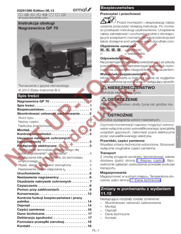 Bezpieczeństwo 03251260 Edition 06.13 D GB NL PL RUS F E Przeczytać i przechować UA ➔ www.docuthek.com Przed montażem i eksploatacją należy uważnie przeczytać niniejszą instrukcję. Po montażu przekazać instrukcję użytkownikowi. Urządzenie należy zainstalować i uruchomić zgodnie z obowiązującymi przepisami i normami. Niniejsza instrukcja jest także dostępna pod adresem www.docuthek.com. Objaśnienie oznaczeń • , , , ...= czynność ▷ = wskazówka Odpowiedzialność Nie przejmujemy żadnej odpowiedzialności za szkody powstałe wskutek nieprzestrzegania instrukcji i wykorzystania urządzenia niezgodnie z przeznaczeniem. Wskazówki bezpieczeństwa Informacje zawarte w instrukcji ważne ze względów bezpieczeństwa są wyróżnione w następujący sposób: Instrukcja obsługi Nagrzewnica GP 70 Tłumaczenie z języka niemieckiego © 2013 Elster-Instromet B.V. NIEBEZPIECZEŃSTWO Sytuacje zagrażające życiu. Spis treści OSTRZEŻENIE Nagrzewnica GP 70 . . . . . . . . . . . . . . . . . . . . . . 1 Spis treści . . . . . . . . . . . . . . . . . . . . . . . . . . . . . 1 Bezpieczeństwo . . . . . . . . . . . . . . . . . . . . . . . . 1 Skontrolować celowość zastosowania . . . . 2 Klucz typu . . . . . . . . . . . . . . . . . . . . . . . . . . . . . . 2 Nazwy części . . . . . . . . . . . . . . . . . . . . . . . . . . . 2 Tabliczka znamionowa . . . . . . . . . . . . . . . . . . . . 2 Montaż . . . . . . . . . . . . . . . . . . . . . . . . . . . . . . . 2 Kontrola szczelności . . . . . . . . . . . . . . . . . . . 3 Usuwanie nakrywek ochronnych (opcjonalnych) . . . . . . . . . . . . . . . . . . . . . . . . . 3 Podłączenie elektryczne . . . . . . . . . . . . . . . . 3 Podłączenie termostatu wnętrzowego dla trybu „Ogrzewanie” i „Wentylacja” . . . . . . . . . . . . 4 Podłączenie kilku nagrzewnic do termostatu wnętrzowego . . . . . . . . . . . . . . . . . . . . . . . . . . . 5 Reset, alarm, wentylator zewnętrzny . . . . . . . . . . 5 Nastawienie zwłoki załączania tE . . . . . . . . . . . . 5 Uruchomienie . . . . . . . . . . . . . . . . . . . . . . . . . 6 Nastawienie nagrzewnicy . . . . . . . . . . . . . . . 6 Osadzanie nakrywek ochronnych . . . . . . . . . . 7 Czyszczenie . . . . . . . . . . . . . . . . . . . . . . . . . . . 8 Pomoc przy zakłóceniach . . . . . . . . . . . . . . . 9 Konserwacja . . . . . . . . . . . . . . . . . . . . . . . . . 12 Kontrola funkcji bezpieczeństwa i pracy palnika . . . . . . . . . . . . . . . . . . . . . . . . . . . . . . . 14 Osprzęt . . . . . . . . . . . . . . . . . . . . . . . . . . . . . . . 14 Części zamienne . . . . . . . . . . . . . . . . . . . . . . 16 Dane techniczne . . . . . . . . . . . . . . . . . . . . . . . 17 Deklaracja zgodności . . . . . . . . . . . . . . . . . . . 17 Formularz przesyłki zwrotnej . . . . . . . . . . . . 18 Kontakt . . . . . . . . . . . . . . . . . . . . . . . . . . . . . . 18 Niebezpieczeństwo utraty życia lub groźba zranienia. OSTROŻNIE CZ TR D Czynności konserwacji i naprawy mogą być wykonywane wyłącznie przez wykwalifikowanego specjalistę urządzeń gazowych, natomiast prace elektryczne przez wykwalifikowanego elektryka. Przeróbki, części zamienne Wszelkie zmiany techniczne wzbronione. Stosować wyłącznie oryginalne części zamienne. Transport Z chwilą przyjęcia produktu skontrolować zakres dostawy (patrz strona 2 (Nazwy części)). Bezzwłocznie zgłaszać uszkodzenia powstałe podczas transportu. Magazynowanie Magazynować w suchym miejscu. Temperatura otoczenia: patrz strona 17 (Dane techniczne). Zmiany w porównaniu z wydaniem 11.12 Następujące rozdziały zostały zmienione: – Skontrolować celowość zastosowania –Montaż –Osprzęt – Dane techniczne –Kontakt PL-1 PL Groźba wystąpienia szkód materialnych. Skontrolować celowość zastosowania Montaż GP 70 Nagrzewnica z bezpośrednim spalaniem gazu w systemie otwartym do ogrzewania budynków inwentarskich w hodowli zwierząt i cieplarni w ogrodnictwie. Nagrzewnicę można eksploatować z gazem ziemnym lub LPG (propan/butan) zależnie od typu i nastawienia. Działanie jest zapewnione wyłącznie w obrębie wskazanych granic, patrz strona 17 (Dane techniczne). Wszelkie wykorzystanie w innych celach jest traktowane jako wykorzystanie niezgodne z przeznaczeniem. Klucz typu Oznaczenie Opis GP Nagrzewnica 70 Moc 70 kW, efektywny zasięg 50 m Zagrożenie dla życia! Przy magazynowaniu gnojownicy powstają gazy, które częściowo pozostają w gnojownicy w postaci rozpuszczonej. Silny ruch gnojownicy wskutek mieszania i płukania powoduje uwolnienie trujących i wybuchowych gazów, np. siarkowodoru i metanu. Przy obecności źródła zapłonu może dojść wówczas do wybuchu uwolnionego gazu. Aby zapobiec szkodom w zakładzie hodowlanym należy przestrzegać poniższych wskazówek: –Przed przystąpieniem do mieszania i spłukiwania gnojownicy wyłączyć nagrzewnicę. –Przy magazynowaniu gnojownicy na zewnątrz pomieszczeń zamknąć zasuwę. –Dmuchawa układu doprowadzania powietrza nie może być częścią zamkniętego systemu rurociągowego. –Należy zapewnić dostateczne przewietrzanie ogrzewanego pomieszczenia. Dla układu mechanicznego odsysania obowiązują następujące wymagania: wydajność co najmniej 10 m3/h powietrza w przeliczeniu na moc zainstalowaną. Przy wentylacji naturalnej pomieszczenie musi zawierać dwa otwory o swobodnej powierzchni otworu 60 x B wyrażonej w cm2. „B” stanowi moc zainstalowaną w kW. Zapewni to pełną wymianę objętości powietrza w pomieszczeniu w ciągu godziny. –Przy wentylacji naturalnej dopuszczalna maksymalna moc całkowita nagrzewnicy wynosi 1 kW na 20 m3 objętości pomieszczenia. –Należy zapewnić odstęp bezpieczeństwa nagrzewnicy względem palnych materiałów – patrz „Położenie zabudowy”. –Celem oceny potencjalnego ogólnego zagrożenia pożarowego należy porozumieć się z ubezpieczycielem prowadzącym ubezpie