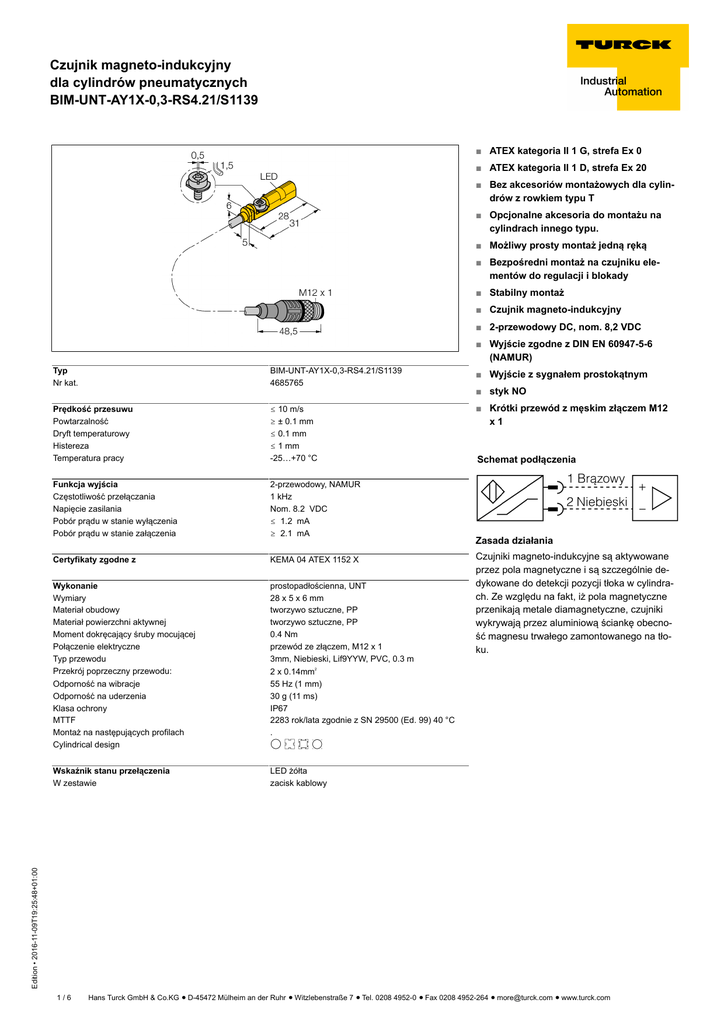 Czujnik magneto-indukcyjny dla cylindrów pneumatycznych BIM-UNT-AY1X-0,3-RS4.21/S1139 ■ ATEX kategoria II 1 G, strefa Ex 0 ■ ATEX kategoria II 1 D, strefa Ex 20 ■ Bez akcesoriów montażowych dla cylindrów z rowkiem typu T ■ Opcjonalne akcesoria do montażu na cylindrach innego typu. ■ Możliwy prosty montaż jedną ręką ■ Bezpośredni montaż na czujniku elementów do regulacji i blokady ■ Stabilny montaż ■ Czujnik magneto-indukcyjny ■ 2-przewodowy DC, nom. 8,2 VDC ■ Wyjście zgodne z DIN EN 60947-5-6 (NAMUR) Typ Nr kat. BIM-UNT-AY1X-0,3-RS4.21/S1139 4685765 ■ Wyjście z sygnałem prostokątnym Prędkość przesuwu Powtarzalność Dryft temperaturowy Histereza Temperatura pracy ð 10 m/s ï ± 0.1 mm ð 0.1 mm ð 1 mm -25…+70 °C ■ Krótki przewód z męskim złączem M12 x1 Funkcja wyjścia Częstotliwość przełączania Napięcie zasilania Pobór prądu w stanie wyłączenia Pobór prądu w stanie załączenia 2-przewodowy, NAMUR 1 kHz Nom. 8.2 VDC ð 1.2 mA ï 2.1 mA Certyfikaty zgodne z KEMA 04 ATEX 1152 X Wykonanie Wymiary Materiał obudowy Materiał powierzchni aktywnej Moment dokręcający śruby mocującej Połączenie elektryczne Typ przewodu Przekrój poprzeczny przewodu: prostopadłościenna, UNT 28 x 5 x 6 mm tworzywo sztuczne, PP tworzywo sztuczne, PP 0.4 Nm przewód ze złączem, M12 x 1 3mm, Niebieski, Lif9YYW, PVC, 0.3 m Odporność na wibracje Odporność na uderzenia Klasa ochrony MTTF Montaż na następujących profilach Cylindrical design 2 x 0.14mm 55 Hz (1 mm) 30 g (11 ms) IP67 2283 rok/lata zgodnie z SN 29500 (Ed. 99) 40 °C . ENKF Wskaźnik stanu przełączenia W zestawie LED żółta zacisk kablowy ■ styk NO Schemat podłączenia Zasada działania Czujniki magneto-indukcyjne są aktywowane przez pola magnetyczne i są szczególnie dedykowane do detekcji pozycji tłoka w cylindrach. Ze względu na fakt, iż pola magnetyczne przenikają metale diamagnetyczne, czujniki wykrywają przez aluminiową ściankę obecność magnesu trwałego zamontowanego na tłoku. Edition • 2016-11-09T19:25:48+01:00 2 1/6 Hans Turck GmbH & Co.KG ñ D-45472 Mülheim an der Ruhr ñ Witzlebenstraße 7 ñ Tel. 0208 4952-0 ñ Fax 0208 4952-264 ñ [email protected] ñ www.turck.com Czujnik magneto-indukcyjny dla cylindrów pneumatycznych BIM-UNT-AY1X-0,3-RS4.21/S1139 Instrukcja montażu / Opis instrukcja montażu Obudowa została specjalnie przygotowana do prostego, odgórnego montażu czujnika w rowku. Czujnik może zostać zainstalowany za pomocą opatentowanej śruby motylkowej w następujący sposób: Śruba i gwint żeński posiadają lewy gwint. Śruba utrzymywana jest we właściwej pozycji przez dwie listewki z tworzywa sztucznego. Gwarantuje to gotowość czujnika do instalacji. Wraz z obrotem zgodnym ze wskazówkami zegara śruba wychodzi z gwintu i blokuje skrzydełka o górną część rowka. W wyniku tego czujnik przemieszcza się w dół i blokuje. Jedna czwarta obrotu (wykonanego za pomocą standardowego śrubokrętu lub klucza imbusowego 1.5 mm) śruby wystarcza do instalacji odpornej na wibracje. Moment skręcający 0.4 Nm wystarcza do bezpiecznego montażu i nie naraża czujnik na uszkodzenie. Czujnik wytrzymuje naprężenia radialne i osiowe oddziaływujące na przewód do F=100N. Zaciski przewodu, które znajdują się w zestawie, umożliwiają odpowiednie poprowadzenie kabla w rowku zapewniając optymalne warunki montażowe. Odpowiednie akcesoria do montażu na innych typach cylindrów należy Edition • 2016-11-09T19:25:48+01:00 zamawiać osobno. 2/6 Hans Turck GmbH & Co.KG ñ D-45472 Mülheim an der Ruhr ñ Witzlebenstraße 7 ñ Tel. 0208 4952-0 ñ Fax 0208 4952-264 ñ [email protected] ñ www.turck.com Czujnik magneto-indukcyjny dla cylindrów pneumatycznych BIM-UNT-AY1X-0,3-RS4.21/S1139 Akcesoria montażowe Typ Nr kat. KLZ1-INT 6970410 Rysunek wymiarowy Akcesoria do instalacji czujników BIM-INT i BIM-UNT na cylindrach cięgnowych; średnica cylindra: 32…40 mm; materiał: Aluminium; na zamówienie inne akcesoria montażowe dla cylindrów o różnych średnicach KLZ2-INT 6970411 Akcesoria do instalacji czujników BIM-INT i BIM-UNT na cylindrach cięgnowych; średnica cylindra: 50…63 mm; materiał: Aluminium; na zamówienie inne akcesoria montażowe dla cylindrów o różnych średnicach UNT-Stopper 4685751 Akcesoria zabezpieczające punkt przełączania N na cylindrach z rowkiem typu T; montaż zatrzaskowy na obudowie czujników BIM-UNT; materiał: Tworzywo sztuczne UNT-Justage 4685750 Akcesoria do precyzyjnego ustawienia punktu przełączania na cylindrach z rowkami typu T; montaż zatrzaskowy na czujniku BIM-UNT; przeznaczony do wielokrotnego użycia; materiał: Metal/tworzywo sztuczne KLRC-UNT1 6970626 Akcesoria do montażu na E cylindrach cięgnowych; średnica cylindra: 8…25 mm; materiał: PA 6I/6T / mosiądz wysokoniklowy; klasyfikacja do stref zagrożonych ogniem zgodna z Edition • 2016-11-09T19:25:48+01:00 UL94 - V2 3/6 Hans Turck GmbH & Co.KG ñ D-45472 Mülheim an der Ruhr ñ Witzlebenstraße 7 ñ Tel. 0208 4952-0 ñ Fax 0208 4952-264 ñ [email protected] ñ www.turck.com Czujnik magneto-indukcyjny dla cylindrów pneumatycznych BIM-UNT-AY1X-0,3-RS4.21/S1139 Akcesoria montażowe Typ Nr kat. KLRC-UNT2 6970627 Rysunek wymiarowy Akcesoria do montażu na E cylindrach cięgnowych; średnica cylindra: 25…63 mm; materiał: PA 6I/6T / mosiądz wysokoniklowy; klasyfikacja do stref zagrożonych ogniem zgodna z UL94 - V2 KLRC-UNT3 6970628 Akcesoria do montażu czujnika BIM-UNT na E cylindrach okrągłych; średnica: 63…130 mm; materiał: PA 6I/6T / mosiądz wysokoniklowy; klasyfikacja do stref zagrożonych ogniem zgodna z UL94 - V2 KLRC-UNT4 6970629 Akcesoria do montażu czujnika BIM-UNT na E cylindrach okrągłych; średnica: 130…250 mm; materiał: PA 6I/6T / mosiądz wysokoniklowy; klasyfikacja do stref zagrożonych ogniem zgodna z UL94 - V2 KLDT-UNT2 6913351 Akcesoria montażowe dla czujnika BIM-UNT montowanego na K 