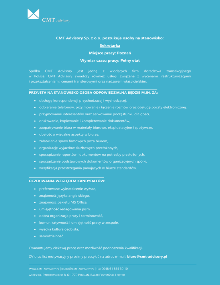 CMT Advisory Sp. z o.o. poszukuje osoby na stanowisko: Sekretarka Miejsce pracy: Poznań Wymiar czasu pracy: Pełny etat Spółka CMT Advisory jest jedną z wiodących firm doradztwa transakcyjnego w Polsce. CMT Advisory świadczy również usługi związane z wycenami, restrukturyzacjami i przekształceniami, cenami transferowymi oraz nadzorem właścicielskim. PRZYJĘTA NA STANOWISKO OSOBA ODPOWIEDZIALNA BĘDZIE M.IN. ZA: obsługę korespondencji przychodzącej i wychodzącej, odbieranie telefonów, przyjmowanie i łączenie rozmów oraz obsługę poczty elektronicznej, przyjmowanie interesantów oraz serwowanie poczęstunku dla gości, drukowanie, kopiowanie i kompletowanie dokumentów, zaopatrywanie biura w materiały biurowe, eksploatacyjne i spożywcze, dbałość o wizualne aspekty w biurze, załatwianie spraw firmowych poza biurem, organizację wyjazdów służbowych przełożonych, sporządzanie raportów i dokumentów na potrzeby przełożonych, sporządzanie podstawowych dokumentów organizacyjnych spółki, weryfikacja przestrzegania panujących w biurze standardów. OCZEKIWANIA WZGLĘDEM KANDYDATÓW: preferowane wykształcenie wyższe, znajomość języka angielskiego, znajomość pakietu MS Office, umiejętność redagowania pism, dobra organizacja pracy i terminowość, komunikatywność i umiejętność pracy w zespole, wysoka kultura osobista, samodzielność. Gwarantujemy ciekawą pracę oraz możliwość podnoszenia kwalifikacji. CV oraz list motywacyjny prosimy przesyłać na adres e-mail: [email protected] WWW.CMT-ADVISORY.PL | [email protected] | TEL: 0048 61 855 30 10 ADRES: UL. PADEREWSKIEGO 8, 61-770 POZNAŃ, BAZAR POZNAŃSKI, I PIĘTRO