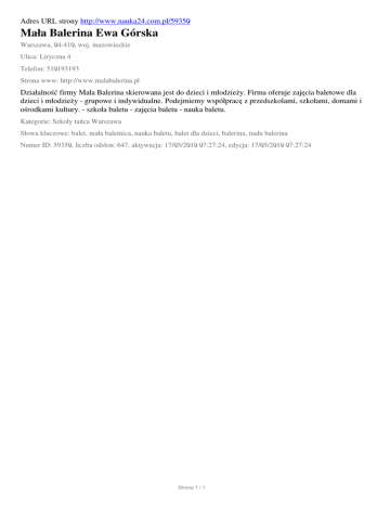 Adres URL strony http://www.nauka24.com.pl/59350 Mała Balerina Ewa Górska Warszawa, 04-410, woj. mazowieckie Ulica: Liryczna 4 Telefon: 510193193 Strona www: http://www.malabalerina.pl Działalność firmy Mała Balerina skierowana jest do dzieci i młodzieży. Firma oferuje zajęcia baletowe dla dzieci i młodzieży - grupowe i indywidualne. Podejmiemy współpracę z przedszkolami, szkołami, domami i ośrodkami kultury. - szkoła baletu - zajęcia baletu - nauka baletu. Kategorie: Szkoły tańca Warszawa Słowa kluczowe: balet, mała baletnica, nauka baletu, balet dla dzieci, balerina, mała balerina Numer ID: 59350, liczba odsłon: 647, aktywacja: 17/05/2010 07:27:24, edycja: 17/05/2010 07:27:24 Strona 1 / 1