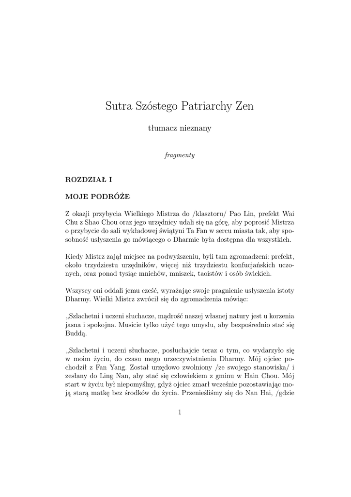Sutra Szóstego Patriarchy Zen tłumacz nieznany fragmenty ROZDZIAŁ I MOJE PODRÓŻE Z okazji przybycia Wielkiego Mistrza do /klasztoru/ Pao Lin, prefekt Wai Chu z Shao Chou oraz jego urzędnicy udali się na górę, aby poprosić Mistrza o przybycie do sali wykładowej świątyni Ta Fan w sercu miasta tak, aby sposobność usłyszenia go mówiącego o Dharmie była dostępna dla wszystkich. Kiedy Mistrz zajął miejsce na podwyższeniu, byli tam zgromadzeni: prefekt, około trzydziestu urzędników, więcej niż trzydziestu konfucjańskich uczonych, oraz ponad tysiąc mnichów, mniszek, taoistów i osób świckich. Wszyscy oni oddali jemu cześć, wyrażając swoje pragnienie usłyszenia istoty Dharmy. Wielki Mistrz zwrócił się do zgromadzenia mówiąc: „Szlachetni i uczeni słuchacze, mądrość naszej własnej natury jest u korzenia jasna i spokojna. Musicie tylko użyć tego umysłu, aby bezpośrednio stać się Buddą. „Szlachetni i uczeni słuchacze, posłuchajcie teraz o tym, co wydarzyło się w moim życiu, do czasu mego urzeczywistnienia Dharmy. Mój ojciec pochodził z Fan Yang. Został urzędowo zwolniony /ze swojego stanowiska/ i zesłany do Ling Nan, aby stać się człowiekiem z gminu w Hain Chou. Mój start w życiu był niepomyślny, gdyż ojciec zmarł wcześnie pozostawiając moją starą matkę bez środków do życia. Przenieśliśmy się do Nan Hai, /gdzie 1 żyliśmy/ w trudzie i ubóstwie, ze sprzedawania szczap na podpałkę na targu. „Pewnego razu, jakiś klient kupując szczapy, polecił mi dostarczyć je do swego sklepu. Kiedy otrzymał towar a ja dostałem zapłatę, wyszedłem na zewnątrz i usłyszałem człowieka śpiewającego sutrę. Kiedy słuchałem słów sutry mój umysł natychmiast otworzył się ku bezpośredniemu przebudzeniu. „Wówczas zapytałem tego człowieka jaką to sutrę śpiewał. Odpowiedział ‘Sutrę Diamentową’. Pytałem go dalej, skąd przyszedł i dlaczego praktykował śpiewanie tej sutry. Odpowiedział tak: ‘Jestem ze Wschodniej Świątyni Ch’an w Ch’i Chou, w okręgu Huang Mei. Jest to świątynia Piątego Patriarchy Hung Jena, gdzie jest on nauczycielem ponad tysiąca uczniów. Kiedy udałem się tam aby oddać mu cześć i wysłuchać /jego wskazań/, otrzymałem tę sutrę. Wielki Mistrz naucza stale zarówno mnichów, jak i osoby świeckie, że jeśli tylko będą prakytkować śpiewanie Sutry Diamentu, będą w stanie wejrzeć w swoją własną naturę i będą mogli bezpośrednio stać się Buddami.’ „Kiedy słuchałem tych słów /uświadomiłem sobie, że musiałem/ mieć z nimi przeszłe powinowactwo. Wówczas pewien klient podarował mi dziesięć taelów, doradzając mi bym zapewnił mojej starej matce potrzebną żywność i odzież, a następnie wyruszył do Huang Mei, by oddać cześć Piątemu Patriarsze i studiować doktrynę u niego. „Kiedy przygotowałem wszystko, co było konieczne dla zabezpieczenia bytu mojej matki, od razu wyruszyłem. W niecałe trzydzieści dni przybyłem do Huang Mei. Kiedy oddawałem cześć Piątemu Patriarsze, ów zapytał, ‘Z jakiego okręgu pochodzisz? Czego szukasz?’ „Jestem buddyjskim uczniem z Ling Man i wywodzę się z gminu Hsin Chou. Przyszedłem z bardzo daleka by oddać ci cześć i by dążyć do tego aby stać się Buddą, a nie dla jakiegokolwiek innego powodu. „Patriarcha odpowiedział, ‘Pochodzisz z Ling Nan i jesteś tylko prostakiem. Jakże w ogóle mógłbyś stać się Buddą!’ „Odpowiedziałem, ‘Istnieją z konieczności ludzie z południa i z północy, ale, z punktu widzenia Natury Buddy, nie ma u korzenia ani południa ani północy. 2 Powierzchowność prostaka nie jest taka sama jak powierzchowność mnicha, lecz jak tu różnica jeśli chodzi o Naturę Buddy?’ „Piąty Patriarcha chciał kontynuować rozmowę, lecz ponieważ ujrzał, że wielu jego uczniów zgromadziło się wokół, polecił mi przyłączyć się do grupy i iść do pracy. „Powiedziałem jednak, ‘Czcigodny Panie, czy mogę powiedzieć ci, że rozróżniająca czujność powstaje bezustannie w moim własnym umyśle i że przez nie odchodzenie od swojej własnej natury już kultywuje się pole zasług. Nie zapytałem cię jeszcze, Czcigodny Panie, jaką pracę chciałbyś bym wykonywał.’ „Patriarcha odpowiedział, ‘Jesteś prostakiem, jednakże wielkiego dowcipu. Lepiej przestań mówić.’ „Odkomenderował mnie do spichlerza. Odszedłem wówczas na tylny dziedziniec, gdzie był dozorujący, który powiedział mi abym rąbał drwa i tłukł ryż. „Po upływie ponad ośmiu miesięcy, zdarzyło się pewnego dnia, że Patriarcha ujrzał mnie i powiedział, ‘Czuję, że twoje rozumienie jest do przyjęcia, lecz obawiam się, że mogą tu być ludzie o złej woli, którzy mogliby cię skrzywdzić. Dlatego nie rozmawiałem z tobą. Czy mnie rozumiesz?’ „Odpowiedziałem, ‘Wiem o co ci chodzi, Mistrzu, i dlatego nie ryzykowałem zbliżenia się do sali, aby inni mnie nie zauważyli.’ „Przy pewnej okazji Mistrz zwołał razem swoich uczniów. Kiedy wszyscy zgromadzili się powiedział, ‘Mam wam coś do powiedzenia. Narodziny i śmierć człowieka są poważną sprawą. Wy wszyscy, dzień po dniu, dążycie jedynie do pola zasług. Nie dążycie do wyzwolenia z gorzkiego oceanu narodzin i śmierci. ‘Jeżeli jesteście zwiedzeni co do swojej własnej natury, to jak mogłoby bogactwo was uratować? Niech każdy z was idzie i szuka w sobie wiedzy rozróżniającej czujności. Urzeczywistniajcie naturę mądrości pradźni, mądrości waszego własnego pierwotnego umysłu. Niech każdy z was ułoży wiersz. Przynieście mi je do obejrzenia. Jeżeli ktoś z was przebudził się do zasadniczej istoty nauki, przekażę mu szatę oraz Dharmę i stanie się on Szóstym Patriarchą. 3 Pędźcie jak rozszalały pożar! Nie zwlekajcie! Rozmyślanie nad tym jest bezużyteczne! Osoba, która urzeczywistnia swoją własną naturę, urzeczyw