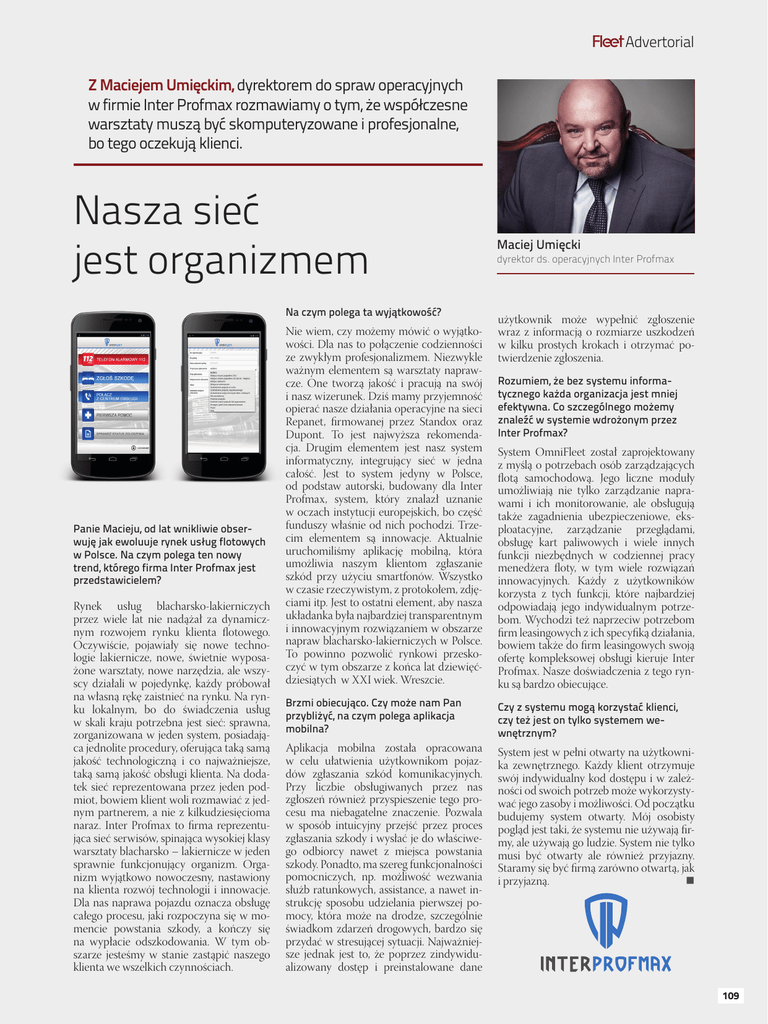 Fleet Advertorial Z Maciejem Umięckim, dyrektorem do spraw operacyjnych w firmie Inter Profmax rozmawiamy o tym, że współczesne warsztaty muszą być skomputeryzowane i profesjonalne, bo tego oczekują klienci. Nasza sieć jest organizmem Na czym polega ta wyjątkowość? Panie Macieju, od lat wnikliwie obserwuję jak ewoluuje rynek usług flotowych w Polsce. Na czym polega ten nowy trend, którego firma Inter Profmax jest przedstawicielem? Rynek usług blacharsko-lakierniczych przez wiele lat nie nadążał za dynamicznym rozwojem rynku klienta flotowego. Oczywiście, pojawiały się nowe technologie lakiernicze, nowe, świetnie wyposażone warsztaty, nowe narzędzia, ale wszyscy działali w pojedynkę, każdy próbował na własną rękę zaistnieć na rynku. Na rynku lokalnym, bo do świadczenia usług w skali kraju potrzebna jest sieć: sprawna, zorganizowana w jeden system, posiadająca jednolite procedury, oferująca taką samą jakość technologiczną i co najważniejsze, taką samą jakość obsługi klienta. Na dodatek sieć reprezentowana przez jeden podmiot, bowiem klient woli rozmawiać z jednym partnerem, a nie z kilkudziesięcioma naraz. Inter Profmax to firma reprezentująca sieć serwisów, spinająca wysokiej klasy warsztaty blacharsko – lakiernicze w jeden sprawnie funkcjonujący organizm. Organizm wyjątkowo nowoczesny, nastawiony na klienta rozwój technologii i innowacje. Dla nas naprawa pojazdu oznacza obsługę całego procesu, jaki rozpoczyna się w momencie powstania szkody, a kończy się na wypłacie odszkodowania. W tym obszarze jesteśmy w stanie zastąpić naszego klienta we wszelkich czynnościach. Nie wiem, czy możemy mówić o wyjątkowości. Dla nas to połączenie codzienności ze zwykłym profesjonalizmem. Niezwykle ważnym elementem są warsztaty naprawcze. One tworzą jakość i pracują na swój i nasz wizerunek. Dziś mamy przyjemność opierać nasze działania operacyjne na sieci Repanet, firmowanej przez Standox oraz Dupont. To jest najwyższa rekomendacja. Drugim elementem jest nasz system informatyczny, integrujący sieć w jedna całość. Jest to system jedyny w Polsce, od podstaw autorski, budowany dla Inter Profmax, system, który znalazł uznanie w oczach instytucji europejskich, bo część funduszy właśnie od nich pochodzi. Trzecim elementem są innowacje. Aktualnie uruchomiliśmy aplikację mobilną, która umożliwia naszym klientom zgłaszanie szkód przy użyciu smartfonów. Wszystko w czasie rzeczywistym, z protokołem, zdjęciami itp. Jest to ostatni element, aby nasza układanka była najbardziej transparentnym i innowacyjnym rozwiązaniem w obszarze napraw blacharsko-lakierniczych w Polsce. To powinno pozwolić rynkowi przeskoczyć w tym obszarze z końca lat dziewięćdziesiątych w XXI wiek. Wreszcie. Maciej Umięcki dyrektor ds. operacyjnych Inter Profmax użytkownik może wypełnić zgłoszenie wraz z informacją o rozmiarze uszkodzeń w kilku prostych krokach i otrzymać potwierdzenie zgłoszenia. Rozumiem, że bez systemu informatycznego każda organizacja jest mniej efektywna. Co szczególnego możemy znaleźć w systemie wdrożonym przez Inter Profmax? System OmniFleet został zaprojektowany z myślą o potrzebach osób zarządzających flotą samochodową. Jego liczne moduły umożliwiają nie tylko zarządzanie naprawami i ich monitorowanie, ale obsługują także zagadnienia ubezpieczeniowe, eksploatacyjne, zarządzanie przeglądami, obsługę kart paliwowych i wiele innych funkcji niezbędnych w codziennej pracy menedżera floty, w tym wiele rozwiązań innowacyjnych. Każdy z użytkowników korzysta z tych funkcji, które najbardziej odpowiadają jego indywidualnym potrzebom. Wychodzi też naprzeciw potrzebom firm leasingowych z ich specyfiką działania, bowiem także do firm leasingowych swoją ofertę kompleksowej obsługi kieruje Inter Profmax. Nasze doświadczenia z tego rynku są bardzo obiecujące. Brzmi obiecująco. Czy może nam Pan przybliżyć, na czym polega aplikacja mobilna? Czy z systemu mogą korzystać klienci, czy też jest on tylko systemem wewnętrznym? Aplikacja mobilna została opracowana w celu ułatwienia użytkownikom pojazdów zgłaszania szkód komunikacyjnych. Przy liczbie obsługiwanych przez nas zgłoszeń również przyspieszenie tego procesu ma niebagatelne znaczenie. Pozwala w sposób intuicyjny przejść przez proces zgłaszania szkody i wysłać je do właściwego odbiorcy nawet z miejsca powstania szkody. Ponadto, ma szereg funkcjonalności pomocniczych, np. możliwość wezwania służb ratunkowych, assistance, a nawet instrukcję sposobu udzielania pierwszej pomocy, która może na drodze, szczególnie świadkom zdarzeń drogowych, bardzo się przydać w stresującej sytuacji. Najważniejsze jednak jest to, że poprzez zindywidualizowany dostęp i preinstalowane dane System jest w pełni otwarty na użytkownika zewnętrznego. Każdy klient otrzymuje swój indywidualny kod dostępu i w zależności od swoich potrzeb może wykorzystywać jego zasoby i możliwości. Od początku budujemy system otwarty. Mój osobisty pogląd jest taki, że systemu nie używają firmy, ale używają go ludzie. System nie tylko musi być otwarty ale również przyjazny. Staramy się być firmą zarówno otwartą, jak i przyjazną. 109