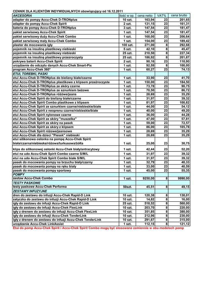 CENNIK DLA KLIENTÓW INDYWIDUALNYCH obowiązujący od 16.12.2011 AKCESORIA ilość w op. adapter do pompy Accu-Chek D-TRONplus 10 szt. adapter do pompy Accu-Chek Spirit 2 szt. bateria do pompy Accu-Chek D-TRONplus 3 szt. pakiet serwisowy Accu-Chek Spirit 1 szt. pakiet serwisowy duży Accu-Chek Combo 1 szt. pakiet serwisowy mały Accu-Chek Combo 1 szt. plaster do mocowania igły 100 szt. pojemnik na insulinę plastikowy niebieski 5 szt. pojemnik na insulinę plastikowy niebieski 25 szt. pojemnik na insulinę plastikowy przezroczysty 25 szt. pokrywa baterii Accu-Chek Spirit 2 szt. urządzenie do odczytu danych Accu-Chek Smart-Pix 1 szt. program Accu-Chek 360° 1 szt. ETUI, TOREBKI, PASKI etui Accu-Chek D-TRONplus do bielizny białe/czarne 1 szt. etui Accu-Chek D-TRONplus plastikowe z klipsem przeźroczyste 1 szt. etui Accu-Chek D-TRONplus ze skóry czarne 1 szt. etui Accu-Chek D-TRONplus ze sznurkiem beżowe 1 szt. etui Accu-Chek D-TRONplus różówe/jeans 1 szt. etui Accu-Chek Spirit do bielizny białe/czarne 1 szt. etui Accu-Chek Spirit Combo plastikowe z klipsem 1 szt. etui Accu-Chek Spirit ze sznurkiem czarne/niebieskie/białe 1 szt. etui Accu-Chek Spirit z neoprenu czarne/niebieskie/białe 1 szt. etui Accu-Chek Spirit nylonowe czarne 1 szt. etui Accu-Chek Spirit ze skóry "muszelka" 1 szt. etui Accu-Chek Spirit ze skóry na pasek 1 szt. etui Accu-Chek Spirit ze skóry z klipsem 1 szt. etui Accu-Chek Spirit różowe/jeansowe 1 szt. etui Accu-Chek dla dzieci "Piesek" niebieski 1 szt. etui silikonowa osłonka na pompę Accu-Chek Spirit biała/czarna/niebieska/różowa/turkusowa/żółta 1 szt. cena netto VAT% 163,94 23 131,15 23 147,54 23 147,54 23 168,00 23 154,00 23 271,00 8 42,10 8 210,50 8 186,92 8 90,16 23 92,59 8 60,27 23 cena brutto 201,65 161,31 181,47 181,47 206,64 189,42 292,68 45,47 227,34 201,87 110,90 100,00 74,13 33,90 150,00 73,78 70,50 28,69 31,97 81,97 44,00 40,00 36,00 47,00 59,00 86,00 28,69 28,69 23 23 23 23 23 23 23 23 23 23 23 23 23 23 23 41,70 184,50 90,75 86,72 35,29 39,32 100,82 54,12 49,20 44,28 57,81 72,57 105,78 35,29 35,29 25,00 23 30,75 klips do silikonowej osłonki Accu-Chek biały/antracytowy 1 szt. 42,44 23 52,20 etui na udo Accu-Chek Spirit Combo czarne S/M/L 1 szt. 31,97 23 39,32 etui na udo Accu-Chek Spirit Combo białe S/M/L 1 szt. 31,97 23 39,32 pasek do mocowania pompy na brzuchu biały/czarny 1 szt. 32,79 23 40,33 pasek do mocowania pompy na ręku biały 1 szt. 33,00 23 40,59 pasek do mocowania pompy sportowy 1 szt. 45,00 23 55,35 POMPY zestaw Accu-Chek Combo 1 szt. 9250,00 8 9990,00 TESTY PASKOWE testy paskowe Accu-Chek Performa 50szt. 45,51 8 49,15 ZESTAWY INFUZYJNE dren do zestawu do infuzji Accu-Chek Rapid-D Link 10 szt. 120,38 8 130,01 zatyczka do zestawu do infuzji Accu-Chek Rapid-D Link 10 szt. 14,82 8 16,00 igły do zestawu do infuzji Accu-Chek Rapid-D Link 25 szt. 518,52 8 560,00 igły do zestawu do infuzji Accu-Chek FlexLink 10 szt. 203,70 8 220,00 igły z drenem do zestawu do infuzji Accu-Chek FlexLink 10 szt. 351,85 8 380,00 igły do zestawu do infuzji Accu-Chek TenderLink 10 szt. 212,96 8 230,00 igły z drenem do zestawu do infuzji Accu-Chek TenderLink 10 szt. 291,67 8 315,00 urządzenie Accu-Chek LinkAssist 1 szt. 112,15 8 121,12 Etui do pomp Accu-Chek Spirit i Accu-Chek Spirit Combo mogą być stosowane zamiennie w obu modelach pomp