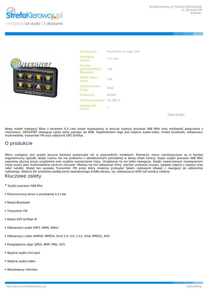 Strefakierowcy.pl Tomasz Wincenciak ul. Gersona 28 Kraków Dostępność: Wysyłamy w ciągu 24H Przekątna ekranu: 4,3 cala Zestaw głośnomówiący Bluetooth: Tak Polski lektor i menu: Tak Zainstalowane mapy: Brak Producent: BLOW Przedział cenowy: do 499 zł Dostępność Ceneo: 1 Cena brutto: Nowy model nawigacji Blow z ekranem 4,3 cala został wyposażony w jeszcze szybszy procesor 468 MHz oraz możliwość połączenia z internetem, GPS43YBT obsługuje także karty pamięci do 8GB. Dopełnieniem tego jest wejście audio-video, moduł bluetooth, odtwarzacz multimediów, transmiter FM oraz odbiornik GPS SirfStar. O produkcie Menu nawigacji jest proste jeszcze bardziej przejrzyste niż w poprzednich modelach. Elementy menu rozmieszczone są w bardzo ergonomiczny sposób, dzięki czemu nie ma problemu z odnalezieniem potrzebnej w danej chwili funkcji. Super szybki procesor 468 MHz zapewnia płynną pracę urządzenia oraz szybkie wyznaczanie trasy. Urządzenie to nie tylko nawigacja. Dzięki nowoczesnym rozwiązaniom może slużyć jako multimedialne centrum rozrywki. Możesz na nim odtwarzać filmy, słuchać ulubionej muzyki, oglądać zdjęcia z wakacji oraz robić notatki. Model ten posiada Transmiter FM przez który możemy przesyłać falami radiowymi dźwięk z nawigacji do odbiornika radiowego. Wejście AV umożliwia podłączenie zewnętrznego źródła obrazu, np. odtwarzacza DVD lub kamery cofania. Kluczowe zalety Szybki procesor 468 Mhz Panoramiczny ekran o przekątnej 4,3 cala Moduł Bluetooth Transmiter FM Moduł GPS SirfStar III Odtwarzacz audio (MP3, WMA, WAV) Odtwarzacz video (WMV9, MPEG4, DivX 5.0, 4.0, 3.11, XVid, MPEG2, AVI) Przeglądarka zdjęć (JPEG, BMP, PNG, GIF) Wyjście audio mini-jack Wejście audio-video Wbudowany mikrofon http://www.strefakierowcy.pl AptusShop Strefakierowcy.pl Tomasz Wincenciak ul. Gersona 28 Kraków Internet - możliwość przeglądania stron internetowych na urządzeniu oraz instalowania aplikacji typu mobile GG, klient poczty internetowej Na urządzeniu w trybie Windows, do którego można przejść bezpośrednio z menu nawigacji dostępnego w dwóch stylach, zainstalowano dodatkowe narzędzia do przeglądania dokumentów zapisanych w popularnych formatach. Należą do nich: Word Viewer, Excel Viewer, PowerPoint Viewer, PDF Viewer, Image Viewer. Alternatywny uchwyt HR do nawigacji regulowana długość każdego ramienia umożliwia instalację na mocno oddalonej szybie czołowej elastyczna, duża przyssawka podkładka przylepna na deskę przegub kulowy ? zapewnia regulację we wszystkich możliwych płaszczyznach możliwość skrócenia uchwytu do jednego ramienia Tabela cech System operacyjny Windows CE 5.0 Procesor MTK, ARM1176JZ-S-MT3351 468MHz Pamięć RAM 64 MB Pamięć wbudowana ROM 64 MB Obsługiwane typy kart microSD, max 8GB Gniazdo słuchawek Gniazdo "jack" 3.5mm stereo Wyświetlacz panel dotykowy TFT-LCD 4,3" Rozdzielczość 480x272 pikseli, QVGA, regulacja podświetlenia Transmisja danych Wbudowany moduł bluetooth, USB ver. 2.0. Odbiornik GPS Moduł SiRF Star 3i+ Wymiary 122 x 74 x 17 mm Wejście AV Tak http://www.strefakierowcy.pl AptusShop