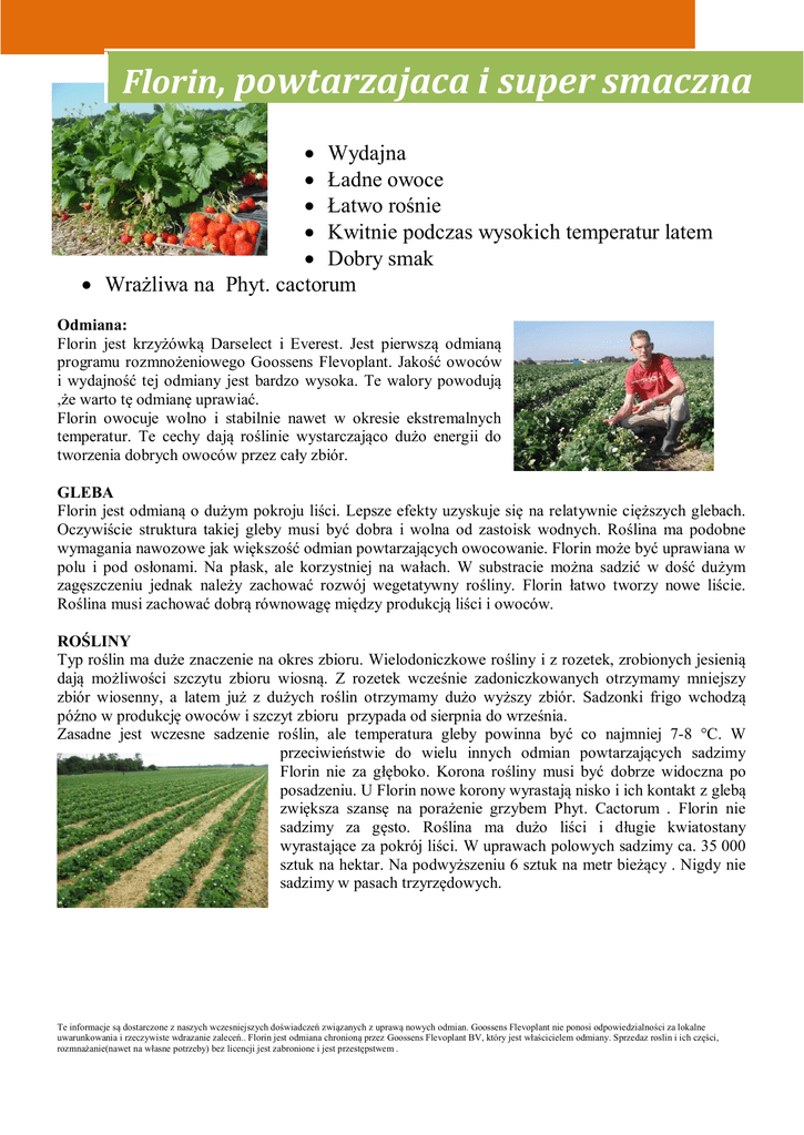 Florin powtarzajaca super smaczna Wydajna adne owoce atwo ro nie Kwitnie podczas wysokich temperatur latem Dobry smak Wra liwa na Phyt. cactorum Odmiana: Florin jest krzy ówk Darselect i Everest. Jest pierwsz odmian programu rozmno eniowego Goossens Flevoplant. Jako owoców i wydajno tej odmiany jest bardzo wysoka. Te walory powoduj e warto t odmian uprawia . Florin owocuje wolno i stabilnie nawet w okresie ekstremalnych temperatur. Te cechy daj ro linie wystarczaj co du o energii do tworzenia dobrych owoców przez ca y zbiór. GLEBA Florin jest odmian o du ym pokroju li ci. Lepsze efekty uzyskuje si na relatywnie ci szych glebach. Oczywi cie struktura takiej gleby musi by dobra i wolna od zastoisk wodnych. Ro lina ma podobne wymagania nawozowe jak wi kszo odmian powtarzaj cych owocowanie. Florin mo e by uprawiana w polu i pod os onami. Na p ask, ale korzystniej na wa ach. W substracie mo na sadzi w do du ym zag szczeniu jednak nale y zachowa rozwój wegetatywny ro liny. Florin atwo tworzy nowe li cie. Ro lina musi zachowa dobr równowag mi dzy produkcj li ci i owoców. RO LINY Typ ro lin ma du e znaczenie na okres zbioru. Wielodoniczkowe ro liny i z rozetek, zrobionych jesieni daj mo liwo ci szczytu zbioru wiosn . Z rozetek wcze nie zadoniczkowanych otrzymamy mniejszy zbiór wiosenny, a latem ju z du ych ro lin otrzymamy du o wy szy zbiór. Sadzonki frigo wchodz pó no w produkcj owoców i szczyt zbioru przypada od sierpnia do wrze nia. Zasadne jest wczesne sadzenie ro lin, ale temperatura gleby powinna by co najmniej 7-8 °C. W przeciwie stwie do wielu innych odmian powtarzaj cych sadzimy Florin nie za g boko. Korona ro liny musi by dobrze widoczna po posadzeniu. U Florin nowe korony wyrastaj nisko i ich kontakt z gleb zwi ksza szans na pora enie grzybem Phyt. Cactorum . Florin nie sadzimy za g sto. Ro lina ma du o li ci i d ugie kwiatostany wyrastaj ce za pokrój li ci. W uprawach polowych sadzimy ca. 35 000 sztuk na hektar. Na podwy szeniu 6 sztuk na metr bie cy . Nigdy nie sadzimy w pasach trzyrz dowych. Te informacje s dostarczone z naszych wczesniejszych do wiadcze zwi zanych z upraw nowych odmian. Goossens Flevoplant nie ponosi odpowiedzialno ci za lokalne uwarunkowania i rzeczywiste wdrazanie zalece .. Florin jest odmiana chronion przez Goossens Flevoplant BV, który jest w cicielem odmiany. Sprzedaz roslin i ich cz ci, rozmna anie(nawet na w asne potrzeby) bez licencji jest zabronione i jest przest pstwem . UPRAWA Kilka tygodni po posadzeniu obrywamy pierwsze kwiatostany. U Florin usuwanie pierwszych kwiatostanów ju przy koronie jest bardzo wa ne! Dwa tygodnie pó niej wyrastaj kolejne kwiatostany czy je nale y usun zale y od ilo ci li ci i wielko ci samej ro liny. Zbyt d ugie usuwanie kwiatostanów spowodowa mo e trudne przej cie ro liny ze stadium wegetatywnego w generatywny. Roz ogi odbieraj energi ro linie potrzebn do tworzenia kwiatostanów. Ro lina ma du o li ci. Du a powierzchnia li ci gwarantuje dobr jako i wielko owoców podczas wysokich temperatur. Ro lina, a do pó nej jesieni produkuje zielone li cie bez jesiennych wybarwie li ci jakie znamy u innych odmian powtarzaj cych. NAWO ENIE Ukorzenianie na pocz tku jest czasami trudne i ro lina relatywnie ma ma e potrzeby nawozowe na starcie. Niskie temperatury gleby i wysokie-pH prowadz do braku integracji niezb dnych elementów w ro linie co w rezultacie sprawia, e li cie s jasne lub koloru tego. Brakuj ce elementy nale y dostarczy u ywaj c nawozów dolistnych. Dobrze ukorzeniona ro lina o du ej powierzchni li ci ma du e potrzeby na azot i potas. Uprawy w substracie wymagaj zwi szenia EC dostarczonego o 20% w porównaniu z wi kszo ci innych odmian. Wy sze EC prowadzi do uzyskania bardziej kompaktowych ro lin i ma du y wp yw na j drno owoców. Ro lina wymaga odpowiedniej ilosci Magnezu i Molidenu bo te elementy maja wp yw na konwersj azotu przy wzro cie ro lin. OCHRONA Najwa niejszym aspektem ochrony uprawy Florin jest prewencja przeciw zgnili nie korony truskawkiPhytophthora cactorum. Ta odmiana jest szczególnie wra liwa. W Holandii podlewa si ro lin zaraz po posadzeniu i po kilku tygodniach powtórnie zadaje si rodkiem uodparniaj cym na dzia anie grzyba. W Polsce nie ma zarejestrowanych rodków zwalczaj cych Phytophtora cactorum. Inne choroby grzybowe wyst puj ce na Florin to szara ple i m czniak(szczególnie pod os onami). Nale y równie uwa na wciornastka zachodniego i zmiennika lucernowca. Zbiór Owoce s bardzo podobne do owoców Elsanta. Kolor owoców pomara czowo-czerwony i nie ciemnieje po zbiorach. Smak owocu jest orze wiaj cy. Owoce mocno aromatyczne. Zbiór rozpoczyna si w po owie lipca i trwa bez wi kszych przerw do przymrozków. Kwiatostany s d ugie i nara one na deszcz jednak owoce s odporne. Sadzonki s dost pne w: Goossens Flevoplant Polska Sp z o.o. Duraczewo 8, 66-535 Go cim Tel/fax : 95 762 42 49 Mob: 501 409 957 , Zbigniew Pisarek [email protected] www.flevoplant.pl