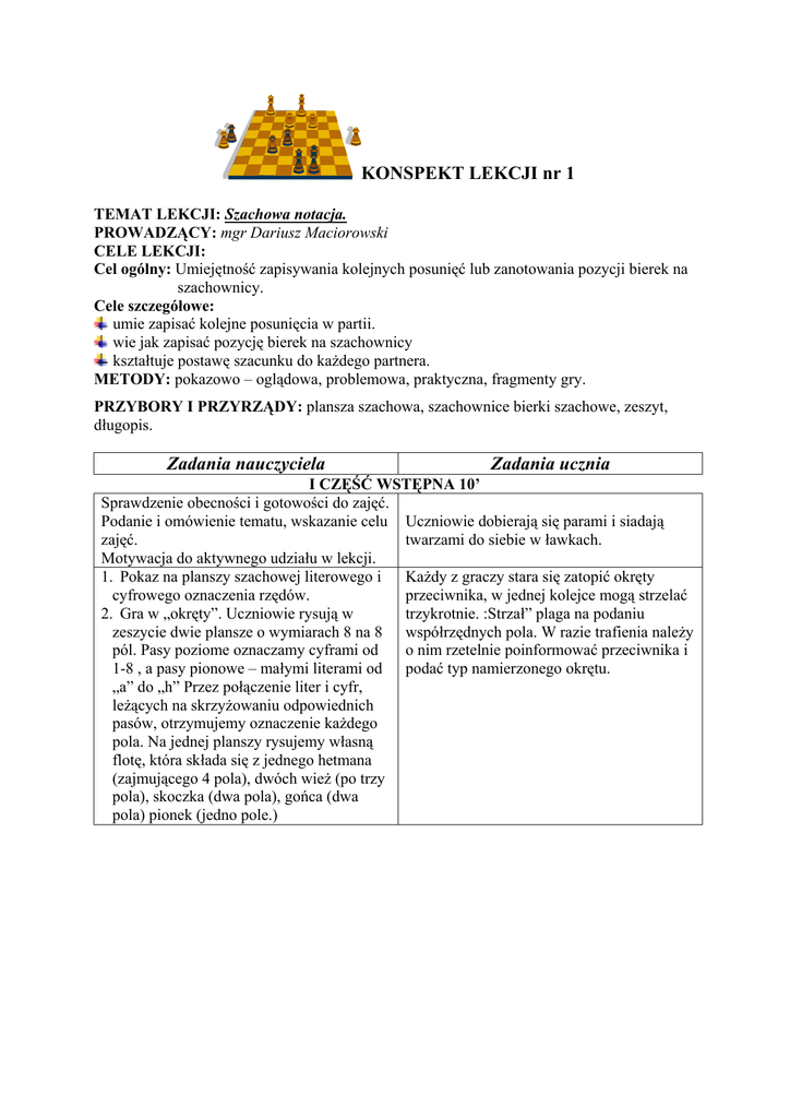 KONSPEKT LEKCJI nr 1 TEMAT LEKCJI: Szachowa notacja. PROWADZĄCY: mgr Dariusz Maciorowski CELE LEKCJI: Cel ogólny: Umiejętność zapisywania kolejnych posunięć lub zanotowania pozycji bierek na szachownicy. Cele szczegółowe: umie zapisać kolejne posunięcia w partii. wie jak zapisać pozycję bierek na szachownicy kształtuje postawę szacunku do każdego partnera. METODY: pokazowo – oglądowa, problemowa, praktyczna, fragmenty gry. PRZYBORY I PRZYRZĄDY: plansza szachowa, szachownice bierki szachowe, zeszyt, długopis. Zadania nauczyciela Zadania ucznia I CZĘŚĆ WSTĘPNA 10’ Sprawdzenie obecności i gotowości do zajęć. Podanie i omówienie tematu, wskazanie celu Uczniowie dobierają się parami i siadają zajęć. twarzami do siebie w ławkach. Motywacja do aktywnego udziału w lekcji. 1. Pokaz na planszy szachowej literowego i Każdy z graczy stara się zatopić okręty cyfrowego oznaczenia rzędów. przeciwnika, w jednej kolejce mogą strzelać 2. Gra w „okręty”. Uczniowie rysują w trzykrotnie. :Strzał” plaga na podaniu zeszycie dwie plansze o wymiarach 8 na 8 współrzędnych pola. W razie trafienia należy pól. Pasy poziome oznaczamy cyframi od o nim rzetelnie poinformować przeciwnika i 1-8 , a pasy pionowe – małymi literami od podać typ namierzonego okrętu. „a” do „h” Przez połączenie liter i cyfr, leżących na skrzyżowaniu odpowiednich pasów, otrzymujemy oznaczenie każdego pola. Na jednej planszy rysujemy własną flotę, która składa się z jednego hetmana (zajmującego 4 pola), dwóch wież (po trzy pola), skoczka (dwa pola), gońca (dwa pola) pionek (jedno pole.) II CZĘŚĆ GŁÓWNA 35’ król - K; hetman – H; goniec – G; skoczek – S; wieża – W; pion – p; piony – pp. 3. Zapisać skrócone nazwy figur. Rysunek Nazwa pionek wieża skoczek goniec hetman król 4. Wykonać pełny zapis początkowej pozycji bierek: Białe: Ke1, Hd1, Wa1, Wh1, Ge1, Gf1, Sb1, Sg1, p.: a2,b2,c2, d2, e2, f2, g2. h2. Czarne: Ke8, Hd8, Wa8, Wh8, Ge8, Gf8, Sb8, Sg8, p.: a7,b7,c7, d7, e7, f7, g7. h7. Przykład: 1.e2-e4 e7-e5 biały pion na z e2 na e4, czarny z e7 na e5. Zapisać tekst partii w pełnej notacji: 2.Sg1-f3 Sb8-c6 biały skoczek z Bicie oznaczamy wstawiając znak " : " lub " g1 na f3 i czarny skoczek z b8 na c6 x " zamiast " - "np. 22.Hb6:b8 ... . 3.Gf1-b5! d7-d6 biały goniec na Roszady: " 0-0-0 " - długa i " 0-0 " - krótka. b5 - oceniam to jako dobre posunięcie Mat to " X " lub " ++ ". 4.Gb5:c6+ b7:c6 biały goniec bije Szach - " + " na c6 – szach 5.Sf3:e5? ... biały skoczek bije na e5 - oceniam jako złe posunięcie, itd. Zapisać tekst partii w skróconej notacji: W notacji skróconej zapisujemy tylko pole Dla zaoszczędzenia miejsca używamy docelowe bierki, jednak w przypadku notacji skróconej: 1.e4 e5, 2.Sf3 Sc6, 3.Gb5! wątpliwości, gdy dwie jednakowe bierki d6, 4.G:c6+ bc6, 5.S:e5? ... mogą zająć dane pole, oznaczamy także pole wyjściowe np. 18.de5 Wae8, 19.Sbd3 itd. III CZĘŚĆ KOŃCOWA 5’ Podsumowanie i praca domowa Opracował: mgr Dariusz Maciorowski 1. Określić z pamięci kolor pól: b2, d5, e1, f7 itd. BIBLIOGRAFIA 1. Ryszard Jegierowski i Ewa Chobocka, „Lider”, 1999 nr 10, „Wychowanie fizyczne w zreformowanej szkole podstawowej – Poradnik dla nauczycieli”. 2. Emilia Jasinowska, „Wychowanie fizyczne i zdrowotne”, „Autorski program w gimnazjum”, Oficyna wydawnicza, Poznań 2001 r. 3. Marzena Kurzak i Jolanta Paruch, „Wychowanie fizyczne i zdrowotne”, „Autorski program nauczania – wychowania fizycznego w gimnazjum”. 4. Czesław Sieniek, Planowanie pracy nauczyciela wychowania fizycznego w klasie I – III gimnazjum”, Pracownia wydawnicza „HELVETICA”, Starachowice 2001 r. 5. Tadeusz Czarnecki, „A B C Szachisty”, Wydawnictwo sport i turystyka, Warszawa 1975 r. 6. Andrzej Michalski, „Zeszyt szachowy 1”, Wydawniczo – Oświatowa Spółdzielnia Inwalidów „Wspólna Sprawa”, Toruń 1993 r. 7. Stanisław Kacprzyk, „Od szacha do mata czyli pierwsze wtajemniczenie szachowe”, Wydawnictwo Gambit, 1997 r. 8. Nikołaj Jakowliew, Wsewołod Kastrow, „Szachmatnyj Rieszebnik”, Sankt – Petersburg, 1995 r. 9. Strony WWW. szchy.biz; szach-mat–pat.webpark.pl; szachy. website. pl; szach.net; skoczkolandia. webpark. pl;
