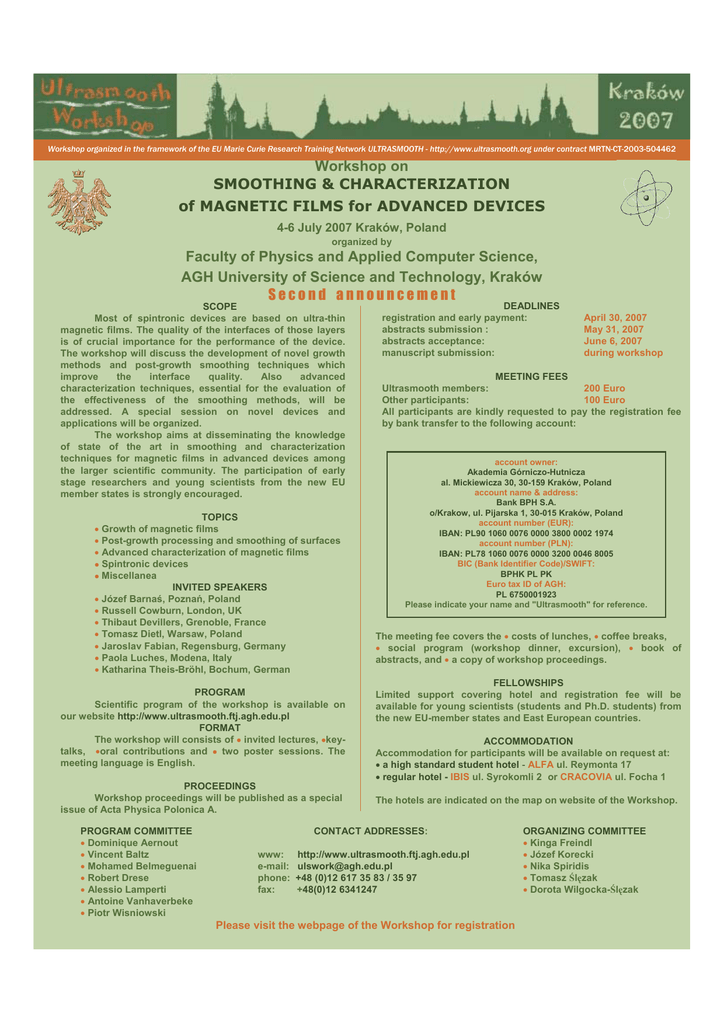 Workshop organized in the framework of the EU Marie Curie Research Training Network ULTRASMOOTH - http://www.ultrasmooth.org under contract MRTN-CT-2003-504462 Workshop on SMOOTHING & CHARACTERIZATION of MAGNETIC FILMS for ADVANCED DEVICES 4-6 July 2007 Kraków, Poland organized by Faculty of Physics and Applied Computer Science, AGH University of Science and Technology, Kraków Second announcement SCOPE Most of spintronic devices are based on ultra-thin magnetic films. The quality of the interfaces of those layers is of crucial importance for the performance of the device. The workshop will discuss the development of novel growth methods and post-growth smoothing techniques which improve the interface quality. Also advanced characterization techniques, essential for the evaluation of the effectiveness of the smoothing methods, will be addressed. A special session on novel devices and applications will be organized. The workshop aims at disseminating the knowledge of state of the art in smoothing and characterization techniques for magnetic films in advanced devices among the larger scientific community. The participation of early stage researchers and young scientists from the new EU member states is strongly encouraged. TOPICS • Growth of magnetic films • Post-growth processing and smoothing of surfaces • Advanced characterization of magnetic films • Spintronic devices • Miscellanea INVITED SPEAKERS • Józef Barnaś, Poznań, Poland • Russell Cowburn, London, UK • Thibaut Devillers, Grenoble, France • Tomasz Dietl, Warsaw, Poland • Jaroslav Fabian, Regensburg, Germany • Paola Luches, Modena, Italy • Katharina Theis-Bröhl, Bochum, German PROGRAM Scientific program of the workshop is available on our website http://www.ultrasmooth.ftj.agh.edu.pl FORMAT The workshop will consists of • invited lectures, •keytalks, •oral contributions and • two poster sessions. The meeting language is English. PROCEEDINGS Workshop proceedings will be published as a special issue of Acta Physica Polonica A. PROGRAM COMMITTEE • Dominique Aernout • Vincent Baltz • Mohamed Belmeguenai • Robert Drese • Alessio Lamperti • Antoine Vanhaverbeke • Piotr Wisniowski DEADLINES registration and early payment: abstracts submission : abstracts acceptance: manuscript submission: MEETING FEES 200 Euro Ultrasmooth members: Other participants: 100 Euro All participants are kindly requested to pay the registration fee by bank transfer to the following account: account owner: Akademia Górniczo-Hutnicza al. Mickiewicza 30, 30-159 Kraków, Poland account name & address: Bank BPH S.A. o/Krakow, ul. Pijarska 1, 30-015 Kraków, Poland account number (EUR): IBAN: PL90 1060 0076 0000 3800 0002 1974 account number (PLN): IBAN: PL78 1060 0076 0000 3200 0046 8005 BIC (Bank Identifier Code)/SWIFT: BPHK PL PK Euro tax ID of AGH: PL 6750001923 Please indicate your name and "Ultrasmooth" for reference. The meeting fee covers the • costs of lunches, • coffee breaks, • social program (workshop dinner, excursion), • book of abstracts, and • a copy of workshop proceedings. FELLOWSHIPS Limited support covering hotel and registration fee will be available for young scientists (students and Ph.D. students) from the new EU-member states and East European countries. ACCOMMODATION Accommodation for participants will be available on request at: • a high standard student hotel - ALFA ul. Reymonta 17 • regular hotel - IBIS ul. Syrokomli 2uor CRACOVIA ul. Focha 1 The hotels are indicated on the map on website of the Workshop. CONTACT ADDRESSES: www: e-mail: phone: fax: April 30, 2007 May 31, 2007 June 6, 2007 during workshop http://www.ultrasmooth.ftj.agh.edu.pl [email protected] +48 (0)12 617 35 83 / 35 97 +48(0)12 6341247 Please visit the webpage of the Workshop for registration ORGANIZING COMMITTEE • Kinga Freindl • Józef Korecki • Nika Spiridis • Tomasz Ślęzak • Dorota Wilgocka-Ślęzak