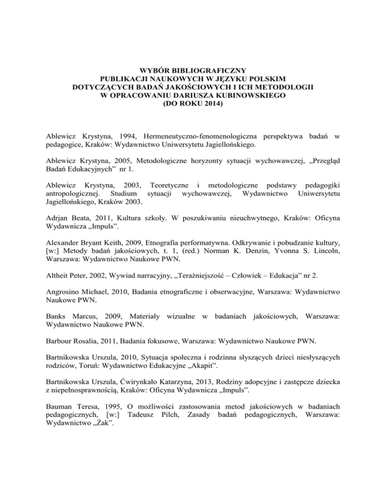 WYBÓR BIBLIOGRAFICZNY PUBLIKACJI NAUKOWYCH W JĘZYKU POLSKIM DOTYCZĄCYCH BADAŃ JAKOŚCIOWYCH I ICH METODOLOGII W OPRACOWANIU DARIUSZA KUBINOWSKIEGO (DO ROKU 2014) Ablewicz Krystyna, 1994, Hermeneutyczno-fenomenologiczna perspektywa badań w pedagogice, Kraków: Wydawnictwo Uniwersytetu Jagiellońskiego. Ablewicz Krystyna, 2005, Metodologiczne horyzonty sytuacji wychowawczej, „Przegląd Badań Edukacyjnych” nr 1. Ablewicz Krystyna, 2003, Teoretyczne i metodologiczne podstawy pedagogiki antropologicznej. Studium sytuacji wychowawczej, Wydawnictwo Uniwersytetu Jagiellońskiego, Kraków 2003. Adrjan Beata, 2011, Kultura szkoły. W poszukiwaniu nieuchwytnego, Kraków: Oficyna Wydawnicza „Impuls”. Alexander Bryant Keith, 2009, Etnografia performatywna. Odkrywanie i pobudzanie kultury, [w:] Metody badań jakościowych, t. 1, (red.) Norman K. Denzin, Yvonna S. Lincoln, Warszawa: Wydawnictwo Naukowe PWN. Altheit Peter, 2002, Wywiad narracyjny, „Teraźniejszość – Człowiek – Edukacja” nr 2. Angrosino Michael, 2010, Badania etnograficzne i obserwacyjne, Warszawa: Wydawnictwo Naukowe PWN. Banks Marcus, 2009, Materiały wizualne w badaniach jakościowych, Warszawa: Wydawnictwo Naukowe PWN. Barbour Rosalia, 2011, Badania fokusowe, Warszawa: Wydawnictwo Naukowe PWN. Bartnikowska Urszula, 2010, Sytuacja społeczna i rodzinna słyszących dzieci niesłyszących rodziców, Toruń: Wydawnictwo Edukacyjne „Akapit”. Bartnikowska Urszula, Ćwirynkało Katarzyna, 2013, Rodziny adopcyjne i zastępcze dziecka z niepełnosprawnością, Kraków: Oficyna Wydawnicza „Impuls”. Bauman Teresa, 1995, O możliwości zastosowania metod jakościowych w badaniach pedagogicznych, [w:] Tadeusz Pilch, Zasady badań pedagogicznych, Warszawa: Wydawnictwo „Żak”. Bauman Teresa, 2001, Strategie jakościowe w badaniach pedagogicznych, [w:] Tadeusz Pilch, Teresa Bauman, Zasady badań pedagogicznych – strategie ilościowe i jakościowe, Warszawa: Wydawnictwo Akademickie „Żak”. Bauman Teresa, 2003, Badania empiryczne jakościowe, [w:] Encyklopedia pedagogiczna XXI wieku, t. 1, (red.) Tadeusz Pilch, Warszawa: Wydawnictwo Akademickie „Żak”. Bauman Teresa (red.), 2012, Praktyka badań pedagogicznych, Kraków: Oficyna Wydawnicza „Impuls”. Belting Hans, 2007, Antropologia obrazu. Szkice do nauki o obrazie, Kraków: Universitas. Bieliński Jacek, Iwińska Katarzyna, Rosińska-Kordasiewicz Anna, 2007, Analiza danych jakościowych przy użyciu programów komputerowych, „ASK” nr 16. Bobaj Agnieszka, 2009, Uczeń niepełnosprawny w szkole integracyjnej. Postawy uczniów pełnosprawnych wobec ich niepełnosprawnych rówieśników, [w:] Wielowymiarowość przestrzeni życia współczesnego dziecka, (red.) Jadwiga Izdebska, Joanna Szymanowska, Białystok: Wydawnictwo Uniwersyteckie „Trans Humana”. Bobrowska Ewa, 2007, Obrazowanie społeczeństwa w mediach. Analiza radiomaryjnego dyskursu, Kraków: Wydawnictwo Uniwersytetu Jagiellońskiego. Bohnsack Ralf, 2003, Dokumentująca interpretacja wzorów orientacji działania, [w:] Jakościowe orientacje w badaniach pedagogicznych: studia i materiały, (red.) Danuta Urbaniak-Zając, Jacek Piekarski, Łódź: Wydawnictwo Uniwersytetu Łódzkiego. Bohnsack Ralf, 2004a, Dyskusja grupowa – teoria i praktyka rekonstrukcji kolektywnych wzorów orientacji, [w:] Społeczne przestrzenie doświadczenia. Metoda interpretacji dokumentarnej, (red.) Sławomir Krzychała, Wrocław: Wydawnictwo Naukowe Dolnośląskiej Szkoły Wyższej Edukacji TWP we Wrocławiu. Bohnsack Ralf, 2004b, Dokumentarna interpretacja obrazu. W stronę rekonstrukcji ikonicznych zasobów wiedzy, przekład S. Krzychała, [w:] Społeczne przestrzenie doświadczenia. Metoda interpretacji dokumentarnej, red. S. Krzychała, Wydawnictwo Naukowe DSWE TWP, Wrocław 2004. Borowska-Beszta Beata, 2001, Pracownicy Fundacji (metoda etnograficzna), [w:] Formowanie się wspólnoty w Fundacji im. Brata Alberta w Radwanowicach, (red.) Andrzej Wojciechowski, Beata Borowska-Beszta, Kraków: Towarzystwo Słowaków w Polsce. Borowska-Beszta Beata, 2005, Etnografia dla terapeutów (pedagogów specjalnych) – szkice metodologiczne, Kraków: Oficyna Wydawnicza „Impuls”. Borowska-Beszta Beata, 2008a, Echa ekspresji. Kulturoterapia w andragogice specjalnej, Kraków: Oficyna Wydawnicza „Impuls”. Borowska-Beszta Beata, 2008b, Obserwacja uczestnicząca w pedagogice specjalnej jako metoda badań, [w:] Współczesne problemy pedagogiki specjalnej, (red.) Urszula Bartnikowska, Czesław Kosakowski, Uniwersytetu Warmińsko-Mazurskiego. Amadeusz Krause, Olsztyn: Wydawnictwo Borowska-Beszta Beata, 2009, W tym cieniu jest tyle słońca. Autoetnografia, „Pedagogika Kultury” t. 5. Borowska-Beszta Beata, 2012, Historia życia interpretowana, „Acta Universitatis Nicolai Copernici. Pedagogika”, t. 28. Borowska-Beszta Beata, 2013, Etnografia stylu życia kultury dorosłych torunian z zaburzeniami rozwoju, Toruń: Wydawnictwo Naukowe Uniwersytetu Mikołaja Kopernika. Butarewicz Agata, 2009a, Uchodźcy czeczeńscy wobec wspólnoty zastanej w Białymstoku – studium empiryczne, [w:] Procesy migracji w społeczeństwie otwartym: perspektywa edukacji międzykulturowej, (red.) Jerzy Nikitorowicz, Dorota Misiejuk, Białystok: Wydawnictwo Uniwersyteckie „Trans Humana”. Butarewicz Agata, 2009b, Sytuacja dzieci z rodzin uchodźców czeczeńskich w Białymstoku – komunikat z badań, [w:] Dziecko w zmieniającej się przestrzeni życia. Obrazy dzieciństwa, (red.) Jadwiga Izdebska, Joanna Szymanowska, Białystok: Wydawnictwo Uniwersyteckie „Trans Humana”. Bylica Jacek, 2011, Kompetencje międzykulturowe pracowników sektora publicznego realizujących zadania na rzecz społeczności romskiej w powiecie nowosądeckim - raport z badań interwencyjnych, [w:] Porządek prawno-społeczny a problemy współczesnego świata, (red.) Sławomir Dąbrowa, Michał Czakowski, Bydgoszcz: Wydawnictwo KPSW. Bylica Jacek, 2013, Ewal