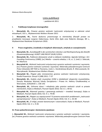 Mateusz Maria Bieczyński Lista publikacji - październik 2011 I. Publikacje książkowe (monografie): 1. Bieczyński, M., Prawne granice wolności twórczości artystycznej w zakresie sztuk wizualnych, 315 s., Wydawnictwo Wolters Kluwer 2011 2. Bieczyński, M., Teorie dyskursu prawniczego w niemieckiej filozofii prawa na przykładzie koncepcji Jurgena Habermasa, Karla Otto Apla oraz Roberta Alexego, 89 s., Wydawnictwo Naukowe Scriptorium 2010. II 1. 2. 3. 4. 5. 6. 7. 8. 9. Prace oryginalne, (rozdziały w książkach zbiorowych, artykuły w czasopismach): Bieczyński, M., Kunstbegriff in der juristischen Literatur und Rechtsprechung des BverfG (Zusammenfassung), KUNST UND RECHT (KUR) 5/2011 Bieczyński, M., Publiczne dotowanie sztuki w debacie medialnej. Agenda Settings i ArtFounding Controversy (1989), [w:] Media – czwarta władza, t. III, cz. 2, (red.) J. Sobczak, W. Machura Bieczyński M., Wolność twórczości artystycznej a granice wolności sumienia i wyznania, [w:] Prawne granice wolności sumienia i wyznania. Materiały pokonferencyjne Centrum Praw Człowieka INP PAN w Poznaniu, (red.) L. Kondratiewa-Bryzik, R. Wieruszewski, M. Wyrzykowski, Wydawnictwo Wolters Kluwer, Bieczyński M., Plagiat jako immanentna granica wolności twórczości artystycznej, Studia Prawnicze: Zeszyt II (188) 2011: 7-57 Bieczyński, M., Kodeks etyki muzealnej ICOM a działalność ekspercka muzealników, Zeszyty Naukowe Wyższej Szkoły Zarządzania i Prawa im. Heleny Chodkowskiej w Warszawie, 2(35)2010: s. 136-142 Bieczyński, M., Ochrona dzieci i młodzieży jako granica wolności sztuki w prawie niemieckim, Etyka w Mediach, Poznań-Opole 2010, Vol. 6: s. 49-61 Bieczyński M., Równość granicą i gwarancją wolności – trwałość koncepcji, Etyka w Mediach, Poznań-Opole 2010, Vol. 4: s. 79-85 Bieczyński, M., Plagiat czy zapożyczenie? O prawno-autorskich problemach „twórczości apriopriatywnej”, Etyka w Mediach, Poznań-Opole 2010, Vol. 4: s. 33-40 Bieczyński, M., O religii, prawie kanonicznym i wizerunkach, Etyka w Mediach, PoznańOpole 2010, Vol. 2: s. 9-26 III. Prace pokonferencyjne i doniesienia zjazdowe: 1. Bieczyński M., Wolność twórczości artystycznej a granice wolności sumienia i wyznania, [w:] Prawne granice wolności sumienia i wyznania. Materiały pokonferencyjne Centrum Praw 1 Człowieka INP PAN w Poznaniu, (red.) L. Kondratiewa-Bryzik, R. Wieruszewski, M. Wyrzykowski, Wydawnictwo Wolters Kluwer 2012. IV. Prace popularnonaukowe 1. Bieczyński, M., Węgierska diaspora fotograficzna i jej spuścizna, Październik 2011, Arteon 10(138): s. 6-8 2. Bieczyński, M., O prawnej tożsamości sztuki, Artluk 2(20)2011: s. 88-89 3. Bieczyński, M., Street Art - oswajanie sztuki ulicy, Lipiec 2011, Arteon 7(135): s. 14-16 4. Bieczyński, M., Kontemplacja sztuki w refleksji fotograficznej Thomasa Strutha, Format 60/2011: s. 70-73 5. Bieczyński, M., Imaginatywny teatr historii Yasumasa Morimury, Format 60/2011: 78-80 6. Bieczyński, M, Thomas Struth – najmłodszy uczeń Becherów, Czerwiec 2011, Arteon 6(134): s. 6-8 7. Bieczyński, M., Dwa oblicza Roberta Mapplethorpe’a, Marzec 2011, Arteon 3(131): 12-14 8. Bieczyński, M., Uśpiony kapitał. Wystawa kolekcji Cezarego Pieczyńskiego, Listopad 2010, Arteon 11(127): s. 10-13 9. Bieczyński, M., Shanshin, czyli fotografia japońska, Format 59/2011: s. 84-86 10. Bieczyński, M., Dynamika tożsamości, Format 59/2011: s. 88-90 11. Bieczyński, M., O Czarnym Lądzie językiem sztuki współczesnej, Sierpień 2010, Arteon 8(124): s. 10-13 12. Bieczyński, M., Brzydkie piękno, Lipiec 2010, Arteon 7(123): s. 26-27 13. Bieczyński, M., Chalo! India. O tokijskiej wystawie sztuki indyjskiej, Maj 2009, Arteon 5(109): 8-10 14. Bieczyński, M., Strategie fotograficznego portretu, Format 57/2009: 78-81 15. Bieczyński, M., Millenium School. Wywiad z polskim fotografem Krzysztofem Zielińskim, Format 57/2009, s. 93-94 16. Bieczyński, M., Wyniosła niepewność. O fotograficznych eksperymentach Erwina Olafa, Fotografia 29/2009: 66-71 17. Bieczyński, M., Czy fotografia musi być oryginalna? O praktykach artystycznych kontestujących zasady prawa autorskiego, Fotografia 29/2009: s. 111-114 18. Bieczyński, M., Doświadczenie i imaginacja. Wywiad z chińskim fotografem Weng Fenem, Format 57/2009, s. 95-96 19. Bieczyński, M., U źródeł współczesnej fotografii mody, Fotografia 28/2009: s. 46-52 20. Bieczyński, M., Jedność w wielości, wielość w jedności. O miesiącu fotografii w Berlinie, Fotografia 28/2009, s. 71-74 21. Bieczyński, M., Ugly Dolls, Marzec 2009, Arteon 3(107): 8-11 22. Bieczyński, M., Joseph Beuys – ostatni rewolucjonista, Listopad 2008, Arteon 11(103): 1214 2