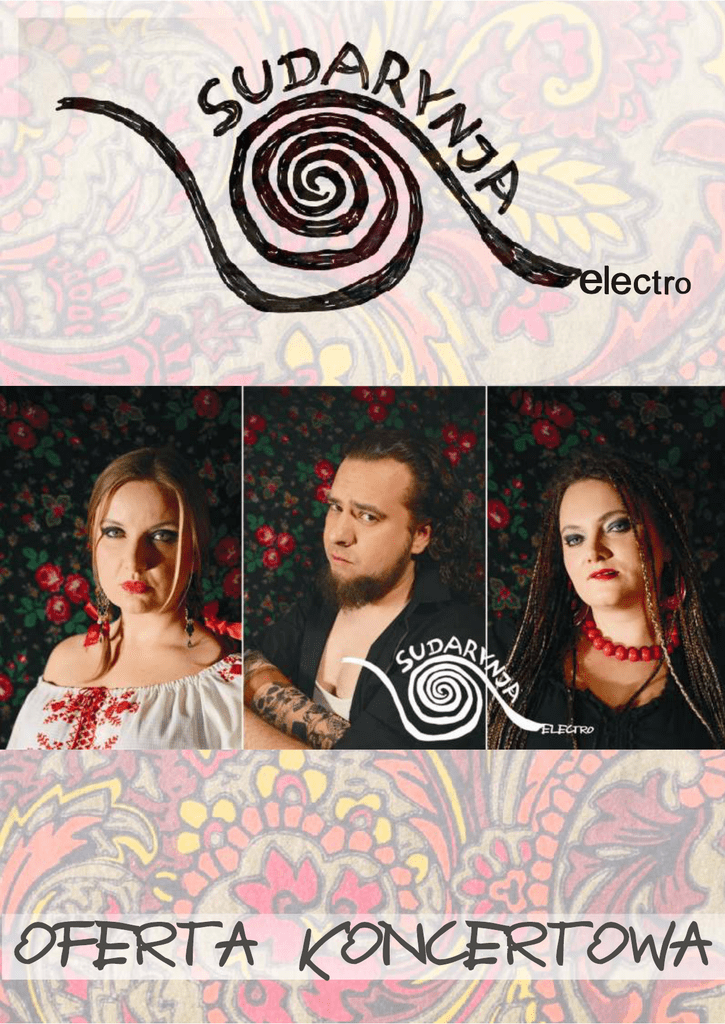 ...to nowoczesne, etno - folkowe, klubowe brzmienia,które narodziły się z połączenia żywiołowych, kobiecych wokali Sudarynji z elektronicznymi aranżami producenta muzycznego i DJ Rafała Gładysza. Efektem tej symbiozy jest skoczny, smaczny i energetyczny koktail białego śpiewu oraz mocnych, orientalnych bitów. Tradycje czterech stron świata splatają się tu z elektroniką, inspirowaną ognistymi Bałkanami oraz magicznym wschodem, tworząc taneczną, zmysłową całość. czas trwania koncertu: ok. 60 minut Sudarynja - powstała w 2003 roku jako grupa śpiewacza, by w 2011 roku przekształcić się w niezależny zespół. Sudarynja czerpie z tradycji muzycznych różnych stron świata, najbardziej interesuje nas Europa środkowo- wschodnia. W stale rosnącym repertuarze mamy pieśni ukraińskie, rosyjskie, bułgarskie, serbskie, macedońskie, gruzińskie, żydowskie, łemkowskie, cygańskie, polskie, prawosławne oraz kolędy, pastorałki, pieśni obrzędowe, kupalne. Wspólny mianownik naszego śpiewu to energia, harmonia i wielogłosowość. W tradycyjnym śpiewie szukamy nowych dróg i rozwiązań, wykorzystujemy różne techniki śpiewu, tworząc na bazie pieśni tradycyjnych własne aranże, głosy, nowe linie melodyczne.Na koncertach pojawiamy się w dwóch odsłonach: Sudarynja akustycznie ( Katarzyna Janas, Joanna Berenika Nitefor, Jakub Tul ) oraz Sudarynja Electro ( Katarzyna Janas, Joanna Berenika Nitefor, DJ Rafał Gładysz). Rafał Gładysz – kompozytor, producent muzyczny, DJ, założyciel studia „PINE ROOM STUDIO”. Przygodę z muzyką zaczął w roku 2003 od wydania kilku albumów awangardowej elektroniki w polskiej wytwórni Chill – Label oraz w brytyjskiej Artificial Bliss Records. Po setkach godzin spędzonych w domowym studio, udało mu się stworzyć własny, unikalny styl, hybrydę nowoczesnej muzyki elektronicznej oraz tradycyjnych brzmień instrumentów etnicznych z całego świata. Efektów jego pracy można posłuchać m.in. w projektach: Manasuna, Namaste 2.0, MISTIK, Sudarynja oraz w solowym projekcie DJ RAJOW. Zasięg muzyczny Rafała jest bardzo szeroki -od spokojnych plam dźwiękowych przez dubowo – dubstepowe brzmienia, po skoczne klubowe klimaty. W wolnych chwilach wyłącza prąd i pogrywa na magicznym instrumencie, rodem ze słowackich gór, zwanym futujara. muzyka: https://www.youtube.com/watch?v=amMiiYrq9a0 https://www.youtube.com/watch?v=hc3VwL7RqOg debiutancki klip: https://www.youtube.com/watch?v=cGMgst3fLHE http://www.sudarynja.com http://www.facebook.com/Sudarynja https://www.youtube.com/user/sudarynjafolk http://ethnocloud.com/Sudarynja/ http://soundcloud.com/sudarynja