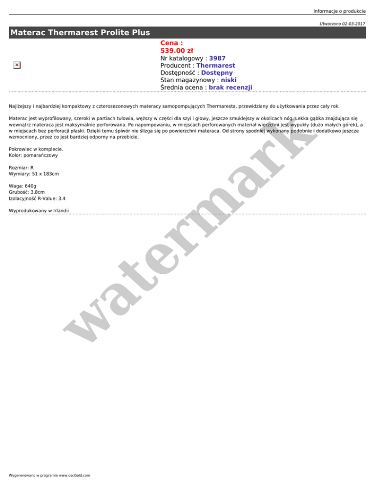 Informacje o produkcie Utworzono 02-03-2017 Materac Thermarest Prolite Plus Cena : 539.00 zł Nr katalogowy : 3987 Producent : Thermarest Dostępność : Dostępny Stan magazynowy : niski Średnia ocena : brak recenzji Najlżejszy i najbardziej kompaktowy z czterosezonowych materacy samopompujących Thermaresta, przewidziany do użytkowania przez cały rok. Pokrowiec w komplecie. Kolor: pomarańczowy Rozmiar: R Wymiary: 51 x 183cm Waga: 640g Grubość: 3.8cm Izolacyjność R-Value: 3.4 w at Wyprodukowany w Irlandii er m ar k Materac jest wyprofilowany, szeroki w partiach tułowia, węższy w części dla szyi i głowy, jeszcze smuklejszy w okolicach nóg. Lekka gąbka znajdująca się wewnątrz materaca jest maksymalnie perforowana. Po napompowaniu, w miejscach perforowanych materiał wierzchni jest wypukły (dużo małych górek), a w miejscach bez perforacji płaski. Dzięki temu śpiwór nie ślizga się po powierzchni materaca. Od strony spodniej wykonany podobnie i dodatkowo jeszcze wzmocniony, przez co jest bardziej odporny na przebicie. Wygenerowano w programie www.oscGold.com