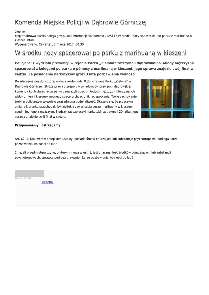 Komenda Miejska Policji w Dąbrowie Górniczej Źródło: http://dabrowa.slaska.policja.gov.pl/ka8/informacje/wiadomosci/125112,W-srodku-nocy-spacerowal-po-parku-z-marihuana-wkieszeni.html Wygenerowano: Czwartek, 2 marca 2017, 00:30 W środku nocy spacerował po parku z marihuaną w kieszeni Policjanci z wydziału prewencji w rejonie Parku „Zielona” zatrzymali dąbrowianina. Młody mężczyzna spacerował z kolegami po parku o północy z marihuaną w kieszeni. Jego sprawa znajdzie swój finał w sądzie. Za posiadanie narkotyków grozi 3 lata pozbawienia wolności. Do zdarzenia doszło wczoraj w nocy około godz. 0.30 w rejonie Parku „Zielona” w Dąbrowie Górniczej. Stróże prawa z zespołu wywiadowców prewencji dąbrowskiej komendy kontrolując rejon parku zauważyli trzech młodych mężczyzn, którzy na ich widok zmienili kierunek nocnego spaceru chcąc uniknąć spotkania. Takie zachowanie trójki u policjantów wywołało uzasadnioną podejrzliwość. Okazało się, że przyczyną zmiany kierunku przechadzki był zwitek z zawartością suszu marihuany w kieszeni spodni jednego z mężczyzn. Śledczy zabezpieczyli narkotyki i zatrzymali 20-latka. Jego sprawa znajdzie swój finał w sądzie. Przypominamy i ostrzegamy: Art. 62. 1. Kto, wbrew przepisom ustawy, posiada środki odurzające lub substancje psychotropowe, podlega karze pozbawienia wolności do lat 3. 2. Jeżeli przedmiotem czynu, o którym mowa w ust. 1, jest znaczna ilość środków odurzających lub substancji psychotropowych, sprawca podlega grzywnie i karze pozbawienia wolności do lat 5. Ocena: 0/5 (0) Tweetnij