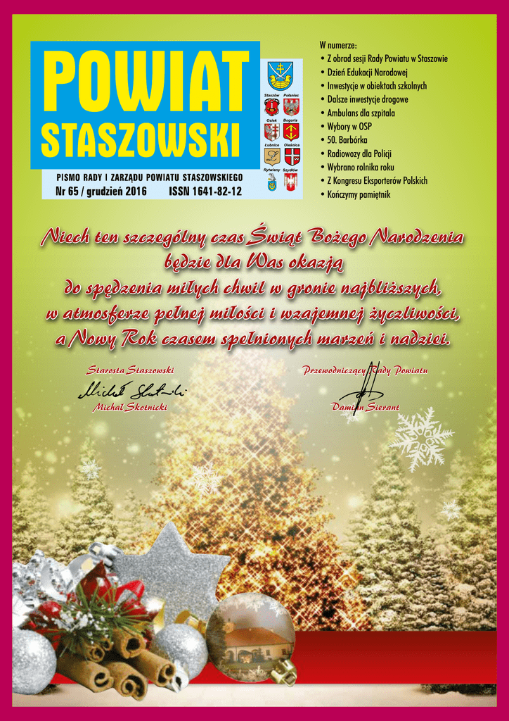 1 W numerze: • Z obrad sesji Rady Powiatu w Staszowie • Dzień Edukacji Narodowej • Inwestycje w obiektach szkolnych • Dalsze inwestycje drogowe • Ambulans dla szpitala • Wybory w OSP • 50. Barbórka • Radiowozy dla Policji • Wybrano rolnika roku • Z Kongresu Eksporterów Polskich • Kończymy pamiętnik Niech ten szczególny czas Świąt Bożego Narodzenia będzie dla Was okazją do spędzenia miłych chwil w gronie najbliższych, w atmosferze pełnej miłości i wzajemnej życzliwości, a Nowy Rok czasem spełnionych marzeń i nadziei. Starosta Staszowski Przewodniczący Rady Powiatu Michał Skotnicki Damian Sierant 2 Z prac Rady i Zarządu Powiatu... Posiedzenie odbyło się w dniu 28 listopada br. Do zaproponowanego porządku obrad, wicestarosta Tomasz Fąfara, w imieniu Zarządu Powiatu w Staszowie, zawnioskował o wprowadzenie pod głosowanie 3 dodatkowych projektów, które dotyczyły: wyboru biegłego rewidenta do badania sprawozdania finansowego Samodzielnego Publicznego Zespołu Zakładów Opieki Zdrowotnej w Staszowie za 2016 rok, zmiany uchwały nr 67/16 w sprawie udzielenia pomocy finansowej gminie Rytwiany i zmiany uchwały nr 41/16 w sprawie udzielenia pomocy finansowej gminie Szydłów. Z obrad 34. sesji Rady Powiatu w Staszowie Oprócz w/w 3 projektów, radni przegłosowali również projekty uchwał dotyczące: ustalenia przebiegu istniejących dróg powiatowych na terenie powiatu staszowskiego, ustalenia wysokości opłat za usuwanie pojazdów z dróg w granicach administracyjnych powiatu staszowskiego i ich przechowywanie na parkingu strzeżonym, uchwalenia ,,Rocznego programu współpracy Powiatu Staszowskiego z organizacjami pozarządowymi, podmiotami pożytku publicznego i wolontariatu na rok 2017”, zmian w Wieloletniej Prognozie Finansowej Powiatu Staszowskiego na lata 2016-2027 oraz zmian w budżecie powiatu na 2016 rok. Dokonano także zmian w 7 wcześniej przyjętych uchwałach o udzieleniu pomocy finansowej gminom: Staszów, Połaniec, Osiek, Rytwiany, Łubnice i Bogoria, wynikających z dostosowania udzielonej pomocy do faktycznej wysokości po przetargach lub pomniejszonej o podatek VAT, odliczany przez gminy. W punkcie interpelacje i zapytania radni poruszali sprawy dotyczące, m.in.: remontów dróg powiatowych, finansowania Powiatowego Centrum Sportowego w Staszowie oraz wspierania przez radnych powiatu inicjatyw na rzecz osób potrzebujących pomocy. Niemniej, zaskoczeniem dla radnych, jak i gości zaproszonych na posiedzenie, było pytanie wiceprzewodnicząWicestarosta Tomasz Fąfara, w imieniu Zarządu Powiatu w Staszowie, cego Rady Stani- zawnioskował o wprowadzenie pod głosowanie 3 dodatkowych projektów, które wcześniej były dyskutowane w czasie posiedzeń Komisji Stałych Rady Powiatu. sława Walczyka, skierowane do starosty staszowskiego atmosfery pracy w szkole, niesłusznie Michała Skotnickiego, dotyczące rze- wytwarzając atmosferę niepewności. komego zamiaru ,,wygaszenia” działal- Placówka ta, podobnie jak wszystkie ności Zespołu Szkół w Połańcu, włącz- pozostałe szkoły ponadgimnazjalne nie do zamknięcia tej placówki. Staro- prowadzone przez powiat staszowski, sta kategorycznie zaprzeczył tego typu może dalej liczyć na wsparcie swojego informacjom i wyraził zdziwienie, że rozwoju, jak chociażby na podobne insą one w określonych kręgach wymy- westycje jakie w roku ubiegłym, koszślane i kolportowane. Starosta Michał tem blisko 460 tys. zł, dokonano tam Skotnicki poprosił radnych o demen- w infrastrukturze sportowej – remont towanie tych fałszywych informacji, hali, zaplecza sanitarnego i boisk. Tekst i foto: Jan Mazanka które nie służą tworzeniu pozytywnej Podobnie jak w roku ubiegłym, Dzień Edukacji Narodowej w Staszowie uczczono obradami połączonych sesji Rady Powiatu i Rady Miejskiej Staszowa. Posiedzenie odbyło się w dniu 21 października br. w auli Zespołu Szkół przy ul. Koszarowej. Obrady prowadzili wspólnie: przewodniczący Rady Powiatu Damian Sierant i przewodniczący Rady Miejskiej Ireneusz Kwiecjasz, którzy na wstępie powitali zaproszonych gości w osobach: wojewody świętokrzyskiego Agaty Wojtyszek, marszałka województwa świętokrzyskiego Adama Jarubasa, świętokrzyskiego kuratora oświaty Kazimierza Mądzika, a także obecnych na uroczystości: pedagogów, pracowników cywilnych oświaty, samorządowców i przedsiębiorców. Pierwsze przemówienie wygłosił przewodniczą- Dzień Edukacji uczczono sesjami Rad Obrady prowadzili wspólnie: przewodniczący Rady Powiatu w Staszowie Damian Sierant i przewodniczący Rady Miejskiej Staszowa Ireneusz Kwiecjasz. 3 cy Damian Sierant, który przypomniał historię powstania Komisji Edukacji Narodowej i tworzenia systemu edukacji u schyłku XVIII wieku. Przewodniczący Damian Sierant podkreślił znaczenie nauki i oświaty dla podtrzymania ducha narodowego w okresie zaborów, a także podziękował pedagogom za obecny trud kształcenia i wychowania młodego pokolenia. Następnie głos zabrał starosta staszowski Michał Skotnicki, który przekazał wyrazy wdzięczności nauczycielom i dyrektorom oraz pracownikom administracji szkolnej za zaangażowanie i codzienny trud w kształceniu i wychowaniu młodzieży, a także w administrowaniu placówkami oświaty na terenie powiatu. Życzenia i gratulacje złożyli także: burmistrz miasta i gminy Staszów Leszek Kopeć i przewodniczący Rady Miejskiej Staszowa Ireneusz Kwiecjasz, a pod koniec obrad sesji do grona przemawiających dołączyli: wojewoda Agata Wojtyszek, marszałek Adam Jarubas i kurator Kazimierz Mądzik. Życzenia i gratulacje pedagogom składa starosta staszowski Michał Skotnicki. W pierwszym rzędzie, od lewej: wicestarosta Tomasz Fąfara, świętokrzyski kurator oświaty Kazimierz Mądzik, wojewoda świętokrzyski Agata Wojtyszek, burmistrz miasta i gminy Staszów Leszek Kopeć, marszałek województwa świętokrzyskiego Adam Jarubas, starosta sta