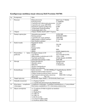 Konfiguracja mobilnej stacji roboczej Dell Precision M4700: Lp. Komponent Opis 1. Procesor 2 Chipset Klasa procesora: Intel Core i7 Mobile Kod procesora: i7-3840QM Częstotliwości taktowania procesora: 3,8 GHz Częstotliwość szyny QPI/DMI 5 GT/s Pojemność pamięci podręcznej 8 MB Technologia Hyperthreading Tak Technologia Intel vPro Tak Chipset Mobile Intel® QM77 Express 3 Pamięć operacyjna 4 Dyski twarde 5 Wyświetlacz graficzna 6 Dźwięk 7 Komunikacja 8 Napęd optyczny 9 Gniazda rozszerzeń 10 11 i Zainstalowana pamięć 16384 MB Rodzaj pamięci SODIMM DDR3 Częstotliwość szyny pamięci 1600 MHz Maksymalna wielkość pamięci 32768 MB Ilość banków pamięci 4 szt. Pojemność dysku: HDD0 256 GB HDD1 1 TB Rodzaj dysku HDD0 SSD HDD1 nośnik magnetyczny karta Przekątna ekranu LCD 15,6 cali Typ ekranu TFT Full-HD [LED] Maksymalna rozdzielczość LCD 1920 x 1080 Typ karty graficznej nVidia Quadro K2000M Zainstalowana pamięć wideo 2048 MB Karta dźwiękowa Zintegrowana Głośniki stereo: wbudowane Mikrofon 2 wbudowane Wyjście słuchawkowe Wejście na mikrofon Karta sieciowa: 10/100/1000BaseT Gigabitethernet (RJ45) Bezprzewodowa karta sieciowa Tak Chipset bezprzewodowej karty sieciowej Intel Typ bezprzewodowej karty sieciowej IEEE 802.11a/b/g/n Bluetooth Tak, 4.0 DVD±RW Super Multi (+ DVD-RAM) Dual Layer 1 x Express Card 54 1 x czytnik kart procesorowych (SmartCard) Klawiatura i urządzenie Urządzenia wskazujące TouchPad wielodotykowy z 3 przyciskami wskazujące Klawiatura standardowa US z klawiaturą numeryczną Złącza zewnętrzne 1x 15-stykowe D-Sub (wyjście na monitor) 1 x HDMI 1x DisplayPort 2x USB 2.0 2x USB 3.0 1x RJ-45 (LAN) 1x E-SATA/USB Combo 1x FireWire (IEEE1394) 12 Czytnik kart pamięci 13 Bateria Wyjście słuchawkowe wejście na mikrofon wejście zasilania (DC-in) Replikator portów Wbudowany. typu all-in-one. Typy odczytywanych kart pamięci: SecureDigital Card SecureDigital Card High-Capacity (SDHC) SecureDigital eXtended Capacity (SDXC) MultiMedia Card MemoryStick MemoryStick Pro MemoryStick Duo MemoryStick Pro Duo xD-Picture Card Litowo jonowa 9 – komorowa 14 System operacyjny Microsoft Windows 7 Professional PL 64-bit 15 Wyposażenie dodatkowe 16 Warunki serwisu . gwarancji Zintegrowana kamera Czytnik linii papilarnych Podświetlana klawiatura Dedykowany zasilacz sieciowy Dedykowana torba Dell Executive up to 16'' Leather Attache i Czas gwarancji: 36 miesięcy Typ gwarancji: serwis w miejscu użytkowania w następnym po zgłoszeniu dniu roboczym (on-site, next business day)