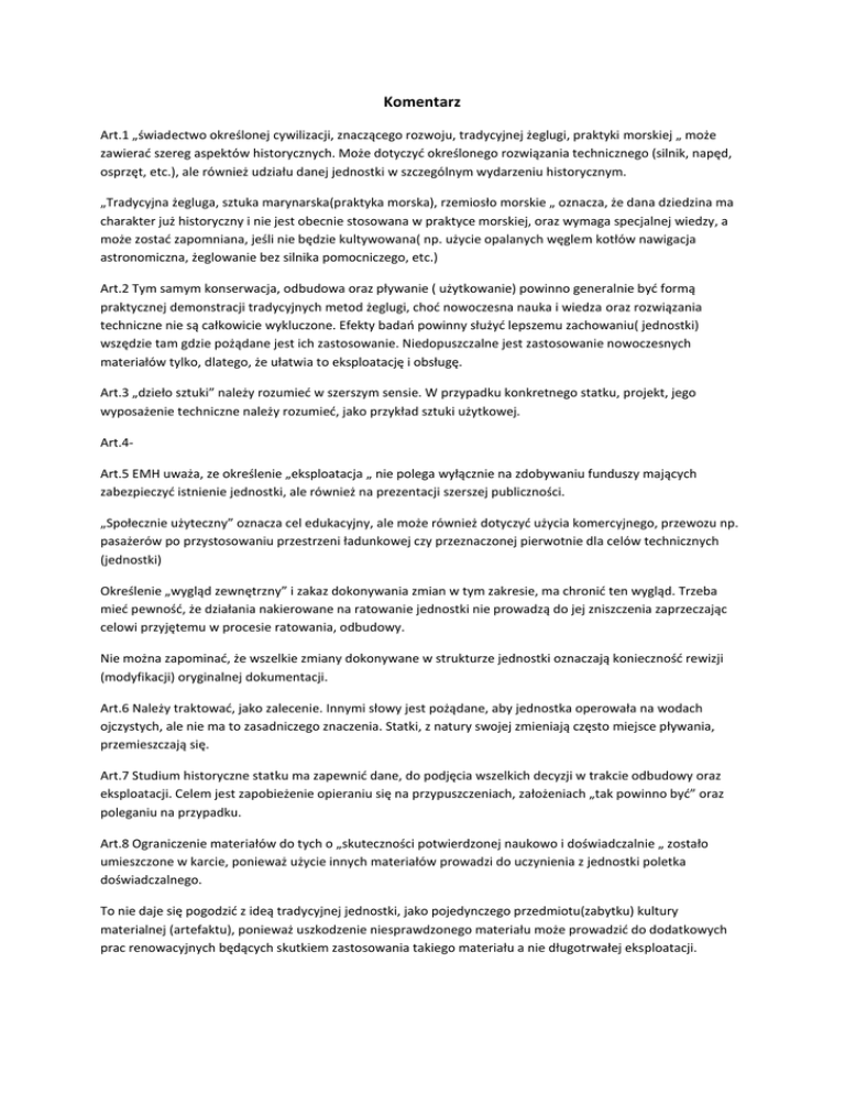 Komentarz Art.1 „świadectwo określonej cywilizacji, znaczącego rozwoju, tradycyjnej żeglugi, praktyki morskiej „ może zawierad szereg aspektów historycznych. Może dotyczyd określonego rozwiązania technicznego (silnik, napęd, osprzęt, etc.), ale również udziału danej jednostki w szczególnym wydarzeniu historycznym. „Tradycyjna żegluga, sztuka marynarska(praktyka morska), rzemiosło morskie „ oznacza, że dana dziedzina ma charakter już historyczny i nie jest obecnie stosowana w praktyce morskiej, oraz wymaga specjalnej wiedzy, a może zostad zapomniana, jeśli nie będzie kultywowana( np. użycie opalanych węglem kotłów nawigacja astronomiczna, żeglowanie bez silnika pomocniczego, etc.) Art.2 Tym samym konserwacja, odbudowa oraz pływanie ( użytkowanie) powinno generalnie byd formą praktycznej demonstracji tradycyjnych metod żeglugi, chod nowoczesna nauka i wiedza oraz rozwiązania techniczne nie są całkowicie wykluczone. Efekty badao powinny służyd lepszemu zachowaniu( jednostki) wszędzie tam gdzie pożądane jest ich zastosowanie. Niedopuszczalne jest zastosowanie nowoczesnych materiałów tylko, dlatego, że ułatwia to eksploatację i obsługę. Art.3 „dzieło sztuki” należy rozumied w szerszym sensie. W przypadku konkretnego statku, projekt, jego wyposażenie techniczne należy rozumied, jako przykład sztuki użytkowej. Art.4Art.5 EMH uważa, ze określenie „eksploatacja „ nie polega wyłącznie na zdobywaniu funduszy mających zabezpieczyd istnienie jednostki, ale również na prezentacji szerszej publiczności. „Społecznie użyteczny” oznacza cel edukacyjny, ale może również dotyczyd użycia komercyjnego, przewozu np. pasażerów po przystosowaniu przestrzeni ładunkowej czy przeznaczonej pierwotnie dla celów technicznych (jednostki) Określenie „wygląd zewnętrzny” i zakaz dokonywania zmian w tym zakresie, ma chronid ten wygląd. Trzeba mied pewnośd, że działania nakierowane na ratowanie jednostki nie prowadzą do jej zniszczenia zaprzeczając celowi przyjętemu w procesie ratowania, odbudowy. Nie można zapominad, że wszelkie zmiany dokonywane w strukturze jednostki oznaczają koniecznośd rewizji (modyfikacji) oryginalnej dokumentacji. Art.6 Należy traktowad, jako zalecenie. Innymi słowy jest pożądane, aby jednostka operowała na wodach ojczystych, ale nie ma to zasadniczego znaczenia. Statki, z natury swojej zmieniają często miejsce pływania, przemieszczają się. Art.7 Studium historyczne statku ma zapewnid dane, do podjęcia wszelkich decyzji w trakcie odbudowy oraz eksploatacji. Celem jest zapobieżenie opieraniu się na przypuszczeniach, założeniach „tak powinno byd” oraz poleganiu na przypadku. Art.8 Ograniczenie materiałów do tych o „skuteczności potwierdzonej naukowo i doświadczalnie „ zostało umieszczone w karcie, ponieważ użycie innych materiałów prowadzi do uczynienia z jednostki poletka doświadczalnego. To nie daje się pogodzid z ideą tradycyjnej jednostki, jako pojedynczego przedmiotu(zabytku) kultury materialnej (artefaktu), ponieważ uszkodzenie niesprawdzonego materiału może prowadzid do dodatkowych prac renowacyjnych będących skutkiem zastosowania takiego materiału a nie długotrwałej eksploatacji. Art.9 Statki mogą się zmieniad na przestrzeni lat, z powodu zmiany ładunków przewożonych, metod napędu, lub z innych powodów w trakcie eksploatacji. Ten artykuł wskazuje na możliwośd wybrania dowolnego momentu, jako punktu odniesienia odbudowy. Art.10 Ten artykuł podkreśla, że nowoczesne wyposażenie nie musi pozostawad w sprzeczności z tradycyjnym. Art.11 Stwierdza, że nowoczesne wyposażenie nawigacyjne i bezpieczeostwa są niezbędne do bezpiecznej eksploatacji jednostki tradycyjnej. Nie zmienia to faktu, że to wyposażenie musi byd (dodane) zamontowane w sposób niekolidujący z interesującymi częściami jednostki, jej wyposażeniem i proporcjami bryły ( kompozycją). Art.12 Dokumentacja jest absolutnie niezbędna, aby zabezpieczyd długotrwałą, jakośd jednostki, jako zabytku historycznego, ponieważ w innym przypadku nie będzie możliwe, w przyszłości odróżnienie, które rozwiązania są oryginalne, a które dodane później. Komentarz autorstwa Dr Ingo Heidbrink (German Maritime Museum) Oparte na materiale autorstwa David Morgan, współpraca John Robinson Wersja 3 /03 wrzesień 20003