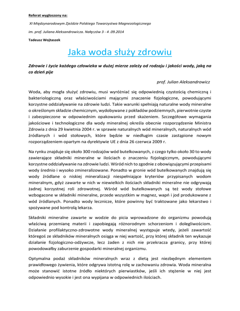 Referat wygłoszony na: XI Międzynarodowym Zjeździe Polskiego Towarzystwa Magnezologicznego im. prof. Juliana Aleksandrowicza. Nałęczów 3 - 4 .09.2014 Tadeusz Wojtaszek Jaka woda służy zdrowiu Zdrowie i życie każdego człowieka w dużej mierze zależy od rodzaju i jakości wody, jaką na co dzień pije prof. Julian Aleksandrowicz Woda, aby mogła służyć zdrowiu, musi wyróżniać się odpowiednią czystością chemiczną i bakteriologiczną oraz właściwościami mającymi znaczenie fizjologiczne, powodującymi korzystne oddziaływanie na zdrowie ludzi. Takie warunki spełniają naturalne wody mineralne o określonym składzie chemicznym, wydobywane z pokładów podziemnych, pierwotnie czyste i zabezpieczone w odpowiednim opakowaniu przed skażeniem. Szczegółowe wymagania jakościowe i technologiczne dla wody mineralnej określa obecnie rozporządzenie Ministra Zdrowia z dnia 29 kwietnia 2004 r. w sprawie naturalnych wód mineralnych, naturalnych wód źródlanych i wód stołowych, które będzie w niedługim czasie zastąpione nowym rozporządzeniem opartym na dyrektywie UE z dnia 26 czerwca 2009 r. Na rynku znajduje się około 300 rodzajów wód butelkowanych, z czego tylko około 30 to wody zawierające składniki mineralne w ilościach o znaczeniu fizjologicznym, powodującymi korzystne oddziaływanie na zdrowie ludzi. Wśród nich to zgodnie z obowiązującymi przepisami wody średnio i wysoko zmineralizowane. Ponadto w gronie wód butelkowanych znajdują się wody źródlane o niskiej mineralizacji niespełniające kryteriów przypisanych wodom mineralnym, gdyż zawarte w nich w niewielkich ilościach składniki mineralne nie odgrywają żadnej korzystnej roli zdrowotnej. Wśród wód butelkowanych są też wody stołowe wzbogacone w składniki mineralne, przede wszystkim w magnez, wapń i jod produkowane z wód źródlanych. Ponadto wody lecznicze, które powinny być traktowane jako lekarstwo i spożywane pod kontrolą lekarza. Składniki mineralne zawarte w wodzie do picia wprowadzone do organizmu powodują właściwą przemianę materii i zapobiegają różnorodnym schorzeniom i dolegliwościom. Działanie profilaktyczno-zdrowotne wody mineralnej występuje wtedy, jeżeli zawartość któregoś ze składników mineralnych osiąga w niej wartość, przy której składnik ten wykazuje działanie fizjologiczno-odżywcze, lecz żaden z nich nie przekracza granicy, przy której powodowałby zaburzenie gospodarki mineralnej organizmu. Optymalna podaż składników mineralnych wraz z dietą jest niezbędnym elementem prawidłowego żywienia, które odgrywa istotną rolę w zachowaniu zdrowia. Woda mineralna może stanowić istotne źródło niektórych pierwiastków, jeśli ich stężenie w niej jest odpowiednio wysokie i jest ona wypijana w odpowiednich ilościach. Wody podziemne mogą zawierać nawet do 70 różnego rodzaju składników, ale w wodach mineralnych, z których produkowane mogą być wody profilaktyczno-zdrowotne, praktyczne znaczenie fizjologiczno-odżywcze ma tylko dziesięć składników. Są to magnez, wapń, sód, chlorki, siarczany, żelazo, fluorki, jodki, wodorowęglany i dwutlenek węgla. Inne takie jak: potas, lit, bar, stront, mangan, brom, cynk, miedź, itp. występują w tego typu wodach w tak małych ilościach, że nie mają większego znaczenia. Znaczenie poszczególnych składników wód mineralnych Magnez Magnez bierze udział w ponad trzystu procesach biochemicznych i dlatego decyduje o prawidłowej czynności układu immunologicznego i nerwowo mięśniowego Potrzebny jest w przemianach energetycznych przy spalaniu węglowodanów i tłuszczów, do odbudowy białka i kwasów nukleinowych oraz nośników cech dziedzicznych. Zapobiega chorobom nowotworowym i zaburzeniom rozwojowym, miażdżycy naczyń krwionośnych, zawałom serca, kamicy nerkowej zaburzeniom ciąży i opóźnieniom rozwoju płodu. Magnez obniża ciśnienie tętnicze krwi, zmniejsza napięcie nerwowe, przeciwdziała stresom, łagodzi zaburzenia snu i zmniejsza szkodliwe skutki działania alkoholu na organizm. Chroni przed zatruciem związkami fluoru, rtęci, ołowiu i innych metali ciężkich, oraz neutralizuje skutki innych zanieczyszczeń przemysłowych. Ułatwia wchłanianie podawanych leków i wzmacnia ich działanie terapeutyczne. Skutki niedoboru magnezu mogą być poważne i mogą doprowadzić do arytmii i niewydolności pracy serca, nadciśnienia tętniczego czy astmy. Poza tym mogą wystąpić dokuczliwe dolegliwości, takie jak drganie powiek i mięśni, skurcze i drętwienie kończyn, osłabienie, bóle głowy. Bardzo często wynikiem niedoboru magnezu jest nadpobudliwość nerwowa oraz zaburzenia snu, a nawet wrażliwość na zmiany pogody. Człowiek potrzebuje codziennie około 300-350 mg magnezu. Osoby podlegające stresom i ciężko pracujące oraz sportowcy i kobiety ciężarne potrzebują go około 450-525 mg. Przy typowej diecie, wraz z żywnością trafia w ciągu doby do organizmu zaledwie 2/3 potrzebnej dawki magnezu, a jego niedobór w przeciętnej diecie wynosi około 100 mg. Uzupełnianie magnezu w organizmie powinno odbywać się równocześnie z podaniem wapnia. Wody mineralne mogą być znaczącym źródłem magnezu w diecie. Jeżeli woda mineralna zawiera co najmniej 50 mg magnezu w litrze można ją wtedy oznaczać, że „zawiera magnez”. Wodę taką można zaliczyć do wód profilaktycznozdrowotnych i poleca się ją osobom narażonym na stresy oraz duży wysiłek umysłowy i fizyczny, rekonwalescentom, sportowcom, młodzieży, dzieciom i osobą w starszym wieku oraz kobietom ciężarnym i matkom karmiącym. Woda taka skutecznie gasi pragnienie oraz łagodzi skutki stanów poalkoholowych. Wapń Wapń jest podstawowym budulcem naszego układu kostnego, zębów i paznokci. Jest aktywatorem wielu enzymów, wpływa korzystnie na przemianę materii i jest niezbędny do utrzymywania prawidłowej czynności serca oraz prawidłowej aktywności uk