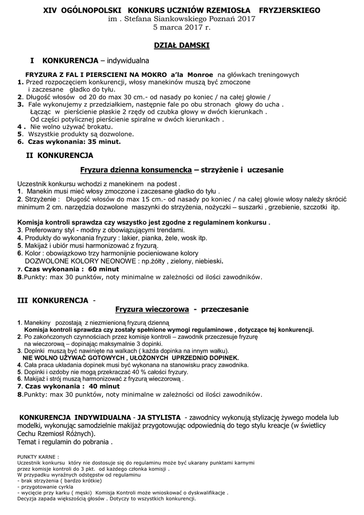 XIV OGÓLNOPOLSKI KONKURS UCZNIÓW RZEMIOSŁA FRYZJERSKIEGO im . Stefana Siankowskiego Poznań 2017 5 marca 2017 r. DZIAŁ DAMSKI I KONKURENCJA – indywidualna FRYZURA Z FAL I PIERSCIENI NA MOKRO a’la Monroe na główkach treningowych 1. Przed rozpoczęciem konkurencji, włosy manekinów muszą być zmoczone i zaczesane gładko do tyłu. 2. Długość włosów od 20 do max 30 cm.- od nasady po koniec / na całej głowie / 3. Fale wykonujemy z przedziałkiem, następnie fale po obu stronach głowy do ucha . Łącząc w pierścienie płaskie 2 rzędy od czubka głowy w dwóch kierunkach . Od części potylicznej pierścienie spiralne w dwóch kierunkach . 4 . Nie wolno używać brokatu. 5. Wszystkie produkty są dozwolone. 6. Czas wykonania: 35 minut. II KONKURENCJA Fryzura dzienna konsumencka – strzyżenie i uczesanie Uczestnik konkursu wchodzi z manekinem na podest . 1. Manekin musi mieć włosy zmoczone i zaczesane gładko do tyłu . 2. Strzyżenie : Długość włosów do max 15 cm.- od nasady po koniec / na całej głowie włosy należy skrócić minimum 2 cm. narzędzia dozwolone maszynki do strzyżenia, nożyczki – suszarki , grzebienie, szczotki itp. Komisja kontroli sprawdza czy wszystko jest zgodne z regulaminem konkursu . 3. Preferowany styl - modny z obowiązującymi trendami. 4. Produkty do wykonania fryzury : lakier, pianka, żele, wosk itp. 5. Makijaż i ubiór musi harmonizować z fryzurą. 6. Kolor : obowiązkowo trzy harmonijnie pocieniowane kolory DOZWOLONE KOLORY NEONOWE : np.żółty , zielony, niebieski. Czas wykonania : 60 minut 8.Punkty: max 30 punktów, noty minimalne w zależności od ilości zawodników . 7. III KONKURENCJA Fryzura wieczorowa - przeczesanie 1. Manekiny pozostają z niezmienioną fryzurą dzienną Komisja kontroli sprawdza czy zostały spełnione wymogi regulaminowe , dotyczące tej konkurencji. 2. Po zakończonych czynnościach przez komisje kontroli – zawodnik przeczesuje fryzurę na wieczorową – dopinając maksymalnie 3 dopinki. 3. Dopinki muszą być nawinięte na walkach ( każda dopinka na innym wałku). NIE WOLNO UŻYWAĆ GOTOWYCH , UŁOŻONYCH UPRZEDNIO DOPINEK. 4. Cała praca układania dopinek musi być wykonana na stanowisku pracy zawodnika. 5. Dopinki i ozdoby nie mogą przekraczać 40 % całości fryzury. 6. Makijaż i strój muszą harmonizować z fryzurą wieczorową . 7. Czas wykonania : 40 minut 8.Punkty: max 30 punktów, noty minimalne w zależności od ilości zawodników . KONKURENCJA INDYWIDUALNA - JA STYLISTA - zawodnicy wykonują stylizację żywego modela lub modelki, wykonując samodzielnie makijaż przygotowując odpowiednią do tego stylu kreacje (w świetlicy Cechu Rzemiosł Różnych). Temat i regulamin do pobrania . PUNKTY KARNE : Uczestnik konkursu który nie dostosuje się do regulaminu może być ukarany punktami karnymi przez komisje kontroli do 3 pkt. od każdego członka komisji . W przypadku wyraźnych odstępstw od regulaminu - brak strzyżenia ( bardzo krótkie) - przygotowanie cyrkla - wycięcie przy karku ( męski) Komisja Kontroli może wnioskować o dyskwalifikacje . Decyzja zapada większością głosów . Dotyczy to wszystkich konkurencji.