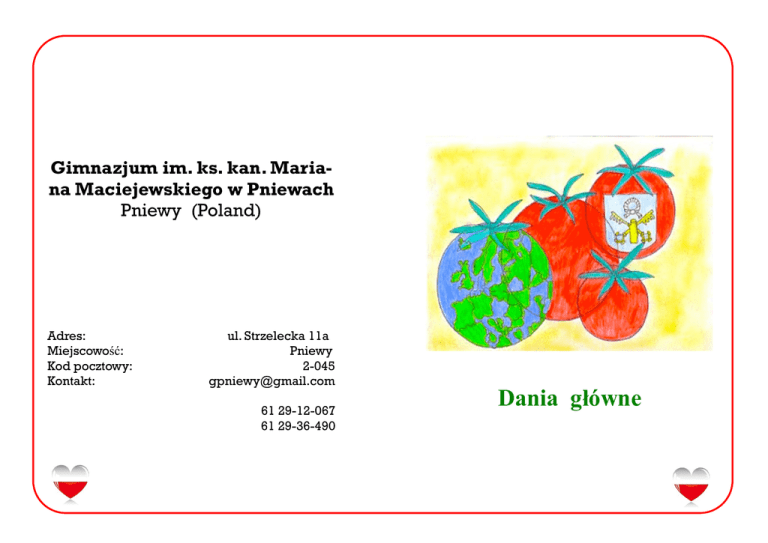 Gimnazjum im. ks. kan. Mariana Maciejewskiego w Pniewach Pniewy (Poland) Adres: Miejscowość: Kod pocztowy: Kontakt: ul. Strzelecka 11a Pniewy 2-045 [email protected] 61 29-12-067 61 29-36-490 Dania główne GOŁĄBKI INACZEJ Składniki 1kg kapusty białej 1kg mielonego mięsa Kaszka manna /by masa była odpowiednio gęsta/ 4 jajka 4 ząbki czosnku Pieprz, sól do smaku Oliwa do smażenia, bułka tarta /drobno zmielona/ ZALEWA Przecier pomidorowy Kostki rosołowe 1l wody Ziele angielskie Liść laurowy Przygotowanie Kapustę opłukać, obrać z pierwszych liści, pokroić w drobną kostkę. Mielone, kapustę , kaszkę manną, jajka, sól, pieprz do smaku – wszystko razem wymieszać. Uformować klopsiki. Klopsy usmażyć obtoczone w bułce na oleju. Po usmażeniu klopsów włożyć je do zalewy i gotować do miękkości (około 1 godz ) na małym ogniu. Podawać z gotowanymi ziemniakami, ryżem lub bułką. Można po- sypać posiekaną natką truszki. GOŁĄBKI TRADYCYJNE pie- Składniki 1 główka kapusty 0,5 kg mięsa mielonego 70 g (1/3 szklanki) ryżu 1 jajko 1 cebula 40 g (2 łyżki stołowe) margaryny 40 g ( 2 łyżki stołowe) koncentratu pomidorowego 12 g (1 łyżka stołowa) mąki Sól, pieprz, majeranek Przygotowanie Kapustę opłukać, obrać z wierzchnich liści. Główkę kapusty sparzyć wrzątkiem i oddzielić wszystkie liście, z których należy powycinać grube nerwy. Do mielonego mięsa dodać ugotowany ryż, pokrojoną w kostkę i podsmażoną cebulę , jajko, sól, pieprz i majeranek. Wszystkie składniki starannie wymieszać. Małe porcje farszu układać na przygotowanych liściach i ciasno zawijać. W rondlu podgrzać tłuszcz i ciasno ułożyć gołąbki. Podgrzewać pod przykryciem około 10 min, następnie dolać nieco wody i gotować na wolnym ogniu około godziny. Przecier pomidorowy połączyć z wodą i mąką, wlać do rondla i zagotować, posolić do smaku. Podawać z gotowanymi ziemniakami lub chlebem. PLACKI ZIEMNIACZANE Z SOSEM POMIDOROWYM KLOPSIKI W SOSIE POMIDOROWYM Składniki 600 mielonego mięsa 1 -2 kajzerki 1 cebula 1 jajko 2 łyżki oleju sól, pieprz, majeranek bułka tarta tłuszcz do smażenia (olej) Sos: 1 kg cebuli 2 liście laurowe 3- 4 ziarna ziela angielskiego kilka ziaren czarnego pieprzu 1 półlitrowy karton gęstego soku pomidorowego (albo krojone pomidory z kartonu i kilka łyżek koncentratu pomidorowego) sok z cytryny cukier 1 szklana wody olej do smażenia Przygotowanie Mięso , namoczoną wcześniej kajzerkę, drobno pokrojoną cebulę podsmażoną na oleju, jajko i przyprawy połączyć, by powstała jednolita masa i formować małe kotleciki . Obtoczyć w bułce tartej i obsmażyć z każdej strony, przełożyć do większego garnka , dolać trochę wody. Dusić na wolnym ogniu aż będą miękkie. Klopsiki wyłożyć do naczynia żaroodpornego albo do dużej salaterki. Do wywaru po duszeniu kotletów dodać jeszcze ok 1 szklanki wody, wrzucić ziele angielskie, liść laurowy, ziarenka pieprzu, sól i pieprz mielony do smaku. Gotować ok 10 minut. Wlać sok pomidorowy i doprawić do smaku sokiem z cytryny i odrobiną cukru . Doprowadzić do zagotowania. W międzyczasie obrać cebulę, pokroić w talarki i podsmażyć. Przesmażoną cebulę dodać do sosu, gotować około 2 minut. Jeśli sos jest dosyć gęsty, to zalać nim klopsiki, jeśli wydaje się zbyt rzadki , jeszcze przez c h w i l ę g o t o w a ć . Można podawać z ryżem, kaszą, ziemniakami, z surówką z kapusty pekińskiej. Składniki 1,5 kg ziemniaków 36 g = 3 łyżki stołowe mąki pszennej 1 jajko 1 cebula sól olej do smażenia Przygotowanie Ziemniaki umyć, obrać, opłukać, zetrzeć na tarce na miazgę. Cebulę obrać, umyć, zetrzeć , połączyć z miazgą ziemniaczaną. Dodać mąkę, jajko sól i wymieszać. Na patelni rozgrzać tłuszcz , łyżką kłaść ciasto, formując cienkie, okrągłe lub owalne placki. Zrumienić z obu stron. Podawać z sosem pomidorowym /przygotowanym według przepisu na sos „Szybki obiadek“/. POMIDOROWE MUCHOMORKI Składniki 4 jajka / po 1 jajku na porcję / 2 nieduże pomidory 1 łyżeczka gęstego majonezu Listki bazylii /albo natka pietruszki lub rzeżucha / Przygotowanie Jajka ugotować na twardo, ochłodzić i obrać ze skorupki. Ostrym nożem obciąć końce . Jajka ustawić na płaskim talerzyku. Małe pomidory umyć, osuszyć , przekroić na pół i wydrążyć łyżeczką. Umieścić na jajkach i ozdobić kropkami z majonezu. Talerz udekorować listkami bazylii /lub natką pietruszki albo rzeżuchą /. Przystawki i przekąski PRZECIER POMIDOROWY Składniki pomidory czosnek bazylia, koperek, zielona pietruszka, cebula sól i pieprz do smaku oliwa Przygotowanie Pomidory umyć, pokroić na drobne kawałki i gotować w garnku na wolnym ogniu, tak długo , aż się rozgotują. Przetrzeć przez sito. Dodać drobno posiekane zio ła. Przyprawić solą i pieprzem. Przecier wekować lub wykorzystać bezpośrednio po ugotowaniu do przyrządzania rozmaitych dań. Przecieru można użyć np. jako składnika zupy pomidorowej lub sosu “Szybki obiadek” Sos pomidorowy “Szybki obiadek” Składniki Przecier pomidorowy Cebula Czosnek Oliwa Przygotowanie Przecier /przepis powyżej / gotować , aby zmniejszył swą objętość. Cebulę posiekać drobno i zeszklić na oliwie. Czosnek przecisnąć przez praskę. Przyprawić do smaku. Tak przygotowane składniki dodać do przecieru pomidorowego. Sos gotować na wolnym ogniu, ciągle mieszając i wekować. Propozycja: W słoikach poukładać pomidory koktajlowe i zalać sosem. Można podawać z gotowanym makaronem /po podgrzaniu/ jako szybkie danie obiadowe lub gorącą kolację. SAŁATKA POMIDOROWA Składniki Pomidory / 3 czerwone, 2 żółte / 1 ząbek czosnku 1 duża cebula 1 pęczek natki pietruszki Bazylia Ocet winny Oliwa Sól Pieprz Przygotowanie Pomidory rozkrajamy, usuwamy z nich pestki i kroimy w kostkę. Tak samo kroimy cebulę. Mieszamy z rozgniecionym czosnkie