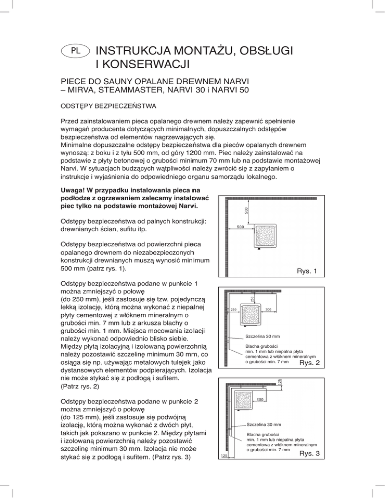 PL INSTRUKCJA MONTAŻU, OBSŁUGI I KONSERWACJI PIECE DO SAUNY OPALANE DREWNEM NARVI – MIRVA, STEAMMASTER, NARVI 30 i NARVI 50 ODSTĘPY BEZPIECZEŃSTWA Przed zainstalowaniem pieca opalanego drewnem należy zapewnić spełnienie wymagań producenta dotyczących minimalnych, dopuszczalnych odstępów bezpieczeństwa od elementów nagrzewających się. Minimalne dopuszczalne odstępy bezpieczeństwa dla pieców opalanych drewnem wynoszą: z boku i z tyłu 500 mm, od góry 1200 mm. Piec należy zainstalować na podstawie z płyty betonowej o grubości minimum 70 mm lub na podstawie montażowej Narvi. W sytuacjach budzących wątpliwości należy zwrócić się z zapytaniem o instrukcje i wyjaśnienia do odpowiedniego organu samorządu lokalnego. Uwaga! W przypadku instalowania pieca na podłodze z ogrzewaniem zalecamy instalować piec tylko na podstawie montażowej Narvi. Odstępy bezpieczeństwa od palnych konstrukcji: drewnianych ścian, sufitu itp. Odstępy bezpieczeństwa od powierzchni pieca opalanego drewnem do niezabezpieczonych konstrukcji drewnianych muszą wynosić minimum 500 mm (patrz rys. 1). Odstępy bezpieczeństwa podane w punkcie 1 można zmniejszyć o połowę (do 250 mm), jeśli zastosuje się tzw. pojedynczą lekką izolację, którą można wykonać z niepalnej płyty cementowej z włóknem mineralnym o grubości min. 7 mm lub z arkusza blachy o grubości min. 1 mm. Miejsca mocowania izolacji należy wykonać odpowiednio blisko siebie. Między płytą izolacyjną i izolowaną powierzchnią należy pozostawić szczelinę minimum 30 mm, co osiąga się np. używając metalowych tulejek jako dystansowych elementów podpierających. Izolacja nie może stykać się z podłogą i sufitem. (Patrz rys. 2) Odstępy bezpieczeństwa podane w punkcie 2 można zmniejszyć o połowę (do 125 mm), jeśli zastosuje się podwójną izolację, którą można wykonać z dwóch płyt, takich jak pokazano w punkcie 2. Między płytami i izolowaną powierzchnią należy pozostawić szczelinę minimum 30 mm. Izolacja nie może stykać się z podłogą i sufitem. (Patrz rys. 3) Rys. 1 Szczelina 30 mm Blacha grubości min. 1 mm lub niepalna płyta cementowa z włóknem mineralnym o grubości min. 7 mm Rys. 2 Szczelina 30 mm Blacha grubości min. 1 mm lub niepalna płyta cementowa z włóknem mineralnym o grubości min. 7 mm Rys. 3 4. Jeśli ściana wyłożona jest cegłą, między pionową powierzchnią pieca i ścianą wystarczy odstęp 50 mm. (Patrz rys. 4) Odstęp A do ściany drewnianej określa się w zależności od zastosowanej izolacji - bez izolacji 500 mm - izolacja pojedyncza lekka 250 mm - izolacja podwójna 125 mm Rys. 4 5. Oblicowanie z cegły grubości 55 mm z odkrytymi brzegami i odsunięte na min. 30 mm od izolowanej powierzchni odpowiada pojedynczej lekkiej izolacji. Podwójnej, lekkiej izolacji odpowiada oblicowanie z cegły grubości 110 mm Rys. 5 Izolacja sufitu: Sufit nie wymaga izolowania, gdy odległość od górnej powierzchni pieca do sufitu wynosi minimum 1200 mm. Jeśli odległość ta jest mniejsza niż 1200 mm, to rodzaj izolacji wybiera się zgodnie z punktami 1-3 i rysunkiem 6. X mm Sufitu nie trzeba izolować 1200 Pojedyncza lekka izolacja 900 Rys. 6 Izolacja podłogi przed piecem: Podłoga przed piecem, wykonana z materiału palnego musi być odizolowana blachą metalową, której krawędzie z lewej i prawej strony muszą wychodzić na odległość min. 100 mm poza krawędzie paleniska i na 400 mm do przodu od przedniej części pieca (patrz rys. 7). Rys. 7 INSTALOWANIE PIECA We wszystkich modelach naszych pieców opalanych drewnem znajdują się dwa otwory do podłączenia ich do komina: od góry pieca i z tyłu. Niewykorzystany otwór podłączenia do komina zamyka się zaślepką, która wchodzi w skład dostarczanego zestawu. W skład zestawu wchodzi również rura łącząca 160 mm do podłączenia do komina od tyłu pieca. Rys. 8 W przypadku podłączenia do komina od góry pieca należy zastosować odpowiednią rurę do pieców lub rurę firmy NARVI. Rury nie należy wstawiać zbyt głęboko w komin, aby nie ograniczać ciągu komina. Otwór w kominie, w który wpuszcza się rurę, należy uszczelnić, na przykład niepalną wełną mineralną. Podczas montażu pieca upewnić się, że piec stoi pewnie na podstawie oraz że zachowane są wszystkie odstępy bezpieczeństwa, podane w instrukcji instalowania. INSTALOWANIE PIECA Z DŁUGIM PALENISKIEM Ściana parni za piecem danego modelu musi być wykonana z niepalnego materiału, na przykład z cegły. Otwór w ścianie ceglanej dla długiego paleniska musi mieć wymiary pokazane poniżej. Wymiar A dobiera się zgodnie z zaleceniami wyboru odstępów bezpieczeństwa od konstrukcji drewnianych. -Bez zastosowania izolacji konstrukcji drewnianych – 500 mm -Z zastosowaniem lekkiej pojedynczej izolacji – 250 mm -Z zastosowaniem podwójnej izolacji – 125 mm Odstęp od podłogi: Typ pieca Wysokość mm MIRVA z długim paleniskiem 430 LÖYLYMESTARI z długim paleniskiem 470 NARVI 30 z długim paleniskiem 590 NARVI 50 z długim paleniskiem Rys. 9 Szerokość mm 270 300 390 Szczelinę między ściankami otworu w ścianie ceglanej i ściankami paleniska długiego zalecamy uszczelnić wełną mineralną w celu umożliwienia rozszerzania się paleniska podczas jego nagrzewania się. Przed zamontowaniem pieca upewnić się, że spełnione są wymagania producenta dotyczące minimalnych odstępów bezpieczeństwa od konstrukcji palnych, podanych powyżej. Piec z długim paleniskiem podłącza się do komina od góry. Należy zastosować odpowiednią rurę do pieców lub rurę firmy NARVI. Podłoga przed drzwiczkami paleniska, wykonana z materiału palnego, musi być odizolowana blachą metalową, której krawędzie z lewej i prawej strony muszą wychodzić na odległość min. 100 mm poza krawędzie paleniska i na 400 mm do przodu od drzwiczek. WSTĘPNE PRZEPALANIE PIECA Aby usunąć powłoki zabezpieczające, piec 