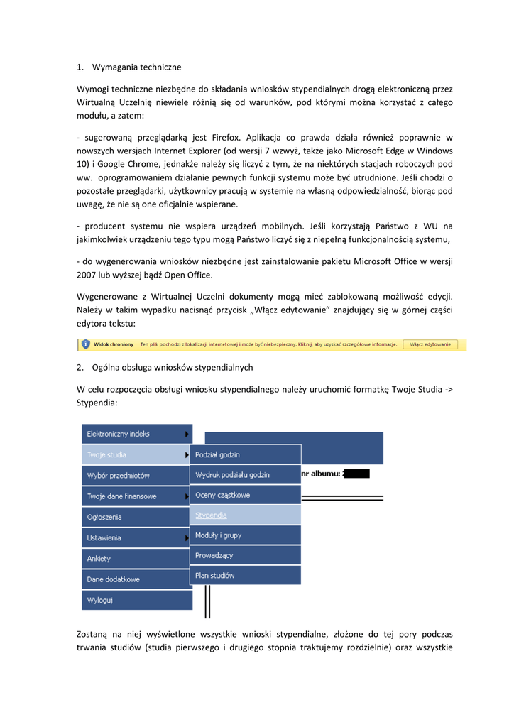 1. Wymagania techniczne Wymogi techniczne niezbędne do składania wniosków stypendialnych drogą elektroniczną przez Wirtualną Uczelnię niewiele różnią się od warunków, pod którymi można korzystać z całego modułu, a zatem: - sugerowaną przeglądarką jest Firefox. Aplikacja co prawda działa również poprawnie w nowszych wersjach Internet Explorer (od wersji 7 wzwyż, także jako Microsoft Edge w Windows 10) i Google Chrome, jednakże należy się liczyć z tym, że na niektórych stacjach roboczych pod ww. oprogramowaniem działanie pewnych funkcji systemu może być utrudnione. Jeśli chodzi o pozostałe przeglądarki, użytkownicy pracują w systemie na własną odpowiedzialność, biorąc pod uwagę, że nie są one oficjalnie wspierane. - producent systemu nie wspiera urządzeń mobilnych. Jeśli korzystają Państwo z WU na jakimkolwiek urządzeniu tego typu mogą Państwo liczyć się z niepełną funkcjonalnością systemu, - do wygenerowania wniosków niezbędne jest zainstalowanie pakietu Microsoft Office w wersji 2007 lub wyższej bądź Open Office. Wygenerowane z Wirtualnej Uczelni dokumenty mogą mieć zablokowaną możliwość edycji. Należy w takim wypadku nacisnąć przycisk „Włącz edytowanie” znajdujący się w górnej części edytora tekstu: 2. Ogólna obsługa wniosków stypendialnych W celu rozpoczęcia obsługi wniosku stypendialnego należy uruchomić formatkę Twoje Studia -> Stypendia: Zostaną na niej wyświetlone wszystkie wnioski stypendialne, złożone do tej pory podczas trwania studiów (studia pierwszego i drugiego stopnia traktujemy rozdzielnie) oraz wszystkie przyznane na ich podstawie stypendia. W przypadku wniosków stypendialnych ważny jest status wniosku. Jeśli zostanie mu w systemie obsługi Dziekanatu (Student nie ma do niego wejścia) nadany status „przyjęty”, „odrzucony” bądź „zatwierdzony” Student nie ma już możliwości dalszej jego edycji, może go tylko ponownie wydrukować. Aby złożyć nowy wniosek należy nacisnąć przycisk „Dodaj wniosek”. Pojawi się menu wyboru, w którym należy określić następujące wartości: - na jaki okres jest składany wniosek (rok akademicki/semestr zimowy/semestr letni), - na jaki rok akademicki jest składany wniosek, - jakiego rodzaju stypendium dotyczy. Aby przejść do dalszej części obsługi należy zaakceptować zamieszczone na formatce oświadczenie. Ostatecznym efektem będzie wygenerowanie dokumentu, który po wydrukowaniu i podpisaniu w wyznaczonych do tego miejscach należy przedłożyć we własnym dziekanacie. Cześć danych osobowych zaciąga się do dokumentu bezpośrednio z bazy danych, część należy uzupełnić bądź to na dokumencie w formie elektronicznej, bądź to już na wydrukowanym dokumencie w formie papierowej. Edycja wniosków stypendialnych jest możliwa, o ile w dziekanacie nie został mu już nadany jeden ze statusów – „przyjęty”, „odrzucony” lub „zatwierdzony”. W takim wypadku możliwe jest tylko ponowne wydrukowanie wniosku, bez możliwości jego edytowania w systemie. Poniżej opisane są szczegóły dotyczące poszczególnych typów stypendiów. 3. Stypendium socjalne Aby złożyć wniosek o stypendium socjalne należy wykonać następujące czynności: - określić swój status finansowy - czy jest się samodzielnym finansowo (jeśli tak, to należy udokumentować dochody nie mniejsze niż 923,45zł do października 2016 roku, a od listopada 2016 roku nie mniejsze niż 930,35zł), bądź czy prowadzi się gospodarstwo domowe wspólnie z rodzicami. - zaznaczyć ubieganie się o zwiększenie stypendium z tytułu zamieszkania (dotyczy tylko studentów stale zamieszkałych poza Krakowem). Następnie w celu ustalenia wysokości dochodu na osobę w rodzinie studenta należy użyć funkcji "Kalkulator". Po jej uruchomieniu wyświetli się formatka z danymi studenta - tu należy uzupełnić osiągnięte w 2015 roku dochody. W kolejnym kroku wpisać należy wszystkich członków rodziny i podać ich dochody uzyskane w 2015 roku (na podstawie posiadanych zaświadczeń i oświadczeń o dochodach). Przy ustalaniu wysokości dochodu uprawniającego studenta do ubiegania się o stypendium socjalne uwzględnia się osoby oraz dochody osiągane przez: 1) 2) 3) studenta; małżonka studenta, a także będące na utrzymaniu studenta lub jego małżonka dzieci niepełnoletnie, dzieci pobierające naukę do 26 roku życia, a jeżeli 26 rok życia przypada w ostatnim roku studiów, do ich ukończenia, oraz dzieci niepełnosprawne bez względu na wiek, rodziców, opiekunów prawnych, opiekunów faktycznych studenta będące na ich utrzymaniu dzieci niepełnoletnie, dzieci pobierające naukę do 26 roku życia, a jeżeli 26 rok życia przypada w ostatnim roku studiów – do ich ukończenia oraz dzieci niepełnosprawne bez względu na wiek. Po dodaniu każdego członka rodziny system automatycznie wylicza miesięczny dochód na osobę w rodzinie. Na podstawie wyliczonego miesięcznego dochodu, po spełnieniu wszystkich wymogów formalnych, będzie ustalona wysokość stypendium socjalnego. Należy pamiętać o dokładnym wypełnieniu danych osobowych (imię, nazwisko, rok urodzenia) oraz wpisaniu roku podatkowego, za który podawany jest dochód. W celu usunięcia osoby wpisanej nadmiarowo (np. rodzeństwa starszego niż 18 lat, które nie uczy się) należy użyć funkcji „usuń wpis:” W razie potrzeby aktualizacji dochodów danego członka rodziny należy przy edycji wniosku wypełnić pole „Powód aktualizacji dochodu”. W pola „Dochód utracony/uzyskany” należy wpisać dochody miesięczne. Zaznaczenie pola „zwiększenie stypendium socjalnego z tytułu zamieszkania” powoduje utworzenie dodatkowego wniosku stypendialnego: Jest to pozycja umożliwiająca Dziekanatom przyznanie dodatkowych rat z tego tytułu i nie wymaga drukowania odrębnego wniosku. Cała niezbędna informacja znajduje się na pierwszej stron