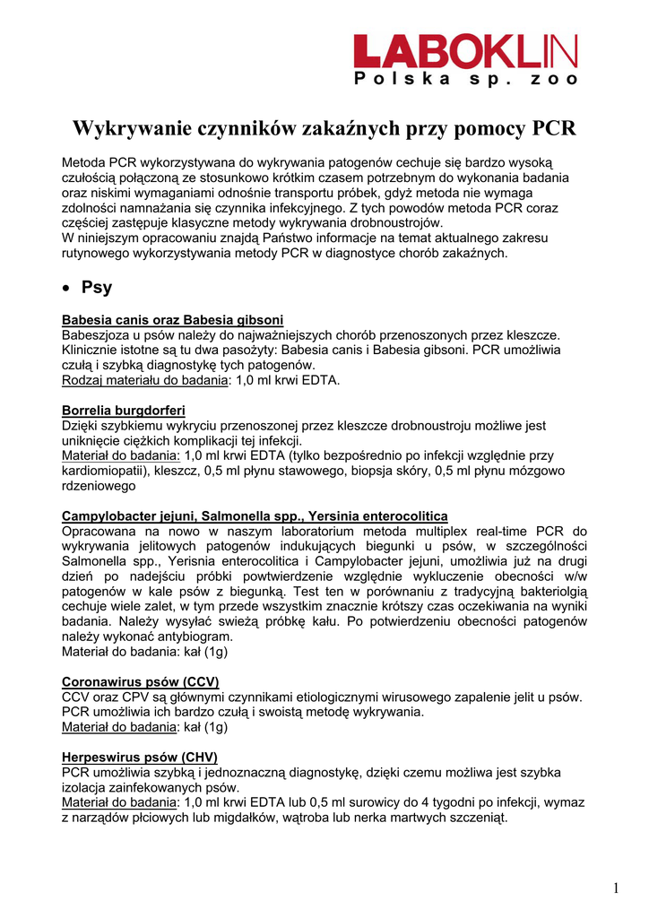 Wykrywanie czynników zakaźnych przy pomocy PCR Metoda PCR wykorzystywana do wykrywania patogenów cechuje się bardzo wysoką czułością połączoną ze stosunkowo krótkim czasem potrzebnym do wykonania badania oraz niskimi wymaganiami odnośnie transportu próbek, gdyż metoda nie wymaga zdolności namnażania się czynnika infekcyjnego. Z tych powodów metoda PCR coraz częściej zastępuje klasyczne metody wykrywania drobnoustrojów. W niniejszym opracowaniu znajdą Państwo informacje na temat aktualnego zakresu rutynowego wykorzystywania metody PCR w diagnostyce chorób zakaźnych. • Psy Babesia canis oraz Babesia gibsoni Babeszjoza u psów należy do najważniejszych chorób przenoszonych przez kleszcze. Klinicznie istotne są tu dwa pasożyty: Babesia canis i Babesia gibsoni. PCR umożliwia czułą i szybką diagnostykę tych patogenów. Rodzaj materiału do badania: 1,0 ml krwi EDTA. Borrelia burgdorferi Dzięki szybkiemu wykryciu przenoszonej przez kleszcze drobnoustroju możliwe jest uniknięcie ciężkich komplikacji tej infekcji. Materiał do badania: 1,0 ml krwi EDTA (tylko bezpośrednio po infekcji względnie przy kardiomiopatii), kleszcz, 0,5 ml płynu stawowego, biopsja skóry, 0,5 ml płynu mózgowo rdzeniowego Campylobacter jejuni, Salmonella spp., Yersinia enterocolitica Opracowana na nowo w naszym laboratorium metoda multiplex real-time PCR do wykrywania jelitowych patogenów indukujących biegunki u psów, w szczególności Salmonella spp., Yerisnia enterocolitica i Campylobacter jejuni, umożliwia już na drugi dzień po nadejściu próbki powtwierdzenie względnie wykluczenie obecności w/w patogenów w kale psów z biegunką. Test ten w porównaniu z tradycyjną bakteriolgią cechuje wiele zalet, w tym przede wszystkim znacznie krótszy czas oczekiwania na wyniki badania. Należy wysyłać swieżą próbkę kału. Po potwierdzeniu obecności patogenów należy wykonać antybiogram. Materiał do badania: kał (1g) Coronawirus psów (CCV) CCV oraz CPV są głównymi czynnikami etiologicznymi wirusowego zapalenie jelit u psów. PCR umożliwia ich bardzo czułą i swoistą metodę wykrywania. Materiał do badania: kał (1g) Herpeswirus psów (CHV) PCR umożliwia szybką i jednoznaczną diagnostykę, dzięki czemu możliwa jest szybka izolacja zainfekowanych psów. Materiał do badania: 1,0 ml krwi EDTA lub 0,5 ml surowicy do 4 tygodni po infekcji, wymaz z narządów płciowych lub migdałków, wątroba lub nerka martwych szczeniąt. 1 Parvowirus psów (CPV) CPV należy do najważniejszych patogenów odpowiedzialnych za wirusowe zapalenie jelit psów. Zakażenie prowadzi do biegunek, a sam wirus bardzo szybko przenoszony jest na inne psy. PCR umożliwia swoistą i czułą metodę wykrywania wirusa. Materiał do badania: 1,0 ml krwi EDTA z fazy wiremicznej (1-5 dzień), kał. Ehrlichia canis / Ehrlichia phagozytophila Infekcje wywołane przez Ehrlichia spp. notowane są na całym świecie. Drobnoustroje te należą do riketsji i są przenoszone przez kleszcze. W zależności od regionu gatunki kleszczy są różne a wraz z tym rodzaj ehrlichiozy. Zakażenie Ehrlichia canis jest klasycznym przykładem chorób podróżniczych, które pojawia się jako najczęstsze przy sprowadzeniu zwierzęcia z zagranicy. Wykrywanie przy pomocy PCR obejmuje oba typy, różnicowanie następuje w przypadku pozytywnego wyniku. Materiał do badania: 1,0 ml krwi EDTA, punktat szpiku kostnego, kleszcze. Haemobartonella canis Również u psów możliwe jest wykorzystanie metody PCR do czułego i swoistego wykrywania tego patogenu. Materiał do badania: 1,0 ml krwi EDTA. Leptospira spp. Leptospiroza jest szeroko rozpowszechnioną bakteryjną chorobą zakaźną. Oprócz ostrej i podostrej postaci notuje się często również postać przewlekłą, która zazwyczaj przebiega bezobjawowo. Ponieważ leptospiry są dość wrażliwe metoda PCR bardzo dobrze nadaje się do ich diagnostyki. PCR umożliwia szybką, czułą i swoistą diagnostykę siedmiu patogennych serowarów. Materiał do badania: nerka (0,2 g), mocz (ok. 5 ml). Leishmania spp. Wykrywanie pierwotniaków z rodzaju Leishmania z punktatu szpiku kostnego lub węzłów chłonnych jest obecnie jedynym sensownym rodzajem kontroli terapii. Materiał do badania: punktat szpiku kostnego lub węzłów chłonnych, biopsja skóry, wymaz spojówkowy. Krew nie nadaje się do badania. Neospora caninum Wydalanie N. caninum w kale psa można bardzo czule i swoiście potwierdzić przy pomocy PCR. Materiał do badania: kał (1g) Wirus nosówki Wykrywanie wirusa przy pomocy PCR umożliwia postawienie jednoznacznej diagnozy jeszcze przed serokonwersją. Materiał do badania: 1,0 ml krwi EDTA, 0,5 ml surowicy do 4 tygodni po infekcji, wymaz (oko, gardło, nos), 0,5 ml płynu mózgowo rdzeniowego w nerwowej postaci nosówki. Wirus szczepionkowy może być wykrywany we krwi przez 2 – 3 tygodnie od szczepienia. Koszt badania PCR: Koszt badania multiplex PCR u psów: € 23,00 (netto) € 38,- (netto) Czas potrzebny do wykonania badania – 2 dni. 2 • Konie Borrelia burgdorferi Również u koni możliwe jest wykrywanie borelii przy pomocy PCR. Materiał do badania: 1,0 ml krwi EDTA (tylko bezpośrednio po infekcji), kleszcze, 0,5 ml płynu stawowego, 0,5 ml płynu mózgowo rdzeniowego, biopsja skóry. EHV 1 + 4 Jeśli występują ronienia lub schorzenia układu oddechowego, można przy pomocy PCR jednoznacznie określić rolę herpeswirusów w tych procesach. Bezpośrednio po szczepieniu z krwi izolowany jest również wirus szczepionkowy. Materiał do badania: 0,5 ml krwi EDTA, wymaz z nosa lub dróg rodnych, poroniony płód. Koszt badania PCR: € 23,00 (netto) Czas potrzebny do wykonania badania – 2 dni • Koty Babesia spp. B. canis i B. gibsoni mogą również zarażać koty. Przy pomocy PCR możliwe jest ich czułe i swoiste wykrywanie. Materiał do badania: 1,0 ml krwi EDTA. Bartonella henselae Bartonella henselae jest najważniejszym czynni