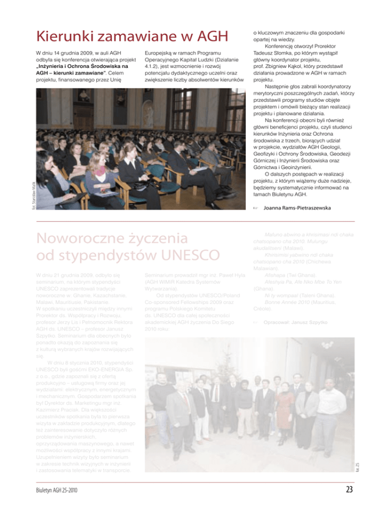 Kierunki zamawiane w AGH Europejską w ramach Programu Operacyjnego Kapitał Ludzki (Działanie 4.1.2), jest wzmocnienie i rozwój potencjału dydaktycznego uczelni oraz zwiększenie liczby absolwentów kierunków fot. Stanisław Malik W dniu 14 grudnia 2009, w auli AGH odbyła się konferencja otwierająca projekt „Inżynieria i Ochrona Środowiska na AGH – kierunki zamawiane”. Celem projektu, finansowanego przez Unię o kluczowym znaczeniu dla gospodarki opartej na wiedzy. Konferencję otworzył Prorektor Tadeusz Słomka, po którym wystąpił główny koordynator projektu, prof. Zbigniew Kąkol, który przedstawił działania prowadzone w AGH w ramach projektu. Następnie głos zabrali koordynatorzy merytoryczni poszczególnych zadań, którzy przedstawili programy studiów objęte projektem i omówili bieżący stan realizacji projektu i planowane działania. Na konferencji obecni byli również główni beneficjenci projektu, czyli studenci kierunków Inżynieria oraz Ochrona środowiska z trzech, biorących udział w projekcie, wydziałów AGH Geologii, Geofizyki i Ochrony Środowiska, Geodezji Górniczej i Inżynierii Środowiska oraz Górnictwa i Geoinżynierii. O dalszych postępach w realizacji projektu, z którym wiążemy duże nadzieje, będziemy systematycznie informować na łamach Biuletynu AGH. Joanna Rams-Pietraszewska W dniu 21 grudnia 2009, odbyło się seminarium, na którym stypendyści UNESCO zaprezentowali tradycje noworoczne w: Ghanie, Kazachstanie, Malawi, Mauritiusie, Pakistanie. W spotkaniu uczestniczyli między innymi Prorektor ds. Współpracy i Rozwoju, profesor Jerzy Lis i Pełnomocnik Rektora AGH ds. UNESCO – profesor Janusz Szpytko. Seminarium dla obecnych było ponadto okazją do zapoznania się z kulturą wybranych krajów rozwijających się. W dniu 8 stycznia 2010, stypendyści UNESCO byli gośćmi EKO-ENERGIA Sp. z o.o., gdzie zapoznali się z ofertą produkcyjno – usługową firmy oraz jej wydziałami: elektrycznym, energetycznym i mechanicznym. Gospodarzem spotkania był Dyrektor ds. Marketingu mgr inż. Kazimierz Praciak. Dla większości uczestników spotkania była to pierwsza wizyta w zakładzie produkcyjnym, dlatego też zainteresowanie dotyczyło różnych problemów inżynierskich, oprzyrządowania maszynowego, a nawet możliwości współpracy z innymi krajami. Uzupełnieniem wizyty było seminarium w zakresie technik wizyjnych w inżynierii i zastosowania telematyki w transporcie. Biuletyn AGH 25-2010 Seminarium prowadził mgr inż. Paweł Hyla (AGH WIMiR Katedra Systemów Wytwarzania). Od stypendystów UNESCO/Poland Co-sponsored Fellowships 2009 oraz programu Polskiego Komitetu ds. UNESCO dla całej społeczności akademickiej AGH życzenia Do Siego 2010 roku: Mafuno abwino a khrisimasi ndi chaka chatsopano cha 2010. Mulungu akudalitseni (Malawi). Khirisimisi yabwino ndi chaka chatsopano cha 2010 (Chichewa Malawian). Afishapa (Twi Ghana). Afeshyia Pa, Afe Nko Mbe To Yen (Ghana). Ni ty wompaal (Taleni Ghana). Bonne Année 2010 (Mauritius, Créole). Opracował: Janusz Szpytko fot. ZS Noworoczne życzenia od stypendystów UNESCO 23