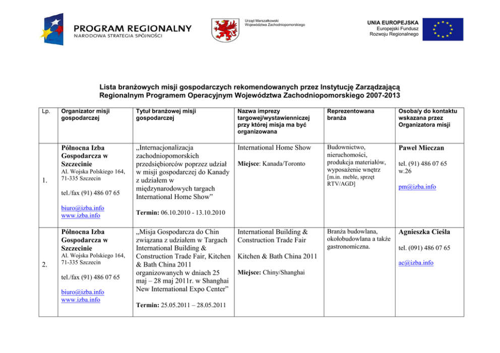 Urząd Marszałkowski Województwa Zachodniopomorskiego UNIA EUROPEJSKA Europejski Fundusz Rozwoju Regionalnego Lista branŜowych misji gospodarczych rekomendowanych przez Instytucję Zarządzającą Regionalnym Programem Operacyjnym Województwa Zachodniopomorskiego 2007-2013 Lp. 1. Organizator misji gospodarczej Tytuł branŜowej misji gospodarczej Nazwa imprezy targowej/wystawienniczej przy której misja ma być organizowana Reprezentowana branŜa Osoba/y do kontaktu wskazana przez Organizatora misji Północna Izba Gospodarcza w Szczecinie „Internacjonalizacja zachodniopomorskich przedsiębiorców poprzez udział w misji gospodarczej do Kanady z udziałem w międzynarodowych targach International Home Show” International Home Show Budownictwo, nieruchomości, produkcja materiałów, wyposaŜenie wnętrz Paweł Mieczan Al. Wojska Polskiego 164, 71-335 Szczecin tel./fax (91) 486 07 65 [email protected] www.izba.info Północna Izba Gospodarcza w Szczecinie 2. Al. Wojska Polskiego 164, 71-335 Szczecin tel./fax (91) 486 07 65 [email protected] www.izba.info Miejsce: Kanada/Toronto [m.in. meble, sprzęt RTV/AGD] tel. (91) 486 07 65 w.26 [email protected] Termin: 06.10.2010 - 13.10.2010 „Misja Gospodarcza do Chin związana z udziałem w Targach International Building & Construction Trade Fair, Kitchen & Bath China 2011 organizowanych w dniach 25 maj – 28 maj 2011r. w Shanghai New International Expo Center” Termin: 25.05.2011 – 28.05.2011 International Building & Construction Trade Fair BranŜa budowlana, okołobudowlana a takŜe gastronomiczna. Agnieszka Cieśla tel. (091) 486 07 65 Kitchen & Bath China 2011 [email protected] Miejsce: Chiny/Shanghai Zachodniopomorska Okręgowa Izba InŜynierów Budownictwa 3. ul. Energetyków 9 70-656 Szczecin „Misja gospodarcza do Chin połączona z wizytacją targów budowlanych IBCTF Szanghaj 2011” International Building&Construction Trade Fair Miejsce: Chiny/Shanghai Termin: 25.05.2011 – 28.05.2011 tel/fax (91) 489 84 10 [email protected] www.zap.home.pl Stan aktualny na dzień: 28.02.2011r. BranŜa budowlana i pochodne z nią związane (np.; technologie budowlane, maszyny budowlane, wyposaŜenie wnętrz) Marek Kudyba tel. (91) 489 84 10 [email protected]