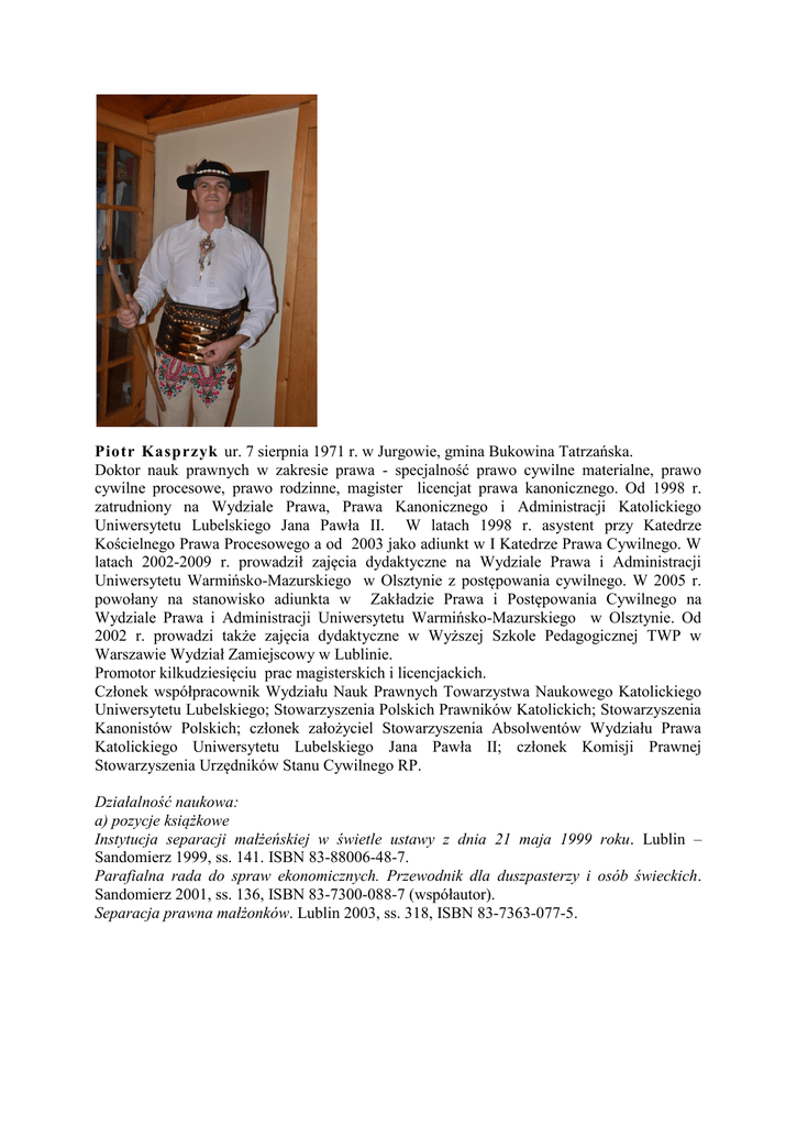 Piotr Kasprzyk ur. 7 sierpnia 1971 r. w Jurgowie, gmina Bukowina Tatrzańska. Doktor nauk prawnych w zakresie prawa - specjalność prawo cywilne materialne, prawo cywilne procesowe, prawo rodzinne, magister licencjat prawa kanonicznego. Od 1998 r. zatrudniony na Wydziale Prawa, Prawa Kanonicznego i Administracji Katolickiego Uniwersytetu Lubelskiego Jana Pawła II. W latach 1998 r. asystent przy Katedrze Kościelnego Prawa Procesowego a od 2003 jako adiunkt w I Katedrze Prawa Cywilnego. W latach 2002-2009 r. prowadził zajęcia dydaktyczne na Wydziale Prawa i Administracji Uniwersytetu Warmińsko-Mazurskiego w Olsztynie z postępowania cywilnego. W 2005 r. powołany na stanowisko adiunkta w Zakładzie Prawa i Postępowania Cywilnego na Wydziale Prawa i Administracji Uniwersytetu Warmińsko-Mazurskiego w Olsztynie. Od 2002 r. prowadzi także zajęcia dydaktyczne w Wyższej Szkole Pedagogicznej TWP w Warszawie Wydział Zamiejscowy w Lublinie. Promotor kilkudziesięciu prac magisterskich i licencjackich. Członek współpracownik Wydziału Nauk Prawnych Towarzystwa Naukowego Katolickiego Uniwersytetu Lubelskiego; Stowarzyszenia Polskich Prawników Katolickich; Stowarzyszenia Kanonistów Polskich; członek założyciel Stowarzyszenia Absolwentów Wydziału Prawa Katolickiego Uniwersytetu Lubelskiego Jana Pawła II; członek Komisji Prawnej Stowarzyszenia Urzędników Stanu Cywilnego RP. Działalność naukowa: a) pozycje książkowe Instytucja separacji małżeńskiej w świetle ustawy z dnia 21 maja 1999 roku. Lublin – Sandomierz 1999, ss. 141. ISBN 83-88006-48-7. Parafialna rada do spraw ekonomicznych. Przewodnik dla duszpasterzy i osób świeckich. Sandomierz 2001, ss. 136, ISBN 83-7300-088-7 (współautor). Separacja prawna małżonków. Lublin 2003, ss. 318, ISBN 83-7363-077-5. Polska Bibliografia Prawa Kanonicznego za lata 1980 – 1982, Prawo Administracja Kościół 2001, nr 4(8), s. 277 – 302. ISBN 83-7363-010-4. Polska bibliografia Prawa Kanonicznego za lata 1980 – 2000 „Prawo Administracja Kościół” ( wydanie specjalne), Lublin 2003 ss. 294. (z płytą CD). ISSN 1644-9924. Kościelne Prawo Procesowe. Materiały i Studia. T. 1. Lublin 1999, ss. 281, ISBN 83-8686295-5(współredakcja) Prawo rodzinne w Polsce i w Europie. Zagadnienia wybrane, Lublin 2005, ss. 577, ISBN 837306-237-8. (redakcja). Z zagadnień prawa rodzinnego i rejestracji stanu cywilnego, Lublin 2007, ss. 332, ISBN 97883-7363-497-8 (współredakcja). Актуальні питання з галузі сімейного законодавства та реєстрації актів цивільного стану, Lublin 2007, ss. 150, ISBN 978-83-7363-498-5(redakcja). Selected Problems in the Area of Family Law and Civil Status Registration, Lublin 2007, ss. 138, ISBN 978-83-7363-499-2 (redakcja). Prawo rodzinne w dobie przemian, Lublin 2009, ss. 412, ISBN 978-83-7306-453-9, ISBN 978-83-7363-882-2 (współredakcja). b) artykuły: Kasprzyk P.: Separacja prawna w świetle znowelizowanego kodeksu rodzinnego i opiekuńczego, Roczniki Nauk Prawnych 2000, T. X, z. 1, s. 209–230. ISSN 1507-7896. Kasprzyk P.: Trudności kodyfikacyjne związane z wprowadzeniem instytucja separacji małżeńskiej do prawa polskiego. Studia z Prawa Wyznaniowego2000, t. 2, s. 27 – 56. ISBN 83-7300-056-9. Kasprzyk P.: Sprawy o separację małżeńską na przykładzie Sądu Okręgowego w Lublinie. Studia z Prawa Wyznaniowego2001, t. 3, s. 115–126. ISBN 83-7300-113-1. Kasprzyk P.: Terminy prekluzyjne na gruncie kodeksu rodzinnego i opiekuńczego. Studia z Prawa Wyznaniowego2002, t. 4, s. 191 – 204. ISBN 83-7300-129-8. Kasprzyk P.: Udział biegłego w sprawach rodzinnych. [w:] Rola biegłego we współczesnym procesie cywilnym, pod red. J. Turka, Warszawa 2002, s. 65–86. ISBN 83-87218-03-0 Kasprzyk P.: Instytucja apelacji w kanonicznym postępowaniu sądowym o nieważność małżeństwa. Roczniki Nauk Prawnych 2003, T. XIII z. 2, s. 161-183, ss. 22. ISSN 1507-7896 Kasprzyk P.: Separacja małżonków – instytucja funkcjonująca w polskim prawie rodzinnym i prawie kanonicznym, Ius Matrimoniale 2003, nr 8 (14), s. 87–118. ISSN 1429-3803 Kasprzyk P.: (współautor) H. Cioch. Wpływ poglądów Profesora Adama Strzembosza na obecny kształt polskiego prawa rodzinnego. W: Ius et lex. Księga jubileuszowa ku czci Profesora Adama Strzembosza. Pod red. A. Dębińskiego, A. Grześkowiak, K. Wiaka. Lublin 2002 s. 209 – 225. (druga część artykułu). Kasprzyk P.: Dariusz wydarzeń na wydziale [w:] „Prawo Administracja Kościół” 2002, nr 1 (9) s. 297–303, ss. 6. Kasprzyk P.: Separacja - rozwój instytucji w prawie polskim [w:] Kościelne Prawo Procesowe. Materiały i Studia, T. 3, red. A. Dzięga, M. Wróbel, Lublin 2003, s. 25-47, ss. 22. ISBN 83-7300-271-5. Kasprzyk P.: Unieważnienie małżeństwa w polskim prawie rodzinnym a stwierdzenie nieważności małżeństwa w prawie kanonicznym,[w:] Iustitia Civitatis Fundamentum, Księga pamiątkowa ku czci Profesora Wiesława Chrzanowskiego, red. H. Cioch, A. Dębiński, J. Chaciński, Lublin 2003, s. 530-555, ss. 24. ISBN 83-7306-139-8 Kasprzyk P.: Nieprawidłowości dotyczące zawieranych małżeństw „konkordatowych” w urzędach stanu cywilnego w Polsce, [w:] Prawo rodzinne w Polsce i w Europie. Zagadnienia wybrane, pod red. P. Kasprzyka, Lublin 2005, s. 141-156, ss. 16. ISBN 83-7306-237-8 Kasprzyk P.: Wprowadzenie, [w:] Prawo rodzinne w Polsce i w Europie. Zagadnienia wybrane, red. P. Kasprzyk, Lublin 2005, s. 5-8, ss. 4. Kasprzyk P.: Stosunki majątkowe między małżonkami a prowadzenie działalności gospodarczej przez małżonków - zagadnienia wybrane, [w:] Przedsiębiorczość a współczesne wyzwania cywilizacyjne, red. Z. Zioło, T. Rachwał, Kraków 2005 , s. 83-93, ss. 11. ISBN 83915753-6-5. 15. Kasprzyk P.: Zmiana imienia i nazwiska w prawie polskim (wstęp do problematyki) [w:] Studia Prawnoustrojowe, Olsztyn 2006, nr 6, s. 45–92, ss. 48. ISSN 1644-0412. 1