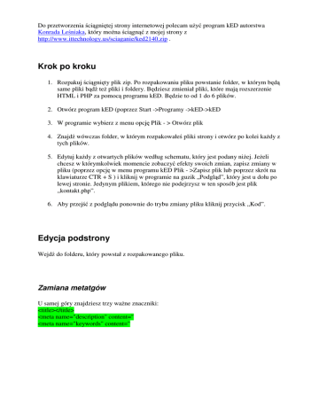 Do przetworzenia ściągniętej strony internetowej polecam użyć program kED autorstwa Konrada Leśniaka, który można ściągnąć z mojej strony z http://www.ittechnology.us/sciaganie/ked2140.zip . Krok po kroku 1. Rozpakuj ściągnięty plik zip. Po rozpakowaniu pliku powstanie folder, w którym będą same pliki bądź też pliki i foldery. Będziesz zmieniał pliki, które mają rozszerzenie HTML i PHP za pomocą programu kED. Będzie to od 1 do 6 plików. 2. Otwórz program kED (poprzez Start ->Programy ->kED->kED 3. W programie wybierz z menu opcję Plik - > Otwórz plik 4. Znajdź wówczas folder, w którym rozpakowałeś pliki strony i otwórz po kolei każdy z tych plików. 5. Edytuj każdy z otwartych plików według schematu, który jest podany niżej. Jeżeli chcesz w którymkolwiek momencie zobaczyć efekty swoich zmian, zapisz zmiany w pliku (poprzez opcję w menu programu kED Plik - >Zapisz plik lub poprzez skrót na klawiaturze CTR + S ) i kliknij w programie na guzik „Podgląd”, który jest u dołu po lewej stronie. Jedynym plikiem, którego nie podejrzysz w ten sposób jest plik „kontakt.php”. 6. Aby przejść z podglądu ponownie do trybu zmiany pliku kliknij przycisk „Kod”. Edycja podstrony Wejdź do folderu, który powstał z rozpakowanego pliku. Zamiana metatgów U samej góry znajdziesz trzy ważne znaczniki: <title></title> <meta name="description" content=" <meta name="keywords" content=" <title></title> - jest to tytuł każdej podstrony. Tytuł podstrony powinien odzwierciedlać treść tej podstrony. Tytuł powinien być krótki, jego długość nie powinna przekraczać 75 znaków, najlepiej jednak do 60 znaków (licząc w tym spacje, czyli jego optymalna długość to 5 - 7 wyrazów). <meta name="description" content=" – jest to opis każdej podstrony. W tym znaczniku tworzysz krótkie streszczenie treści podstrony <meta name="keywords" content=" – tutaj wstawiasz najważniejsze dla Ciebie słowa kluczowe, które występują na podstronie Aby zrozumieć dokładnie przeznaczenie tych trzech znaczników przeczytaj mój kurs Uzupełnij wszystkie trzy znaczniki. Pamiętaj, że one nie mogą być takie same dla każdej podstrony. Przykład: przykładowe metatgi dla podstrony „Nasze usługi” strony salonu fryzjerskiego „Salon Fryzjerki Ewa Jars”. <title>Usługi fryzjerskie w Pruszkowie – ondulacje, trwałe, fryzury ślubne i komunijne</title> <meta name="description" content="Zakład fryzjerski Salon Fryzjerki Ewa Jars oferuje pełen zakres usług fryzjerskich w Pruszkowie: przedłużanie włosów, zagęszczanie włosów, Baleyage, trwałe ondulacje, kuracje regenerujące włosy oraz fryzury ślubne.”/> <meta name="Keywords" content="przedłużanie włosów Pruszków, zagęszczanie włosów Pruszków, Baleyage Pruszków, trwała Pruszków, trwała ondulacja Pruszków, kuracje regenerujące włosy Pruszków, fryzury ślubne Pruszków" />. Zamiana menu Później zamień nazwy linków w menu. Menu strony jest w fragmencie kodu, który jest pomiędzy znacznikami: <!-- Tutaj zaczyna się menu --> i <!-- Tutaj kończy się menu --> W linkach zmień wszystkie wartości kodu href=" na adres swojej strony internetowej Przykład: Jeżeli skorzystałeś z szablonu strony Biuro, gdzie menu ma kształt Figure 1 a adres Twojej strony internetowej to www.mojastronawww.pl to nazwy linków dla Twojej strony będą miały postać: Zamiana treści W kolejnym etapie zmień treśc każdej podstrony. Treść podstrony jest zawarta pomiędzy znacznikami: <!-- Tutaj zaczyna się treść --> i <!—Tutaj kończy się treść --> Treść ma formę zdań w dziwnym języku. Nagłówki mają tytuł „Nagłówek 1”, „Nagłówek 2” i itp. Zamień nazwy nagłówków i zdania w tym dziwnym języku na własne. Każdy akapit tekstu zaczyna się od znacznika <p> i kończy na znaczniku </p>. Jeżeli w którymś miejscu jest za dużo akapitów dla Ciebie, usuń tekst zawarty pomiędzy dwoma następującymi po sobie znacznikami <p> i </p> wraz z tymi znacznikami. Zamiana obrazków Zmień pliki obrazków na własne. Nic w tym wypadku nie musisz zmieniać w kodzie. Wystarczy, że podmienisz same obrazki na własne. Adres obrazków jest w obrębie kodu: <img alt="Opis zdjęcia, a w nim ważne dla nas słowa kluczowe" src=" Każdy obrazek ma swój numer, który odpowiada w kodzie nazwie „zdjecieX”, gdzie „X” jest właśnie numerem tego obrazka. Przykład: <img alt="Opis zdjęcia, a w nim ważne dla nas słowa kluczowe" src="zdjecie1.jpg" Ten obrazek w kodzie ma oznaczenie „zdjecie1.jpg” Pamiętaj, aby nie zmieniać miejsca obrazków. Nie przenoś ich jeżeli nie wiesz jak, to zrobić. Zamiana adresu mailowego Na podstronie „kontakt.php” zmień adres mailowy: [email protected] na swój własny adres mailowy, na który chcesz otrzymywać pocztę. Zamiana treści w opisie dojazdu Na podstronie z dojazdem zamień plik mapa.jpg na plik z dojazdem do Twojej firmy. Najprostszym rozwiązaniem jest zrobienia zrzutu ekranu drogi dojazdu na mapie (np. na www.mapa.pf.pl). Do zrobienia zrzutu programu możesz użyć polskiej wersji programu Gadwin Printscreen dostępnej na http://www.programypc.pl/gadwin;printscreen;3;5;pl,program,878.html Podmiana plików galerii. Niektóre szablony mają galerie. Jedyne, co tam potrzeba to podmienić obrazki i podpisy.