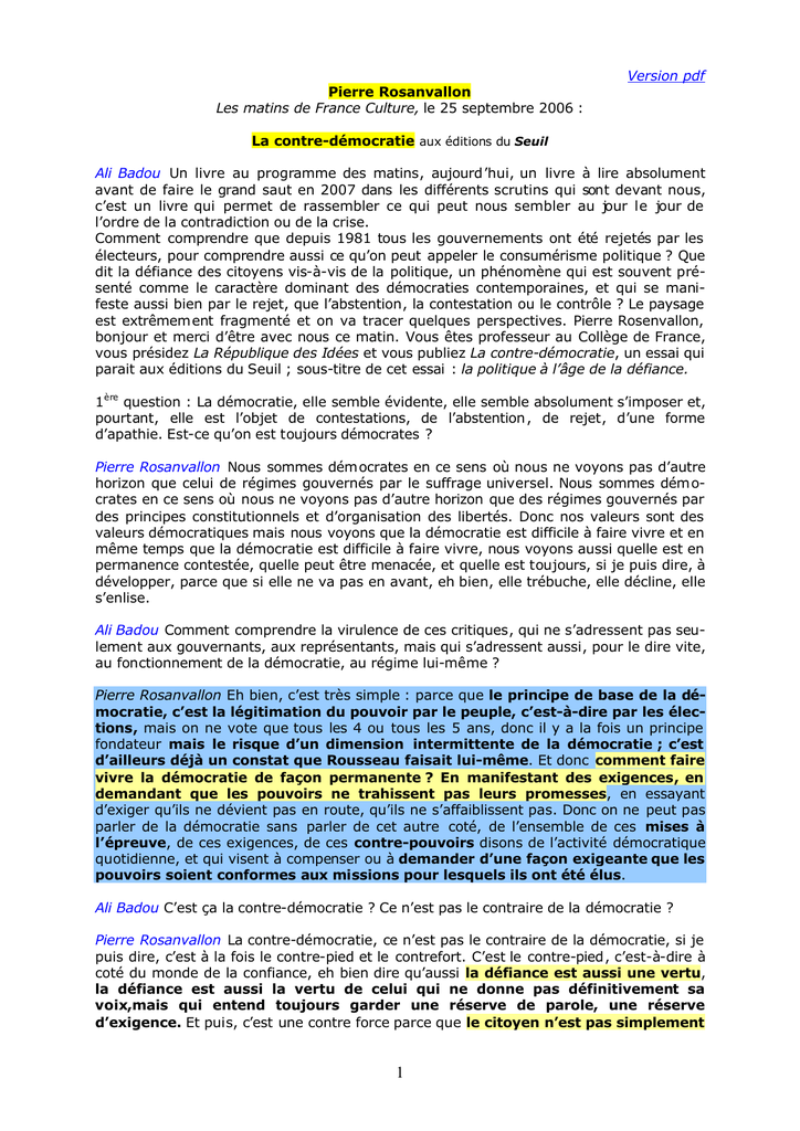 Version pdf Pierre Rosanvallon Les matins de France Culture, le 25