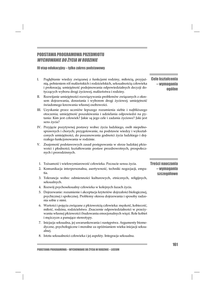 PODSTAWA PROGRAMOWA PRZEDMIOTU WYCHOWANIE DO ŻYCIA W RODZINIE IV etap edukacyjny – tylko zakres podstawowy I. Pogłębianie wiedzy związanej z funkcjami rodziny, miłością, przyjaźnią, pełnieniem ról małżeńskich i rodzicielskich, seksualnością człowieka i prokreacją; umiejętność podejmowania odpowiedzialnych decyzji dotyczących wyboru drogi życiowej, małżeństwa i rodziny. II. Rozwijanie umiejętności rozwiązywania problemów związanych z okresem dojrzewania, dorastania i wyborem drogi życiowej; umiejętność świadomego kreowania własnej osobowości. Cele kształcenia – wymagania ogólne III. Uzyskanie przez uczniów lepszego rozumienia siebie i najbliższego otoczenia; umiejętność poszukiwania i udzielania odpowiedzi na pytania: Kim jest człowiek? Jakie są jego cele i zadania życiowe? Jaki jest sens życia? IV. Przyjęcie pozytywnej postawy wobec życia ludzkiego, osób niepełnosprawnych i chorych; przygotowanie, na podstawie wiedzy i wykształconych umiejętności, do poszanowania godności życia ludzkiego i dojrzałego funkcjonowania w rodzinie. V. Znajomość podstawowych zasad postępowania w sferze ludzkiej płciowości i płodności; kształtowanie postaw prozdrowotnych, prospołecznych i prorodzinnych. 1. Tożsamość i wielowymiarowość człowieka. Poczucie sensu życia. 2. Komunikacja interpersonalna, asertywność, techniki negocjacji, empatia. 3. Tolerancja wobec odmienności kulturowych, etnicznych, religijnych, seksualnych. Treści nauczania – wymagania szczegółowe 4. Rozwój psychoseksualny człowieka w kolejnych fazach życia. 5. Dojrzewanie: rozumienie i akceptacja kryteriów dojrzałości biologicznej, psychicznej i społecznej. Problemy okresu dojrzewania i sposoby radzenia sobie z nimi. 6. Wartości i pojęcia związane z płciowością człowieka: męskość, kobiecość, miłość, rodzina, rodzicielstwo. Znaczenie odpowiedzialności w przeżywaniu własnej płciowości i budowaniu emocjonalnych więzi. Role kobiet i mężczyzn a panujące stereotypy. 7. Inicjacja seksualna, jej uwarunkowania i następstwa. Argumenty biomedyczne, psychologiczne i moralne za opóźnianiem wieku inicjacji seksualnej. 8. Istota seksualności człowieka i jej aspekty. Integracja seksualna. 161 PODSTAWA PROGRAMOWA – WYCHOWANIE DO ŻYCIA W RODZINIE – LICEUM 9. Komplementarność płci – wzajemne dopełnianie się płci w sferach fizycznej, psychicznej, emocjonalnej i społecznej. Rozumienie, akceptacja i szacunek dla osób płci odmiennej. 10. Istota, rodzaje i etapy rozwoju miłości. Różnice w przeżywaniu miłości. 11. Metody rozpoznawania płodności. 12. Metody i środki antykoncepcji. Sposoby ich działania i zasady doboru. 13. Choroby przenoszone drogą płciową i zapobieganie im. AIDS: profilaktyka, aspekt społeczny i etyczny, chory na AIDS w rodzinie. 14. Trudności w osiąganiu tożsamości płciowej, możliwości pomocy. 15. Normy zachowań seksualnych. Przemoc i przestępstwa seksualne; możliwości zapobiegania, sposoby obrony. Informacja o ośrodkach pomocy psychologicznej, medycznej i prawnej. 16. Przygotowanie do małżeństwa. Problemy wierności, zaufania i dialogu. 17. Małżeństwo: jego fazy; trudności i konflikty oraz sposoby ich rozwiązywania; wartość małżeństwa. Macierzyństwo i ojcostwo. Przygotowanie do ról rodzicielskich. Adopcja. Bezdzietność. 18. Przebieg i higiena ciąży. Rozwój prenatalny dziecka. Szkoła rodzenia, poród i naturalne karmienie. Rola rodziców w okresie oczekiwania na narodziny dziecka, w czasie porodu i po narodzinach. 19. Funkcje rodziny, ze szczególnym uwzględnieniem wychowania dzieci w rodzinie. Znaczenie prawidłowych postaw rodzicielskich dla rozwoju dziecka. Samotne rodzicielstwo. 20. Nieplanowana ciąża; sposoby szukania pomocy w sytuacjach trudnych. 21. Aborcja jako zagrożenie dla zdrowia psychicznego i fizycznego – aspekty: prawny, medyczny i etyczny. 22. Konflikty w rodzinie i ich przyczyny. Sposoby rozwiązywania konfliktów. 23. Przemoc w rodzinie. Wykorzystywanie seksualne. Profilaktyka. Możliwości uzyskiwania pomocy. 24. Zagrożenia życia społecznego: alkoholizm, narkomania, agresja, sekty, pornografia. 25. Prawodawstwo dotyczące rodziny. Zawarcie małżeństwa, separacja, rozwód. Prawa i obowiązki małżonków i rodziców, prawa dziecka. Obowiązki państwa wobec rodziny. 26. Człowiek wobec niepełnosprawności, starości, choroby, umierania i śmierci, w tym w aspekcie życia rodzinnego. 27. Poradnictwo młodzieżowe i rodzinne w Polsce. 162 EDUKACJA HISTORYCZNA I OBYWATELSKA W SZKOLE PODSTAWOWEJ, ...